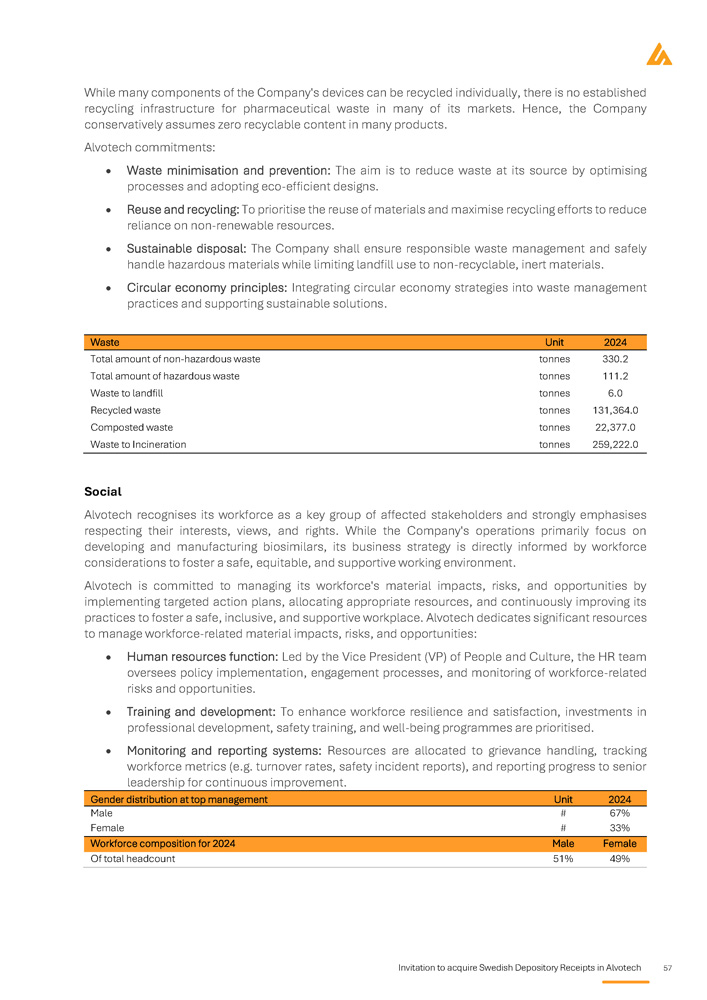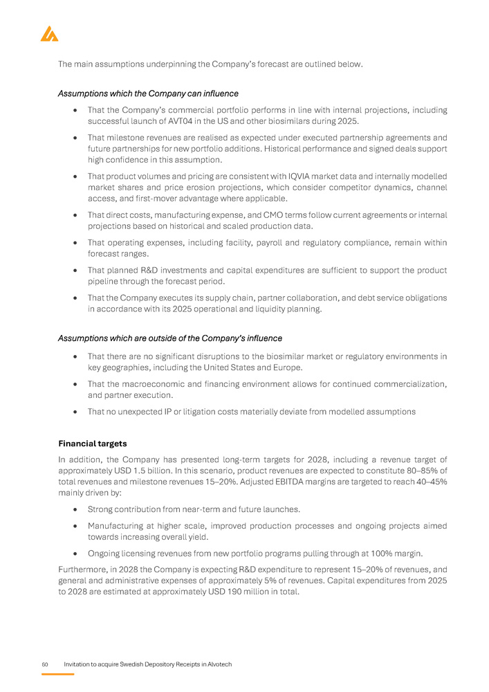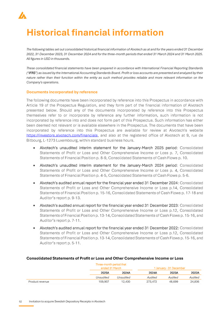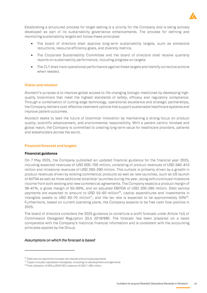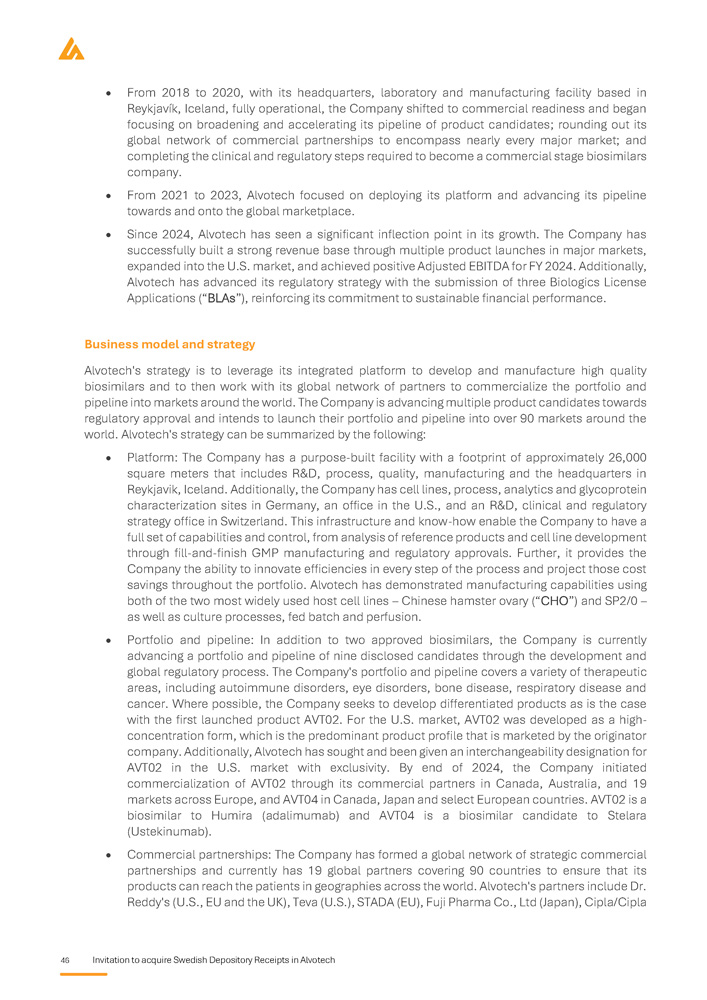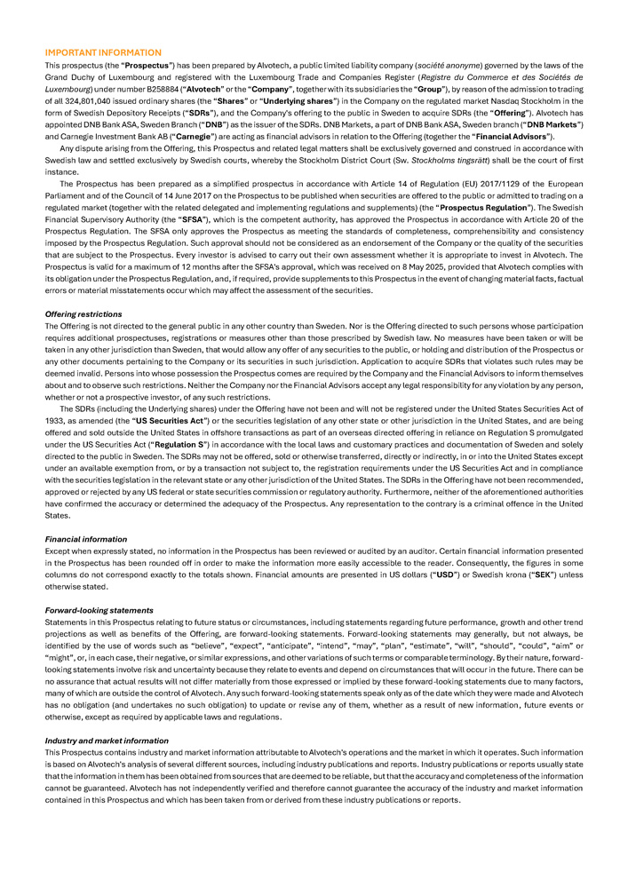 IMPORTANT INFORMATION This prospectus (the “ Prospectus ”) has been prepared by Alvotech, a public limited liability company ( société anonyme ) governed by the laws of the Grand Duchy of Luxembourg and registered with the Luxembourg Trade and Companies Register ( Registre du Commerce et des Sociétés de Luxembourg ) under number B 258884 (“ Alvotech ” or the “ Company ”, together with its subsidiaries the “ Group ”), by reason of the admission to trading of all 324 , 801 , 040 issued ordinary shares (the “ Shares ” or “ Underlying shares ”) in the Company on the regulated market Nasdaq Stockholm in the form of Swedish Depository Receipts (“ SDRs ”), and the Company's offering to the public in Sweden to acquire SDRs (the “ Offering ”) . Alvotech has appointed DNB Bank ASA, Sweden Branch (“ DNB ”) as the issuer of the SDRs . DNB Markets, a part of DNB Bank ASA, Sweden branch (“ DNB Markets ”) and Carnegie Investment Bank AB (“ Carnegie ”) are acting as financial advisors in relation to the Offering (together the “ Financial Advisors ”) . Any dispute arising from the Offering, this Prospectus and related legal matters shall be exclusively governed and construed in accordance with Swedish law and settled exclusively by Swedish courts, whereby the Stockholm District Court (Sw . Stockholms tingsrätt ) shall be the court of first instance . The Prospectus has been prepared as a simplified prospectus in accordance with Article 14 of Regulation (EU) 2017 / 1129 of the European Parliament and of the Council of 14 June 2017 on the Prospectus to be published when securities are offered to the public or admitted to trading on a regulated market (together with the related delegated and implementing regulations and supplements) (the “ Prospectus Regulation ”) . The Swedish Financial Supervisory Authority (the “ SFSA ”), which is the competent authority, has approved the Prospectus in accordance with Article 20 of the Prospectus Regulation . The SFSA only approves the Prospectus as meeting the standards of completeness, comprehensibility and consistency imposed by the Prospectus Regulation . Such approval should not be considered as an endorsement of the Company or the quality of the securities that are subject to the Prospectus . Every investor is advised to carry out their own assessment whether it is appropriate to invest in Alvotech . The Prospectus is valid for a maximum of 12 months after the SFSA's approval, which was received on 8 May 2025 , provided that Alvotech complies with its obligation under the Prospectus Regulation, and, if required, provide supplements to this Prospectus in the event of changing material facts, factual errors or material misstatements occur which may affect the assessment of the securities . Offering restrictions The Offering is not directed to the general public in any other country than Sweden . Nor is the Offering directed to such persons whose participation requires additional prospectuses, registrations or measures other than those prescribed by Swedish law . No measures have been taken or will be taken in any other jurisdiction than Sweden, that would allow any offer of any securities to the public, or holding and distribution of the Prospectus or any other documents pertaining to the Company or its securities in such jurisdiction . Application to acquire SDRs that violates such rules may be deemed invalid . Persons into whose possession the Prospectus comes are required by the Company and the Financial Advisors to inform themselves about and to observe such restrictions . Neither the Company nor the Financial Advisors accept any legal responsibility for any violation by any person, whether or not a prospective investor, of any such restrictions . The SDRs (including the Underlying shares) under the Offering have not been and will not be registered under the United States Securities Act of 1933 , as amended (the “ US Securities Act ”) or the securities legislation of any other state or other jurisdiction in the United States, and are being offered and sold outside the United States in offshore transactions as part of an overseas directed offering in reliance on Regulation S promulgated under the US Securities Act (“ Regulation S ”) in accordance with the local laws and customary practices and documentation of Sweden and solely directed to the public in Sweden . The SDRs may not be offered, sold or otherwise transferred, directly or indirectly, in or into the United States except under an available exemption from, or by a transaction not subject to, the registration requirements under the US Securities Act and in compliance with the securities legislation in the relevant state or any other jurisdiction of the United States . The SDRs in the Offering have not been recommended, approved or rejected by any US federal or state securities commission or regulatory authority . Furthermore, neither of the aforementioned authorities have confirmed the accuracy or determined the adequacy of the Prospectus . Any representation to the contrary is a criminal offence in the United States . Financial information Except when expressly stated, no information in the Prospectus has been reviewed or audited by an auditor. Certain financial information presented in the Prospectus has been rounded off in order to make the information more easily accessible to the reader. Consequently, the figures in some columns do not correspond exactly to the totals shown. Financial amounts are presented in US dollars (“ USD ”) or Swedish krona (“ SEK ”) unless otherwise stated. Forward - looking statements Statements in this Prospectus relating to future status or circumstances, including statements regarding future performance, growth and other trend projections as well as benefits of the Offering, are forward - looking statements . Forward - looking statements may generally, but not always, be identified by the use of wor