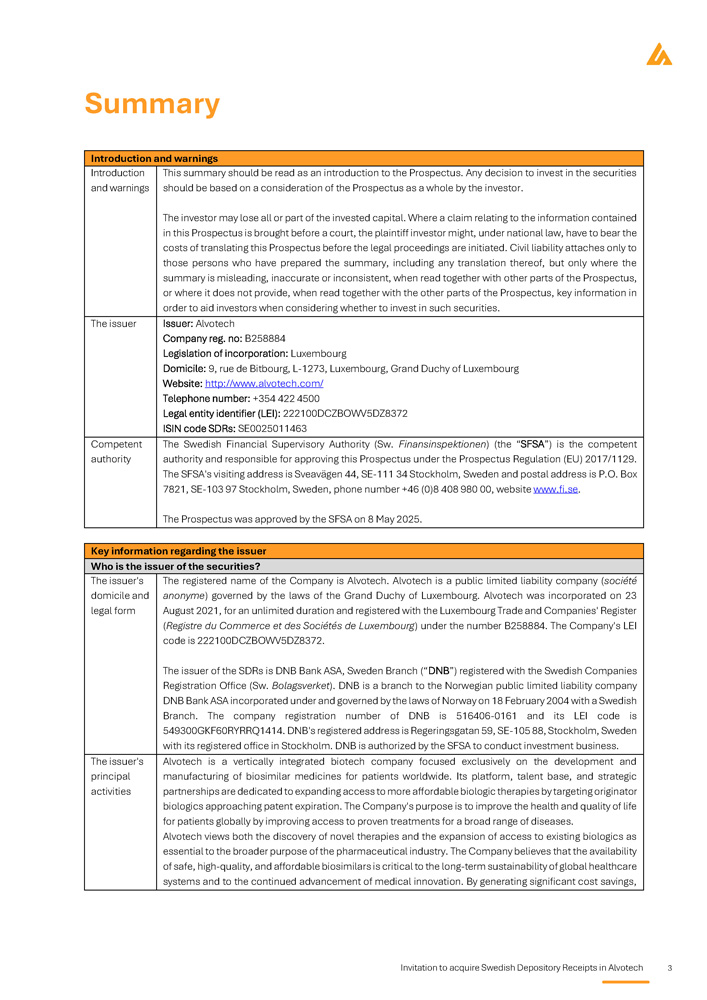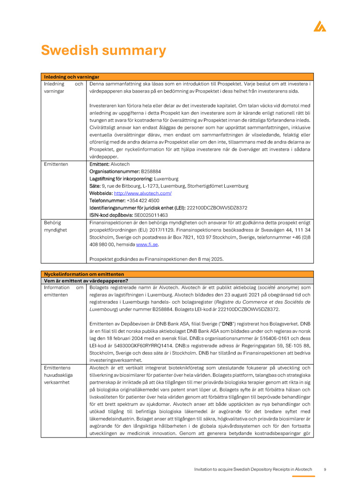 Invitation to acquire Swedish Depository Receipts in Alvotech 9 Swedish summary Inledning och varningar Denna sammanfattning ska läsas som en introduktion till Prospektet . Varje beslut om att investera i värdepapperen ska baseras på en bedömning av Prospektet i dess helhet från investerarens sida . Investeraren kan förlora hela eller delar av det investerade kapitalet . Om talan väcks vid domstol med anledning av uppgifterna i detta Prospekt kan den investerare som är kärande enligt nationell rätt bli tvungen att svara för kostnaderna för översättning av Prospektet innan de rättsliga förfarandena inleds . Civilrättsligt ansvar kan endast åläggas de personer som har upprättat sammanfattningen, inklusive eventuella översättningar därav, men endast om sammanfattningen är vilseledande, felaktig eller oförenlig med de andra delarna av Prospektet eller om den inte, tillsammans med de andra delarna av Prospektet, ger nyckelinformation för att hjälpa investerare när de överväger att investera i sådana värdepapper . Inledning och varningar Emittent: Alvotech Organisationsnummer: B258884 Lagstiftning för inkorporering: Luxemburg Säte: 9, rue de Bitbourg, L - 1273, Luxemburg, Storhertigdömet Luxemburg Webbsida: http://www.alvotech.com/ Telefonnummer: +354 422 4500 Identifieringsnummer för juridisk enhet (LEI): 222100DCZBOWV5DZ8372 ISIN - kod depåbevis: SE0025011463 Emittenten Finansinspektionen är den behöriga myndigheten och ansvarar för att godkänna detta prospekt enligt prospektförordningen (EU) 2017/1129. Finansinspektionens besöksadress är Sveavägen 44, 111 34 Stockholm, Sverige och postadress är Box 7821, 103 97 Stockholm, Sverige, telefonnummer +46 (0)8 408 980 00, hemsida www.fi.se . Prospektet godkändes av Finansinspektionen den 8 maj 2025. Behörig myndighet Nyckelinformation om emittenten Vem är emittent av värdepapperen? Bolagets registrerade namn är Alvotech . Alvotech är ett publikt aktiebolag ( société anonyme ) som regleras av lagstiftningen i Luxemburg . Alvotech bildades den 23 augusti 2021 på obegränsad tid och registrerades i Luxemburgs handels - och bolagsregister ( Registre du Commerce et des Sociétés de Luxembourg ) under nummer B 258884 . Bolagets LEI - kod är 222100 DCZBOWV 5 DZ 8372 . Emittenten av Depåbevisen är DNB Bank ASA, filial Sverige ("DNB") registrerat hos Bolagsverket . DNB är en filial till det norska publika aktiebolaget DNB Bank ASA som bildades under och regleras av norsk lag den 18 februari 2004 med en svensk filial . DNB : s organisationsnummer är 516406 - 0161 och dess LEI - kod är 549300 GKF 60 RYRRQ 1414 . DNB : s registrerade adress är Regeringsgatan 59 , SE - 105 88 , Stockholm, Sverige och dess säte är i Stockholm . DNB har tillstånd av Finansinspektionen att bedriva investeringsverksamhet . Information om emittenten Alvotech är ett vertikalt integrerat bioteknikföretag som uteslutande fokuserar på utveckling och tillverkning av biosimilarer för patienter över hela världen . Bolagets plattform, talangbas och strategiska partnerskap är inriktade på att öka tillgången till mer prisvärda biologiska terapier genom att rikta in sig på biologiska originalläkemedel vars patent snart löper ut . Bolagets syfte är att förbättra hälsan och livskvaliteten för patienter över hela världen genom att förbättra tillgången till beprövade behandlingar för ett brett spektrum av sjukdomar . Alvotech anser att både upptäckten av nya behandlingar och utökad tillgång till befintliga biologiska läkemedel är avgörande för det bredare syftet med läkemedelsindustrin . Bolaget anser att tillgången till säkra, högkvalitativa och prisvärda biosimilarer är avgörande för den långsiktiga hållbarheten i de globala sjukvårdssystemen och för den fortsatta utvecklingen av medicinsk innovation . Genom att generera betydande kostnadsbesparingar gör Emittentens huvudsakliga verksamhet