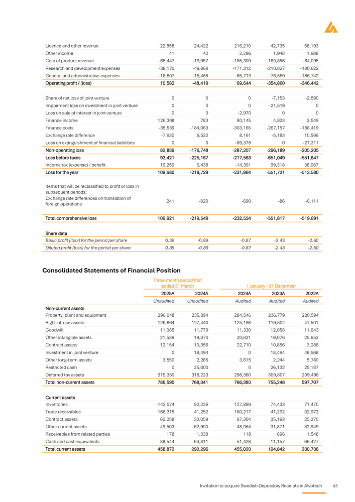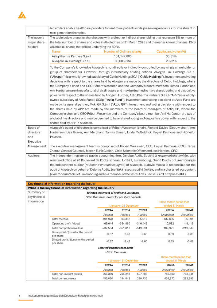 4 Invitation to acquire Swedish Depository Receipts in Alvotech biosimilars enable healthcare providers to treat more patients while preserving resources for investment in next - generation therapies. The table below presents shareholders with a direct or indirect shareholding that represent 5% or more of the total number of shares and votes in Alvotech as of 31 March 2025 and thereafter known changes. DNB will hold all shares that will be underlying the SDRs. Name Number of Ordinary shares Capital and votes (%) Aztiq Pharma Partners S.à r.l 101,147,803 33.51% Alvogen Lux Holdings S . à r . l 90 , 005 , 334 29 . 82 % To the Company’s knowledge Alvotech is not directly or indirectly controlled by any single shareholder or group of shareholders . However, through intermediary holding entities, Alvogen Lux Holdings S . à r . l (“Alvogen”) is a wholly - owned subsidiary of Celtic Holdings SCA (“Celtic Holdings”) . Investment and voting decisions with respect to the shares held by Alvogen are made by the directors of Celtic Holdings, where the Company’s chair and CEO Róbert Wessman and the Company’s board members Tomas Ekman and Árni Harðarson are three of a total of six directors and may be deemed to have shared voting and dispositive power with respect to the shares held by Alvogen . Further, Aztiq Pharma Partners S . à r . l (“APP”) is a wholly - owned subsidiary of Aztiq Fund I SCSp (“Aztiq Fund”) . Investment and voting decisions at Aztiq Fund are made by its general partner, Floki GP S . à r . l (“Aztiq GP”) . Investment and voting decisions with respect to the shares held by APP are made by the members of the board of managers of Aztiq GP, where the Company’s chair and CEO Róbert Wessman and the Company’s board member Árni Harðarson are two of a total of five directors and may be deemed to have shared voting and dispositive power with respect to the shares held by APP in Alvotech . The issuer's major share - holders Alvotech's board of directors is comprised of Róbert Wessman (chair), Richard Davies (Deputy chair), Árni Harðarson, Lisa Graver, Ann Merchant, Tomas Ekman, Linda McGoldrick, Faysal Kalmoua and Hjörleifur Pálsson. The executive management team is comprised of Róbert Wessman, CEO, Faysal Kalmoua, COO, Tanya Zharov, General Counsel, Joseph E. McClellan, Chief Scientific Officer and Joel Morales, CFO. Board of directors and Executive Management The independent registered public accounting firm, Deloitte Audit, Société à responsabilité limitée , with registered office at 20 Boulevard de Kockelscheuer, L - 1821, Luxembourg, Grand Duchy of Luxembourg is the independent auditor ( réviseur d'entreprises agréé ) of Alvotech. Ludovic Mosca is responsible for the audit of Alvotech on behalf of Deloitte Audit, Société à responsabilité limitée , and is a chartered accountant ( expert - comptable ) of Luxembourg and is a member of the Institut des Réviseurs d'Entreprises (IRE). Auditors Key financial information regarding the issuer What is the key financial information regarding the issuer? Selected statement of Profit and Loss items Summary of key financial information USD in thousands, except for per share amounts Three - month period that ended 31 March 1 January - 31 December 2025A 2022A 2023A 2024A Unaudited Audited Audited Audited 132,806 85,017 93,382 491,978 Total revenue 10,582 - 346,442 - 354,860 69,644 Operating profit / (loss) 109,921 - 519,691 - 551,817 - 232,554 Total comprehensive loss 0.39 - 2.60 - 2.43 - 0.87 Basic profit / (loss) for the period per share 0.35 - 2.60 - 2.43 - 0.87 Diluted profit / (loss) for the period per share Selected balance sheet items USD in thousands Three - month period ended 31 March 1 January - 31 December 2025A 2022A 2023A 2024A Unaudited Audited Audited Audited 786,590 597,707 755,248 766,380 Total non - current assets 458,872 230,736 194,842 455,020 Total current assets