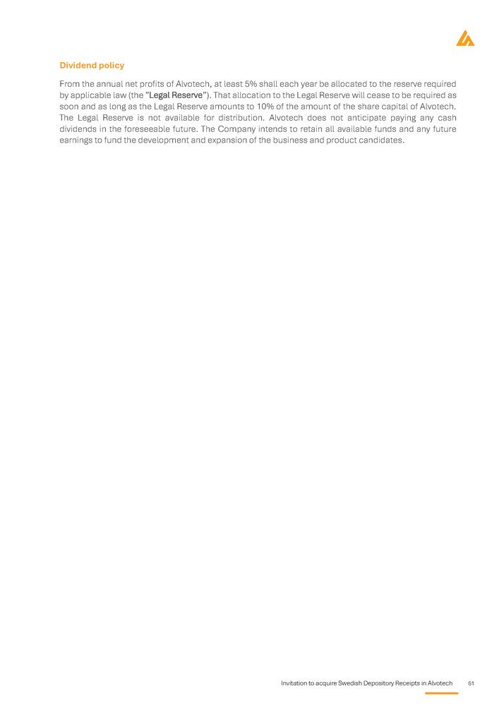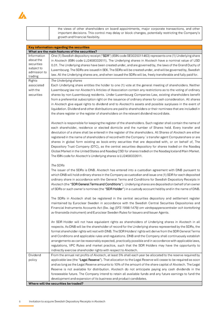 6 Invitation to acquire Swedish Depository Receipts in Alvotech the views of other shareholders on board appointments, major corporate transactions, and other important decisions. This control may delay or block changes, potentially restricting the Company’s growth and financial flexibility. Key information regarding the securities What are the main features of the securities? One (1) Swedish depository receipt (“SDR”) (ISIN code SE0025011463) represents one (1) Underlying share in Alvotech (ISIN code LU2458332611). The Underlying shares in Alvotech have a nominal value of USD 0.01. The Underlying shares have been created under, and are governed by, the laws of the Grand Duchy of Luxembourg. The SDRs are issued in SEK. The SDRs will be created under, and will be governed by, Swedish law. All the Underlying shares are, and when issued the SDRs will be, freely transferable and fully paid for. Information about the securities subject to admission to trading The Underlying shares Each Underlying share entitles the holder to one ( 1 ) vote at the general meeting of shareholders . Neither Luxembourg law nor Alvotech's Articles of Association contain any restrictions as to the voting of ordinary shares by non - Luxembourg residents . Under Luxembourg Companies Law, existing shareholders benefit from a preferential subscription right on the issuance of ordinary shares for cash consideration . All shares in Alvotech give equal rights to dividend and to Alvotech's assets and possible surpluses in the event of liquidation . Dividend and other distributions are paid to shareholders or their nominees that are included in the share register or the register of shareholders on the relevant dividend record date . Alvotech is responsible for keeping the register of the shareholders . Such register shall contain the name of each shareholder, residence or elected domicile and the number of Shares held . Every transfer and devolution of a share shall be entered in the register of the shareholders . All Shares of Alvotech are either registered in the name of shareholders of record with the Company Dz s transfer agent Computershare or are shares in global form existing as book - entry securities that are deposited with, or on behalf of, The Depository Trust Company (DTC), as the central securities depository for shares traded on the Nasdaq Global Market in the United States and Nasdaq CSD for shares traded on the Nasdaq Iceland Main Market . The ISIN code for Alvotech's Underlying shares is LU 2458332611 . The SDRs The issuer of the SDRs is DNB . Alvotech has entered into a custodian agreement with DNB pursuant to which DNB will hold ordinary shares in the Company as custodian and issue one ( 1 ) SDR for each deposited ordinary share in accordance with the General Terms and Conditions for Swedish Depository Receipts in Alvotech (the “SDR General Terms and Conditions”) . Underlying shares are deposited on behalf of an owner of SDRs or such owner's nominee (the “SDR Holder”) in a custody account held by and in the name of DNB . The SDRs in Alvotech shall be registered in the central securities depository and settlement register maintained by Euroclear Sweden in accordance with the Swedish Central Securities Depositories and Financial Instruments Accounts Act (Sw . lag (SFS 1998 : 1479 ) om värdepapperscentraler och kontoföring av finansiella instrument ) and Euroclear Sweden Rules for Issuers and Issuer Agents . An SDR Holder will not have equivalent rights as shareholders of Underlying shares in Alvotech in all respects . As DNB will be the shareholder of record for the Underlying shares represented by the SDRs, the formal shareholder rights will rest with DNB . The SDR Holders' rights will derive from the SDR General Terms and Conditions and applicable rules and regulations . DNB and the Company shall continuously establish arrangements as can be reasonably expected, practically possible and in accordance with applicable laws, regulations, VPC Rules and market practice, such that the SDR Holders may have the opportunity to indirectly exercise shareholder rights with respect to Alvotech . Rights associated with the securities From the annual net profits of Alvotech, at least 5 % shall each year be allocated to the reserve required by applicable law (the “Legal Reserve”) . That allocation to the Legal Reserve will cease to be required as soon and as long as the Legal Reserve amounts to 10 % of the amount of the share capital of Alvotech . The Legal Reserve is not available for distribution . Alvotech do not anticipate paying any cash dividends in the foreseeable future . The Company intend to retain all available funds and any future earnings to fund the development and expansion of its business and product candidates . Dividend policy Where will the securities be traded?
