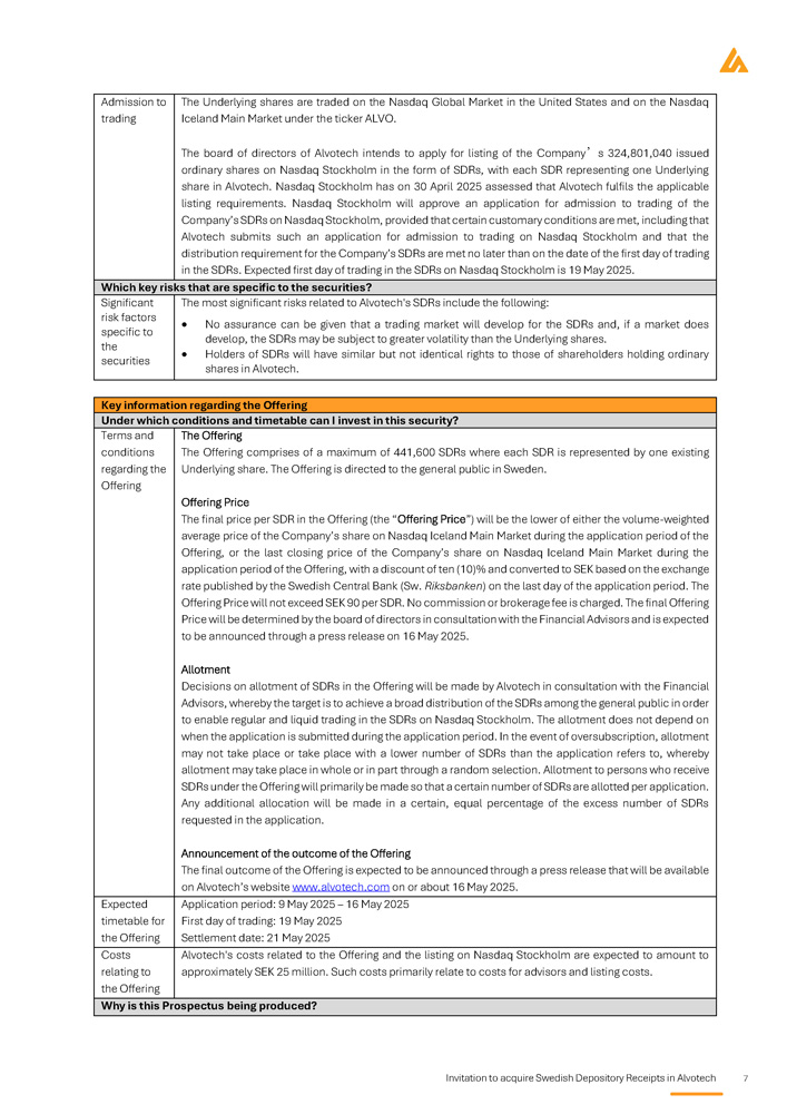 Invitation to acquire Swedish Depository Receipts in Alvotech 7 The Underlying shares are traded on the Nasdaq Global Market in the United States and on the Nasdaq Iceland Main Market under the ticker ALVO . The board of directors of Alvotech intends to apply for listing of the Company ’ s 324 , 801 , 040 issued ordinary shares on Nasdaq Stockholm in the form of SDRs, with each SDR representing one Underlying share in Alvotech . Nasdaq Stockholm has on 30 April 2025 assessed that Alvotech fulfils the applicable listing requirements . Nasdaq Stockholm will approve an application for admission to trading of the Company’s SDRs on Nasdaq Stockholm, provided that certain customary conditions are met, including that Alvotech submits such an application for admission to trading on Nasdaq Stockholm and that the distribution requirement for the Company’s SDRs are met no later than on the date of the first day of trading in the SDRs . Expected first day of trading in the SDRs on Nasdaq Stockholm is 19 May 2025 . Admission to trading Which key risks that are specific to the securities? The most significant risks related to Alvotech's SDRs include the following: No assurance can be given that a trading market will develop for the SDRs and, if a market does develop, the SDRs may be subject to greater volatility than the Underlying shares. Holders of SDRs will have similar but not identical rights to those of shareholders holding ordinary shares in Alvotech. Significant risk factors specific to the securities Key information regarding the Offering Under which conditions and timetable can I invest in this security? The Offering The Offering comprises of a maximum of 441 , 600 SDRs where each SDR is represented by one existing Underlying share . The Offering is directed to the general public in Sweden . Offering Price The final price per SDR in the Offering (the “Offering Price”) will be the lower of either the volume - weighted average price of the Company’s share on Nasdaq Iceland Main Market during the application period of the Offering, or the last closing price of the Company’s share on Nasdaq Iceland Main Market during the application period of the Offering, with a discount of ten ( 10 ) % and converted to SEK based on the exchange rate published by the Swedish Central Bank (Sw . Riksbanken ) on the last day of the application period . The Offering Price will not exceed SEK 90 per SDR . No commission or brokerage fee is charged . The final Offering Price will be determined by the board of directors in consultation with the Financial Advisors and is expected to be announced through a press release on 16 May 2025 . Allotment Decisions on allotment of SDRs in the Offering will be made by Alvotech in consultation with the Financial Advisors, whereby the target is to achieve a broad distribution of the SDRs among the general public in order to enable regular and liquid trading in the SDRs on Nasdaq Stockholm . The allotment does not depend on when the application is submitted during the application period . In the event of oversubscription, allotment may not take place or take place with a lower number of SDRs than the application refers to, whereby allotment may take place in whole or in part through a random selection . Allotment to persons who receive SDRs under the Offering will primarily be made so that a certain number of SDRs are allotted per application . Any additional allocation will be made in a certain, equal percentage of the excess number of SDRs requested in the application . Announcement of the outcome of the Offering The final outcome of the Offering is expected to be announced through a press release that will be available on Alvotech’s website www . alvotech . com on or about 16 May 2025 . Terms and conditions regarding the Offering Application period: 9 May 2025 – 16 May 2025 First day of trading: 19 May 2025 Settlement date: 21 May 2025 Expected timetable for the Offering Alvotech's costs related to the Offering and the listing on Nasdaq Stockholm are expected to amount to approximately SEK 25 million. Such costs primarily relate to costs for advisors and listing costs. Costs relating to the Offering Why is this Prospectus being produced?