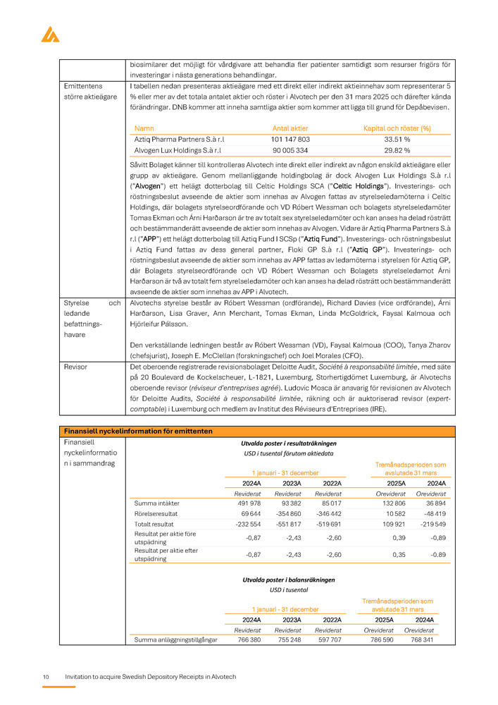 10 Invitation to acquire Swedish Depository Receipts in Alvotech biosimilarer det möjligt för vårdgivare att behandla fler patienter samtidigt som resurser frigörs för investeringar i nästa generations behandlingar. I tabellen nedan presenteras aktieägare med ett direkt eller indirekt aktieinnehav som representerar 5 % eller mer av det totala antalet aktier och röster i Alvotech per den 31 mars 2025 och därefter kända förändringar . DNB kommer att inneha samtliga aktier som kommer att ligga till grund för Depåbevisen . Namn Antal aktier Kapital och röster ( % ) Aztiq Pharma Partners S . à r . l 101 147 803 33 . 51 % Alvogen Lux Holdings S . à r . l 90 005 334 29 . 82 % Såvitt Bolaget känner till kontrolleras Alvotech inte direkt eller indirekt av någon enskild aktieägare eller grupp av aktieägare . Genom mellanliggande holdingbolag är dock Alvogen Lux Holdings S . à r . l (”Alvogen”) ett helägt dotterbolag till Celtic Holdings SCA (”Celtic Holdings”) . Investerings - och röstningsbeslut avseende de aktier som innehas av Alvogen fattas av styrelseledamöterna i Celtic Holdings, där bolagets styrelseordförande och VD Róbert Wessman och bolagets styrelseledamöter Tomas Ekman och Árni Harðarson är tre av totalt sex styrelseledamöter och kan anses ha delad rösträtt och bestämmanderätt avseende de aktier som innehas av Alvogen . Vidare är Aztiq Pharma Partners S . à r . l (”APP”) ett helägt dotterbolag till Aztiq Fund I SCSp (”Aztiq Fund”) . Investerings - och röstningsbeslut i Aztiq Fund fattas av dess general partner, Floki GP S . à r . l (”Aztiq GP”) . Investerings - och röstningsbeslut avseende de aktier som innehas av APP fattas av ledamöterna i styrelsen för Aztiq GP, där Bolagets styrelseordförande och VD Róbert Wessman och Bolagets styrelseledamot Árni Harðarson är två av totalt fem styrelseledamöter och kan anses ha delad rösträtt och bestämmanderätt avseende de aktier som innehas av APP i Alvotech . Emittentens större aktieägare Alvotechs styrelse består av Róbert Wessman (ordförande), Richard Davies (vice ordförande), Árni Harðarson, Lisa Graver, Ann Merchant, Tomas Ekman, Linda McGoldrick, Faysal Kalmoua och Hjörleifur Pálsson. Den verkställande ledningen består av Róbert Wessman (VD), Faysal Kalmoua (COO), Tanya Zharov (chefsjurist), Joseph E. McClellan (forskningschef) och Joel Morales (CFO). Styrelse och ledande befattnings - havare Det oberoende registrerade revisionsbolaget Deloitte Audit, Société à responsabilité limitée , med säte på 20 Boulevard de Kockelscheuer, L - 1821 , Luxemburg, Storhertigdömet Luxemburg, är Alvotechs oberoende revisor ( réviseur d'entreprises agréé ) . Ludovic Mosca är ansvarig för revisionen av Alvotech för Deloitte Audits, Société à responsabilité limitée , räkning och är auktoriserad revisor ( expert - comptable ) i Luxemburg och medlem av Institut des Réviseurs d'Entreprises (IRE) . Revisor Finansiell nyckelinformation för emittenten Utvalda poster i resultaträkningen USD i tusental förutom aktiedata Tremånadsperioden som 1 januari - 31 december avslutade 31 mars 2024A 2023A 2022A 2025A 2024A Reviderat Reviderat Reviderat Oreviderat Oreviderat Summa intäkter 491 978 93 382 85 017 132 806 36 894 Rörelseresultat 69 644 - 354 860 - 346 442 10 582 - 48 419 Totalt resultat - 232 554 - 551 817 - 519 691 109 921 - 219 549 Resultat per aktie före - 0,87 - 2,43 - 2,60 0,39 - 0,89 utspädning Resultat per aktie efter - 0,87 - 2,43 - 2,60 0,35 - 0.89 utspädning Utvalda poster i balansräkningen USD i tusental Tremånadsperioden som 1 januari - 31 december avslutade 31 mars 2024A 2023A 2022A 2025A 2024A Reviderat Reviderat Reviderat Oreviderat Oreviderat Summa anläggningstillgångar 766 380 755 248 597 707 786 590 768 341 Finansiell nyckelinformatio n i sammandrag