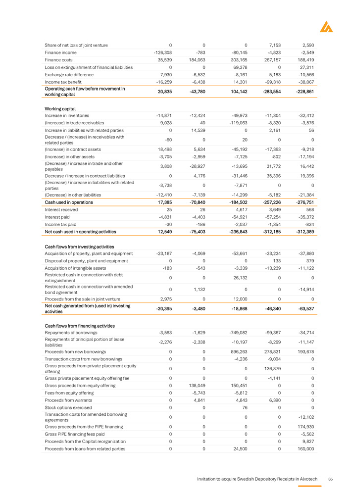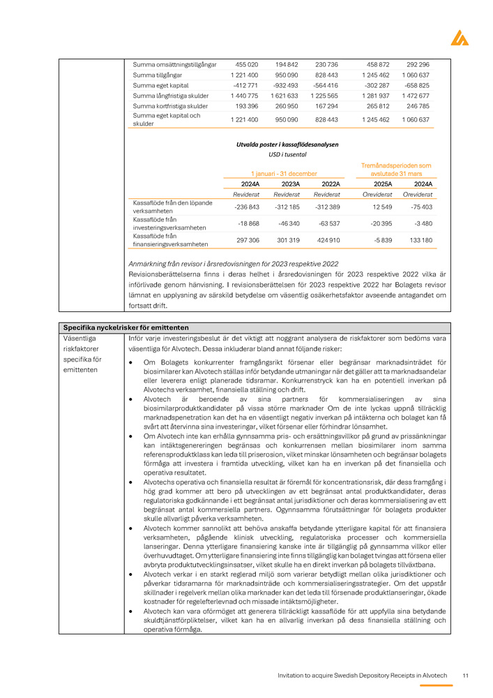 Invitation to acquire Swedish Depository Receipts in Alvotech 11 i 292 458 872 230 736 194 842 455 020 Summa omsättningstillgångar 1 060 1 245 462 828 443 950 090 1 221 400 Summa tillgångar - 658 - 302 287 - 564 416 - 932 493 - 412 771 Summa eget kapital 1 472 1 281 937 1 225 565 1 621 633 1 440 775 Summa långfristiga skulder 246 265 812 167 294 260 950 193 396 Summa kortfristiga skulder 1 060 erioden e 31 mars 2024A Oreviderat - 75 - 133 2022 Bolagets antagandet 1 245 462 Tremånadsp avslutad 2025A Oreviderat 12 549 - 20 395 - 5 839 23 respektive tive 2022 har tor avseende 828 443 desanalysen l mber 2022A Reviderat - 312 389 - 63 537 424 910 ktive 2022 isningen för 20 r 2023 respek osäkerhetsfak 950 090 oster i kassaflö USD i tusenta uari - 31 dece 2023A Reviderat - 312 185 - 46 340 301 319 ör 2023 respe et i årsredov rättelsen fö om väsentlig 1 221 400 Utvalda p 1 jan 2024A Reviderat - 236 843 - 18 868 297 306 dovisningen f deras helh I revisionsbe ild betydelse Summa eget kapital och skulder Kassaflöde från den löpande verksamheten Kassaflöde från investeringsverksamheten Kassaflöde från finansieringsverksamheten Anmärkning från revisor i årsre Revisionsberättelserna finns införlivade genom hänvisning. lämnat en upplysning av särsk fortsatt drift. Specifika nyckelrisker för emittenten Inför varje investeringsbeslut är det viktigt att noggrant analysera de riskfaktorer som bedöms vara Väsentliga väsentliga för Alvotech. Dessa inkluderar bland annat följande risker: riskfaktorer Om Bolagets konkurrenter framgångsrikt försenar eller begränsar marknadsinträdet för biosimilarer kan Alvotech ställas inför betydande utmaningar när det gäller att ta marknadsandelar eller leverera enligt planerade tidsramar . Konkurrenstryck kan ha en potentiell inverkan på Alvotechs verksamhet, finansiella ställning och drift . Alvotech är beroende av sina partners för kommersialiseringen av sina biosimilarproduktkandidater på vissa större marknader Om de inte lyckas uppnå tillräcklig marknadspenetration kan det ha en väsentligt negativ inverkan på intäkterna och bolaget kan få svårt att återvinna sina investeringar, vilket försenar eller förhindrar lönsamhet . Om Alvotech inte kan erhålla gynnsamma pris - och ersättningsvillkor på grund av prissänkningar kan intäktsgenereringen begränsas och konkurrensen mellan biosimilarer inom samma referensproduktklass kan leda till priserosion, vilket minskar lönsamheten och begränsar bolagets förmåga att investera i framtida utveckling, vilket kan ha en inverkan på det finansiella och operativa resultatet . Alvotechs operativa och finansiella resultat är föremål för koncentrationsrisk, där dess framgång i hög grad kommer att bero på utvecklingen av ett begränsat antal produktkandidater, deras regulatoriska godkännande i ett begränsat antal jurisdiktioner och deras kommersialisering av ett begränsat antal kommersiella partners . Ogynnsamma förutsättningar för bolagets produkter skulle allvarligt påverka verksamheten . Alvotech kommer sannolikt att behöva anskaffa betydande ytterligare kapital för att finansiera verksamheten, pågående klinisk utveckling, regulatoriska processer och kommersiella lanseringar . Denna ytterligare finansiering kanske inte är tillgänglig på gynnsamma villkor eller överhuvudtaget . Om ytterligare finansiering inte finns tillgänglig kan bolaget tvingas att försena eller avbryta produktutvecklingsinsatser, vilket skulle ha en direkt inverkan på bolagets tillväxtbana . Alvotech verkar i en starkt reglerad miljö som varierar betydligt mellan olika jurisdiktioner och påverkar tidsramarna för marknadsinträde och kommersialiseringsstrategier . Om det uppstår skillnader i regelverk mellan olika marknader kan det leda till försenade produktlanseringar, ökade kostnader för regelefterlevnad och missade intäktsmöjligheter . Alvotech kan vara oförmöget att generera tillräckligt kassaflöde för att uppfylla sina betydande skuldtjänstförpliktelser, vilket kan ha en allvarlig inverkan på dess finansiella ställning och operativa förmåga . specifika för emittenten