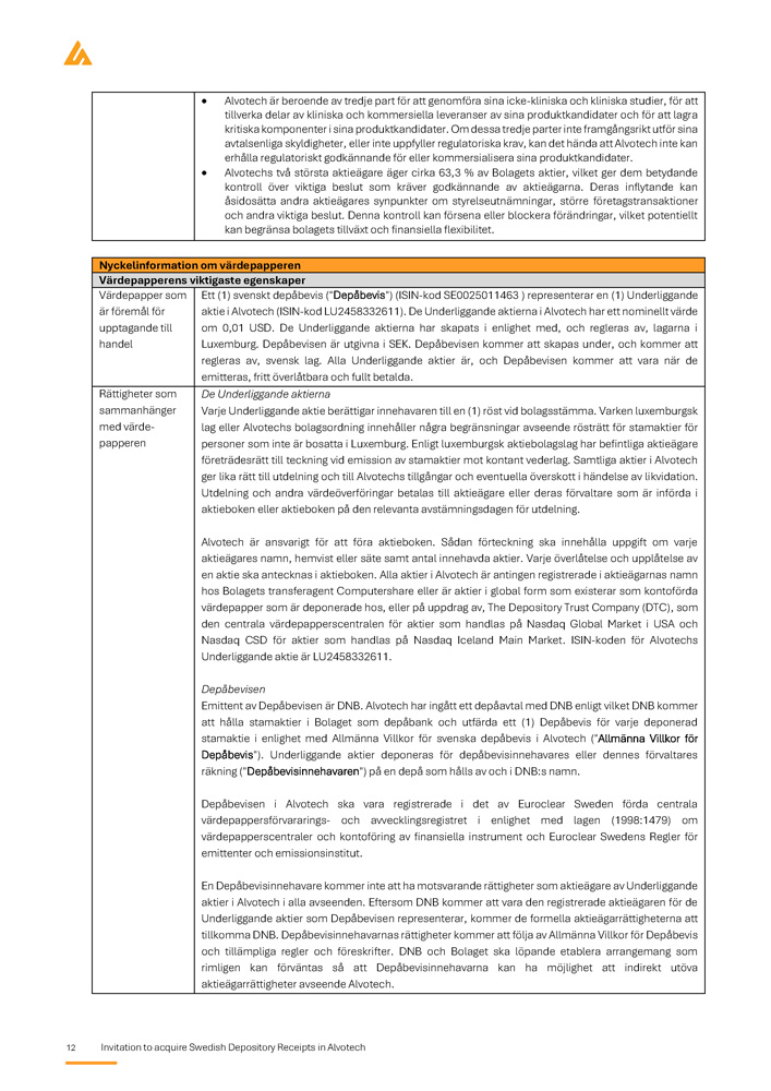 12 Invitation to acquire Swedish Depository Receipts in Alvotech Alvotech är beroende av tredje part för att genomföra sina icke - kliniska och kliniska studier, för att tillverka delar av kliniska och kommersiella leveranser av sina produktkandidater och för att lagra kritiska komponenter i sina produktkandidater . Om dessa tredje parter inte framgångsrikt utför sina avtalsenliga skyldigheter, eller inte uppfyller regulatoriska krav, kan det hända att Alvotech inte kan erhålla regulatoriskt godkännande för eller kommersialisera sina produktkandidater . Alvotechs två största aktieägare äger cirka 63 , 3 % av Bolagets aktier, vilket ger dem betydande kontroll över viktiga beslut som kräver godkännande av aktieägarna . Deras inflytande kan åsidosätta andra aktieägares synpunkter om styrelseutnämningar, större företagstransaktioner och andra viktiga beslut . Denna kontroll kan försena eller blockera förändringar, vilket potentiellt kan begränsa bolagets tillväxt och finansiella flexibilitet . Nyckelinformation om värdepapperen Värdepapperens viktigaste egenskaper Ett ( 1 ) svenskt depåbevis ("Depåbevis") (ISIN - kod SE 0025011463 ) representerar en ( 1 ) Underliggande aktie i Alvotech (ISIN - kod LU 2458332611 ) . De Underliggande aktierna i Alvotech har ett nominellt värde om 0 , 01 USD . De Underliggande aktierna har skapats i enlighet med, och regleras av, lagarna i Luxemburg . Depåbevisen är utgivna i SEK . Depåbevisen kommer att skapas under, och kommer att regleras av, svensk lag . Alla Underliggande aktier är, och Depåbevisen kommer att vara när de emitteras, fritt överlåtbara och fullt betalda . Värdepapper som är föremål för upptagande till handel De Underliggande aktierna Varje Underliggande aktie berättigar innehavaren till en ( 1 ) röst vid bolagsstämma . Varken luxemburgsk lag eller Alvotechs bolagsordning innehåller några begränsningar avseende rösträtt för stamaktier för personer som inte är bosatta i Luxemburg . Enligt luxemburgsk aktiebolagslag har befintliga aktieägare företrädesrätt till teckning vid emission av stamaktier mot kontant vederlag . Samtliga aktier i Alvotech ger lika rätt till utdelning och till Alvotechs tillgångar och eventuella överskott i händelse av likvidation . Utdelning och andra värdeöverföringar betalas till aktieägare eller deras förvaltare som är införda i aktieboken eller aktieboken på den relevanta avstämningsdagen för utdelning . Alvotech är ansvarigt för att föra aktieboken . Sådan förteckning ska innehålla uppgift om varje aktieägares namn, hemvist eller säte samt antal innehavda aktier . Varje överlåtelse och upplåtelse av en aktie ska antecknas i aktieboken . Alla aktier i Alvotech är antingen registrerade i aktieägarnas namn hos Bolagets transferagent Computershare eller är aktier i global form som existerar som kontoförda värdepapper som är deponerade hos, eller på uppdrag av, The Depository Trust Company (DTC), som den centrala värdepapperscentralen för aktier som handlas på Nasdaq Global Market i USA och Nasdaq CSD för aktier som handlas på Nasdaq Iceland Main Market . ISIN - koden för Alvotechs Underliggande aktie är LU 2458332611 . Depåbevisen Emittent av Depåbevisen är DNB. Alvotech har ingått ett depåavtal med DNB enligt vilket DNB kommer att hålla stamaktier i Bolaget som depåbank och utfärda ett ( 1 ) Depåbevis för varje deponerad stamaktie i enlighet med Allmänna Villkor för svenska depåbevis i Alvotech ("Allmänna Villkor för Depåbevis") . Underliggande aktier deponeras för depåbevisinnehavares eller dennes förvaltares räkning ("Depåbevisinnehavaren") på en depå som hålls av och i DNB : s namn . Depåbevisen i Alvotech ska vara registrerade i det av Euroclear Sweden förda centrala värdepappersförvararings - och avvecklingsregistret i enlighet med lagen ( 1998 : 1479 ) om värdepapperscentraler och kontoföring av finansiella instrument och Euroclear Swedens Regler för emittenter och emissionsinstitut . En Depåbevisinnehavare kommer inte att ha motsvarande rättigheter som aktieägare av Underliggande aktier i Alvotech i alla avseenden . Eftersom DNB kommer att vara den registrerade aktieägaren för de Underliggande aktier som Depåbevisen representerar, kommer de formella aktieägarrättigheterna att tillkomma DNB . Depåbevisinnehavarnas rättigheter kommer att följa av Allmänna Villkor för Depåbevis och tillämpliga regler och föreskrifter . DNB och Bolaget ska löpande etablera arrangemang som rimligen kan förväntas så att Depåbevisinnehavarna kan ha möjlighet att indirekt utöva aktieägarrättigheter avseende Alvotech . Rättigheter som sammanhänger med värde - papperen