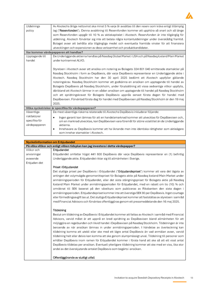 Invitation to acquire Swedish Depository Receipts in Alvotech 13 Av Alvotechs årliga nettovinst ska minst 5 % varje år avsättas till den reserv som krävs enligt tillämplig lag ("Reservfonden") . Denna avsättning till Reservfonden kommer att upphöra så snart och så länge som Reservfonden uppgår till 10 % av aktiekapitalet i Alvotech . Reservfonden är inte tillgänglig för utdelning . Alvotech förväntar sig inte att betala några kontantutdelningar under överskådlig framtid . Bolaget avser att behålla alla tillgängliga medel och eventuella framtida vinster för att finansiera utvecklingen och expansionen av dess verksamhet och produktkandidater . Utdelnings policy Var kommer värdepapperen att handlas? De Underliggande aktierna handlas på Nasdaq Global Market i USA och på Nasdaq Iceland Main Market under kortnamnet ALVO . Styrelsen i Alvotech avser att ansöka om notering av Bolagets 324 801 040 emitterade stamaktier på Nasdaq Stockholm i form av Depåbevis, där varje Depåbevis representerar en Underliggande aktie i Alvotech . Nasdaq Stockholm har den 30 april 2025 bedömt att Alvotech uppfyller gällande noteringskrav . Nasdaq Stockholm kommer att godkänna en ansökan om upptagande till handel av Bolagets Depåbevis på Nasdaq Stockholm, under förutsättning att vissa sedvanliga villkor uppfylls, däribland att Alvotech lämnar in en sådan ansökan om upptagande till handel på Nasdaq Stockholm och att spridningskravet för Bolagets Depåbevis uppnås senast första dagen för handel med Depåbevisen . Förväntad första dag för handel med Depåbevisen på Nasdaq Stockholm är den 19 maj 2025 . Upptagande till handel Vilka nyckelrisker är specifika för värdepapperen? De mest väsentliga riskerna relaterade till Alvotechs Depåbevis inkluderar följande : Ingen garanti kan lämnas för att en handelsmarknad kommer att utvecklas för Depåbevisen och, om en marknad utvecklas, kan Depåbevisen vara föremål för större volatilitet än de Underliggande aktierna . Innehavare av Depåbevis kommer att ha liknande men inte identiska rättigheter som aktieägare som innehar stamaktier i Alvotech . Väsentliga riskfaktorer specifika för värdepapperen Nyckelinformation om Erbjudandet På vilka villkor och enligt vilken tidsplan kan jag investera i detta värdepapper? Erbjudandet Erbjudandet omfattar högst 441 600 Depåbevis där varje Depåbevis representerar en (1) befintlig Underliggande aktie. Erbjudandet riktar sig till allmänheten i Sverige. Priset i Erbjudandet Det slutliga priset per Depåbevis i Erbjudandet ("Erbjudandepriset") kommer att vara det lägsta av antingen det volymvägda genomsnittspriset för Bolagets aktie på Nasdaq Iceland Main Market under anmälningsperioden för Erbjudandet, eller det sista stängningspriset för Bolagets aktie på Nasdaq Iceland Main Market under anmälningsperioden för Erbjudandet, med en rabatt om tio ( 10 ) % och omräknat till SEK baserat på den växelkurs som publiceras av Riksbanken den sista dagen i anmälningsperioden . Erbjudandepriset kommer inte att överstiga SEK 90 per Depåbevis . Inget courtage eller förmedlingsavgift tas ut . Det slutliga Erbjudandepriset kommer att fastställas av styrelsen i samråd med Financial Advisors och förväntas offentliggöras genom ett pressmeddelande den 16 maj 2025 . Tilldelning Beslut om tilldelning av Depåbevis i Erbjudandet kommer att fattas av Alvotech i samråd med Financial Advisors, varvid målet är att uppnå en bred spridning av Depåbevisen bland allmänheten för att möjliggöra en regelbunden och likvid handel i Depåbevisen på Nasdaq Stockholm . Tilldelningen är inte beroende av när ansökan lämnas in under anmälningsperioden . I händelse av överteckning kan tilldelning komma att utebli eller ske med ett lägre antal Depåbevis än vad anmälan avser, varvid tilldelning helt eller delvis kan komma att ske genom slumpmässigt urval . Tilldelning till personer som erhåller Depåbevis inom ramen för Erbjudandet kommer i första hand att ske så att ett visst antal Depåbevis tilldelas per ansökan . Eventuell ytterligare tilldelning kommer att ske med en viss, lika stor andel av det överskjutande antalet Depåbevis som begärts i ansökan . Offentliggörande av slutligt utfall Villkor och anvisningar avseende Erbjudan - det
