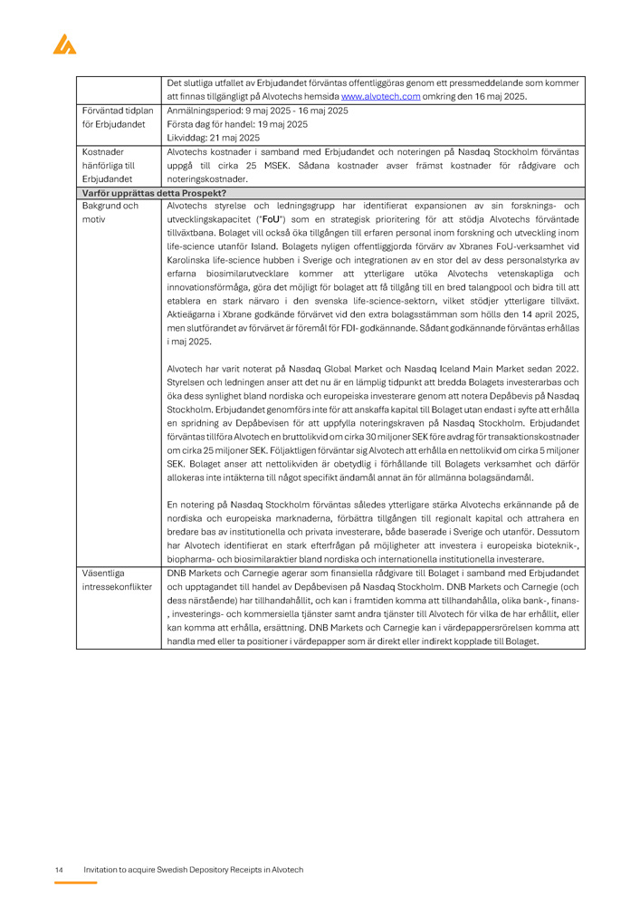 14 Invitation to acquire Swedish Depository Receipts in Alvotech Det slutliga utfallet av Erbjudandet förväntas offentliggöras genom ett pressmeddelande som kommer att finnas tillgängligt på Alvotechs hemsida www.alvotech.com omkring den 16 maj 2025. Anmälningsperiod: 9 maj 2025 - 16 maj 2025 Första dag för handel: 19 maj 2025 Likviddag: 21 maj 2025 Förväntad tidplan för Erbjudandet Alvotechs kostnader i samband med Erbjudandet och noteringen på Nasdaq Stockholm förväntas uppgå till cirka 25 MSEK. Sådana kostnader avser främst kostnader för rådgivare och noteringskostnader. Kostnader hänförliga till Erbjudandet Varför upprättas detta Prospekt? Alvotechs styrelse och ledningsgrupp har identifierat expansionen av sin forsknings - och utvecklingskapacitet ("FoU") som en strategisk prioritering för att stödja Alvotechs förväntade tillväxtbana . Bolaget vill också öka tillgången till erfaren personal inom forskning och utveckling inom life - science utanför Island . Bolagets nyligen offentliggjorda förvärv av Xbranes FoU - verksamhet vid Karolinska life - science hubben i Sverige och integrationen av en stor del av dess personalstyrka av erfarna biosimilarutvecklare kommer att ytterligare utöka Alvotechs vetenskapliga och innovationsförmåga, göra det möjligt för bolaget att få tillgång till en bred talangpool och bidra till att etablera en stark närvaro i den svenska life - science - sektorn, vilket stödjer ytterligare tillväxt . Aktieägarna i Xbrane godkände förvärvet vid den extra bolagsstämman som hölls den 14 april 2025 , men slutförandet av förvärvet är föremål för FDI - godkännande . Sådant godkännande förväntas erhållas i maj 2025 . Alvotech har varit noterat på Nasdaq Global Market och Nasdaq Iceland Main Market sedan 2022 . Styrelsen och ledningen anser att det nu är en lämplig tidpunkt att bredda Bolagets investerarbas och öka dess synlighet bland nordiska och europeiska investerare genom att notera Depåbevis på Nasdaq Stockholm . Erbjudandet genomförs inte för att anskaffa kapital till Bolaget utan endast i syfte att erhålla en spridning av Depåbevisen för att uppfylla noteringskraven på Nasdaq Stockholm . Erbjudandet förväntas tillföra Alvotech en bruttolikvid om cirka 30 miljoner SEK före avdrag för transaktionskostnader om cirka 25 miljoner SEK . Följaktligen förväntar sig Alvotech att erhålla en nettolikvid om cirka 5 miljoner SEK . Bolaget anser att nettolikviden är obetydlig i förhållande till Bolagets verksamhet och därför allokeras inte intäkterna till något specifikt ändamål annat än för allmänna bolagsändamål . En notering på Nasdaq Stockholm förväntas således ytterligare stärka Alvotechs erkännande på de nordiska och europeiska marknaderna, förbättra tillgången till regionalt kapital och attrahera en bredare bas av institutionella och privata investerare, både baserade i Sverige och utanför . Dessutom har Alvotech identifierat en stark efterfrågan på möjligheter att investera i europeiska bioteknik - , biopharma - och biosimilaraktier bland nordiska och internationella institutionella investerare . Bakgrund och motiv DNB Markets och Carnegie agerar som finansiella rådgivare till Bolaget i samband med Erbjudandet och upptagandet till handel av Depåbevisen på Nasdaq Stockholm. DNB Markets och Carnegie (och dess närstående) har tillhandahållit, och kan i framtiden komma att tillhandahålla, olika bank - , finans - , investerings - och kommersiella tjänster samt andra tjänster till Alvotech för vilka de har erhållit, eller kan komma att erhålla, ersättning. DNB Markets och Carnegie kan i värdepappersrörelsen komma att handla med eller ta positioner i värdepapper som är direkt eller indirekt kopplade till Bolaget. Väsentliga intressekonflikter