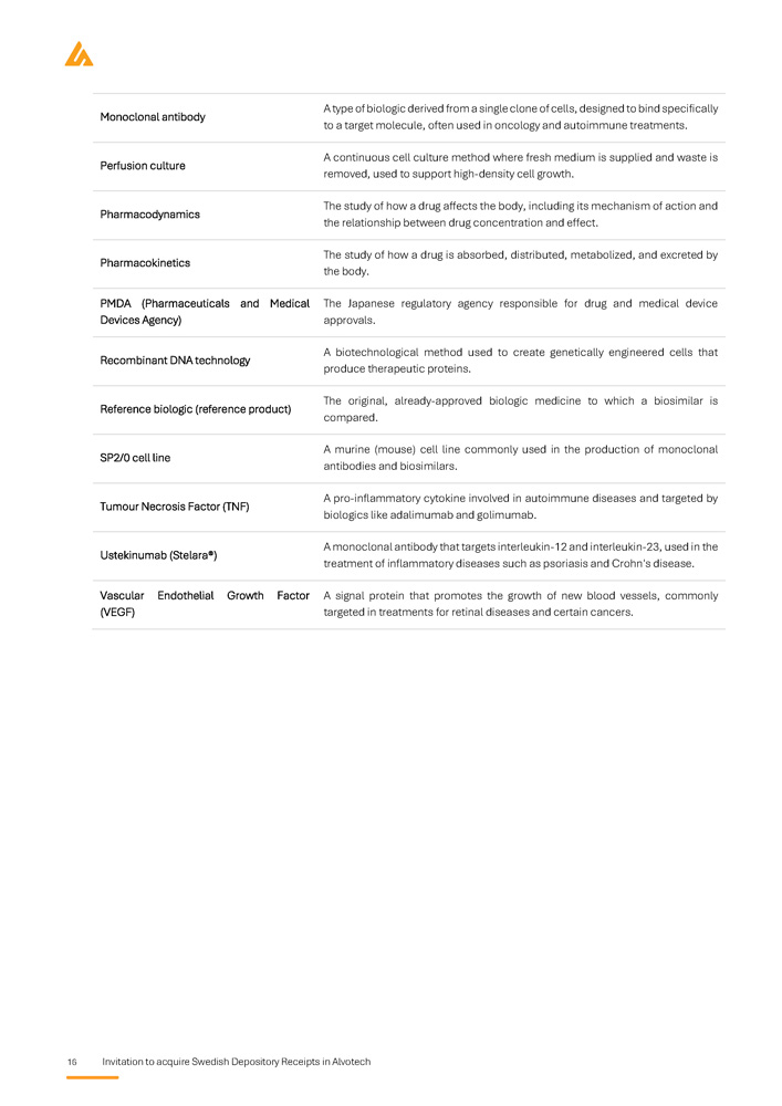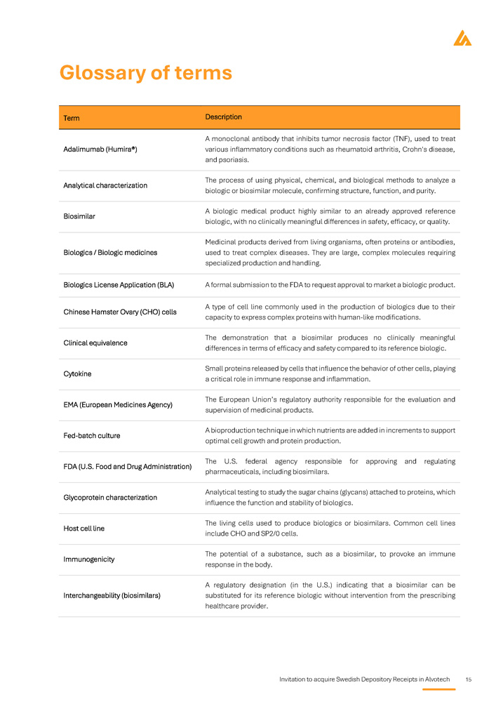 Invitation to acquire Swedish Depository Receipts in Alvotech 15 Glossary of terms Description Term A monoclonal antibody that inhibits tumor necrosis factor (TNF), used to treat various inflammatory conditions such as rheumatoid arthritis, Crohn's disease, and psoriasis . Adalimumab (Humira®) The process of using physical, chemical, and biological methods to analyze a biologic or biosimilar molecule, confirming structure, function, and purity. Analytical characterization A biologic medical product highly similar to an already approved reference biologic, with no clinically meaningful differences in safety, efficacy, or quality. Biosimilar Medicinal products derived from living organisms, often proteins or antibodies, used to treat complex diseases . They are large, complex molecules requiring specialized production and handling . Biologics / Biologic medicines A formal submission to the FDA to request approval to market a biologic product. Biologics License Application (BLA) A type of cell line commonly used in the production of biologics due to their capacity to express complex proteins with human - like modifications. Chinese Hamster Ovary (CHO) cells The demonstration that a biosimilar produces no clinically meaningful differences in terms of efficacy and safety compared to its reference biologic. Clinical equivalence Small proteins released by cells that influence the behavior of other cells, playing a critical role in immune response and inflammation. Cytokine The European Union’s regulatory authority responsible for the evaluation and supervision of medicinal products. EMA (European Medicines Agency) A bioproduction technique in which nutrients are added in increments to support optimal cell growth and protein production. Fed - batch culture The U.S. federal agency responsible for approving and regulating pharmaceuticals, including biosimilars. FDA (U.S. Food and Drug Administration) Analytical testing to study the sugar chains (glycans) attached to proteins, which influence the function and stability of biologics. Glycoprotein characterization The living cells used to produce biologics or biosimilars. Common cell lines include CHO and SP2/0 cells. Host cell line The potential of a substance, such as a biosimilar, to provoke an immune response in the body. Immunogenicity A regulatory designation (in the U . S . ) indicating that a biosimilar can be substituted for its reference biologic without intervention from the prescribing healthcare provider . Interchangeability (biosimilars)