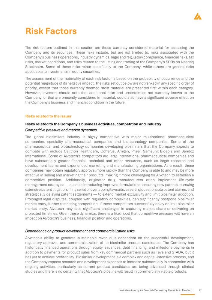 Invitation to acquire Swedish Depository Receipts in Alvotech 17 Risk Factors The risk factors outlined in this section are those currently considered material for assessing the Company and its securities . These risks include, but are not limited to, risks associated with the Company's business operations, industry dynamics, legal and regulatory compliance, financial risks, tax risks, market conditions, and risks related to the listing and trading of the Company's SDRs on Nasdaq Stockholm . Some of these risks relate specifically to the Company, while others are general risks applicable to investments in equity securities . The assessment of the materiality of each risk factor is based on the probability of occurrence and the potential magnitude of its negative impact . The risks set out below are not ranked in any specific order of priority, except that those currently deemed most material are presented first within each category . However, investors should note that additional risks and uncertainties not currently known to the Company, or that are presently considered immaterial, could also have a significant adverse effect on the Company's business and financial condition in the future . Risks related to the Issuer Risks related to the Company's business activities, competition and industry Competitive pressure and market dynamics The global biosimilars industry is highly competitive with major multinational pharmaceutical companies, speciality pharmaceutical companies and biotechnology companies . Some of the pharmaceutical and biotechnology companies developing biosimilars that the Company expects to compete with include Celltrion Healthcare, Coherus, Amgen, Pfizer, Samsung Bioepis and Sandoz International . Some of Alvotech's competitors are large international pharmaceutical companies and have substantially greater financial, technical and other resources, such as larger research and development teams and experienced marketing and manufacturing organisations . As a result, these companies may obtain regulatory approval more rapidly than the Company is able to and may be more effective in selling and marketing their products, making it more challenging for Alvotech to establish a competitive position . Additionally, originator drug manufacturers often implement life - cycle management strategies — such as introducing improved formulations, securing new patents, pursuing extensive patent litigation, filing serial or overlapping lawsuits, asserting questionable patent claims, and strategically delaying patent settlements — to extend market exclusivity and limit biosimilar adoption . Prolonged legal disputes, coupled with regulatory complexities, can significantly postpone biosimilar market entry, further restricting competition . If these competitors successfully delay or limit biosimilar market entry, Alvotech may face significant challenges in capturing market share or delivering on projected timelines . Given these dynamics, there is a likelihood that competitive pressure will have an impact on Alvotech's business, financial position and operations . Dependence on product development and commercialization risks Alvotech's ability to generate sustainable revenue is dependent on the successful development, regulatory approval, and commercialization of its biosimilar product candidates . The Company has historically financed operations through equity issuances, debt financing, and milestone payments in addition to payments for product sales from key commercial partners such as Teva and STADA, but it has yet to achieve profitability . Biosimilar development is a complex and capital - intensive process, and the Company expects research and development expenses to increase substantially in connection with ongoing activities, particularly as current product candidates are being advanced through clinical studies and there is no certainty that Alvotech's pipeline will result in commercially viable products .