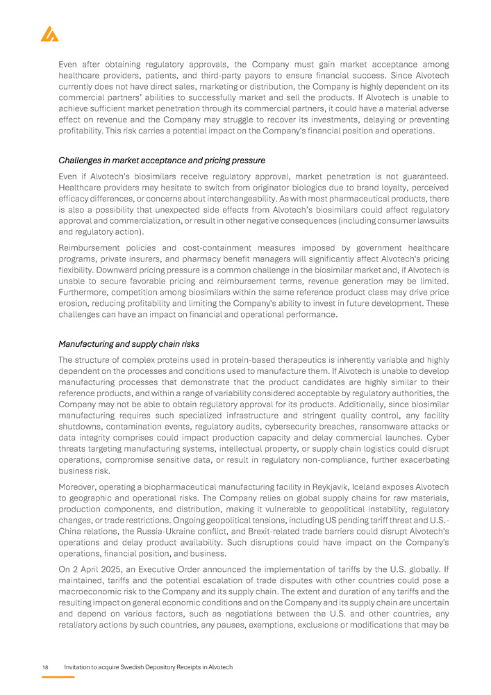 18 Invitation to acquire Swedish Depository Receipts in Alvotech Even after obtaining regulatory approvals, the Company must gain market acceptance among healthcare providers, patients, and third - party payors to ensure financial success . Since Alvotech currently does not have direct sales, marketing or distribution, the Company is highly dependent on its commercial partners’ abilities to successfully market and sell the products . If Alvotech is unable to achieve sufficient market penetration through its commercial partners, it could have a material adverse effect on revenue and the Company may struggle to recover its investments, delaying or preventing profitability . This risk carries a potential impact on the Company's financial position and operations . Challenges in market acceptance and pricing pressure Even if Alvotech's biosimilars receive regulatory approval, market penetration is not guaranteed . Healthcare providers may hesitate to switch from originator biologics due to brand loyalty, perceived efficacy differences, or concerns about interchangeability . As with most pharmaceutical products, there is also a possibility that unexpected side effects from Alvotech’s biosimilars could affect regulatory approval and commercialization, or result in other negative consequences (including consumer lawsuits and regulatory action) . Reimbursement policies and cost - containment measures imposed by government healthcare programs, private insurers, and pharmacy benefit managers will significantly affect Alvotech's pricing flexibility . Downward pricing pressure is a common challenge in the biosimilar market and, if Alvotech is unable to secure favorable pricing and reimbursement terms, revenue generation may be limited . Furthermore, competition among biosimilars within the same reference product class may drive price erosion, reducing profitability and limiting the Company's ability to invest in future development . These challenges can have an impact on financial and operational performance . Manufacturing and supply chain risks The structure of complex proteins used in protein - based therapeutics is inherently variable and highly dependent on the processes and conditions used to manufacture them . If Alvotech is unable to develop manufacturing processes that demonstrate that the product candidates are highly similar to their reference products, and within a range of variability considered acceptable by regulatory authorities, the Company may not be able to obtain regulatory approval for its products . Additionally, since biosimilar manufacturing requires such specialized infrastructure and stringent quality control, any facility shutdowns, contamination events, regulatory audits, cybersecurity breaches, ransomware attacks or data integrity comprises could impact production capacity and delay commercial launches . Cyber threats targeting manufacturing systems, intellectual property, or supply chain logistics could disrupt operations, compromise sensitive data, or result in regulatory non - compliance, further exacerbating business risk . Moreover, operating a biopharmaceutical manufacturing facility in Reykjavik, Iceland exposes Alvotech to geographic and operational risks . The Company relies on global supply chains for raw materials, production components, and distribution, making it vulnerable to geopolitical instability, regulatory changes, or trade restrictions . Ongoing geopolitical tensions, including US pending tariff threat and U . S . - China relations, the Russia - Ukraine conflict, and Brexit - related trade barriers could disrupt Alvotech's operations and delay product availability . Such disruptions could have impact on the Company's operations, financial position, and business . On 2 April 2025 , an Executive Order announced the implementation of tariffs by the U . S . globally . If maintained, tariffs and the potential escalation of trade disputes with other countries could pose a macroeconomic risk to the Company and its supply chain . The extent and duration of any tariffs and the resulting impact on general economic conditions and on the Company and its supply chain are uncertain and depend on various factors, such as negotiations between the U . S . and other countries, any retaliatory actions by such countries, any pauses, exemptions, exclusions or modifications that may be