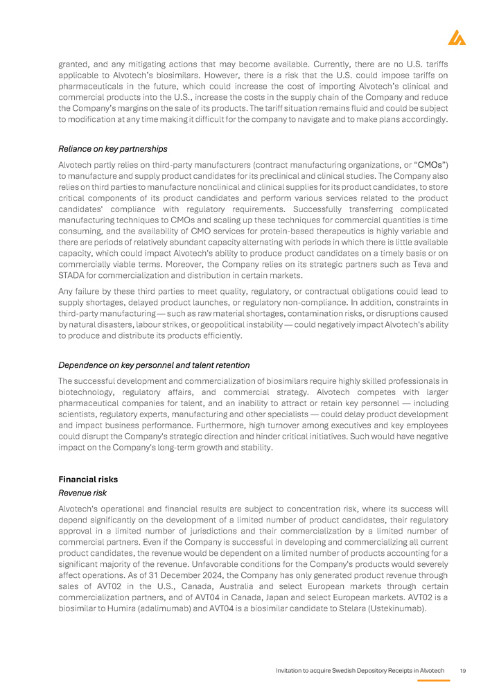 Invitation to acquire Swedish Depository Receipts in Alvotech 19 granted, and any mitigating actions that may become available . Currently, there are no U . S . tariffs applicable to Alvotech’s biosimilars . However, there is a risk that the U . S . could impose tariffs on pharmaceuticals in the future, which could increase the cost of importing Alvotech’s clinical and commercial products into the U . S . , increase the costs in the supply chain of the Company and reduce the Company’s margins on the sale of its products . The tariff situation remains fluid and could be subject to modification at any time making it difficult for the company to navigate and to make plans accordingly . Reliance on key partnerships Alvotech partly relies on third - party manufacturers (contract manufacturing organizations, or “CMOs”) to manufacture and supply product candidates for its preclinical and clinical studies . The Company also relies on third parties to manufacture nonclinical and clinical supplies for its product candidates, to store critical components of its product candidates and perform various services related to the product candidates' compliance with regulatory requirements . Successfully transferring complicated manufacturing techniques to CMOs and scaling up these techniques for commercial quantities is time consuming, and the availability of CMO services for protein - based therapeutics is highly variable and there are periods of relatively abundant capacity alternating with periods in which there is little available capacity, which could impact Alvotech's ability to produce product candidates on a timely basis or on commercially viable terms . Moreover, the Company relies on its strategic partners such as Teva and STADA for commercialization and distribution in certain markets . Any failure by these third parties to meet quality, regulatory, or contractual obligations could lead to supply shortages, delayed product launches, or regulatory non - compliance . In addition, constraints in third - party manufacturing — such as raw material shortages, contamination risks, or disruptions caused by natural disasters, labour strikes, or geopolitical instability — could negatively impact Alvotech's ability to produce and distribute its products efficiently . Dependence on key personnel and talent retention The successful development and commercialization of biosimilars require highly skilled professionals in biotechnology, regulatory affairs, and commercial strategy . Alvotech competes with larger pharmaceutical companies for talent, and an inability to attract or retain key personnel — including scientists, regulatory experts, manufacturing and other specialists — could delay product development and impact business performance . Furthermore, high turnover among executives and key employees could disrupt the Company's strategic direction and hinder critical initiatives . Such would have negative impact on the Company's long - term growth and stability . Financial risks Revenue risk Alvotech's operational and financial results are subject to concentration risk, where its success will depend significantly on the development of a limited number of product candidates, their regulatory approval in a limited number of jurisdictions and their commercialization by a limited number of commercial partners . Even if the Company is successful in developing and commercializing all current product candidates, the revenue would be dependent on a limited number of products accounting for a significant majority of the revenue . Unfavorable conditions for the Company's products would severely affect operations . As of 31 December 2024 , the Company has only generated product revenue through sales of AVT 02 in the U . S . , Canada, Australia and select European markets through certain commercialization partners, and of AVT 04 in Canada, Japan and select European markets . AVT 02 is a biosimilar to Humira (adalimumab) and AVT 04 is a biosimilar candidate to Stelara (Ustekinumab) .