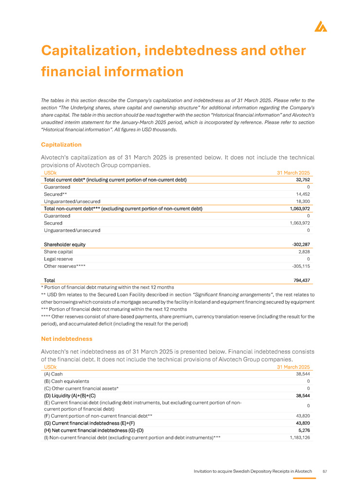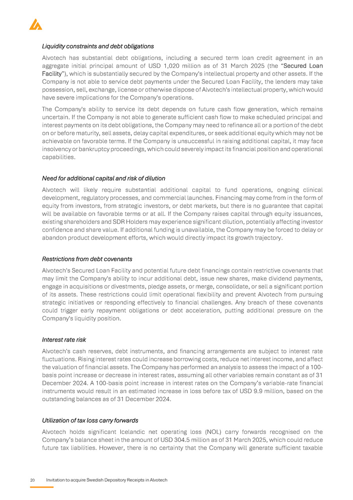 20 Invitation to acquire Swedish Depository Receipts in Alvotech Liquidity constraints and debt obligations Alvotech has substantial debt obligations, including a secured term loan credit agreement in an aggregate initial principal amount of USD 1 , 020 million as of 31 March 2025 (the “Secured Loan Facility”), which is substantially secured by the Company's intellectual property and other assets . If the Company is not able to service debt payments under the Secured Loan Facility, the lenders may take possession, sell, exchange, license or otherwise dispose of Alvotech's intellectual property, which would have severe implications for the Company's operations . The Company's ability to service its debt depends on future cash flow generation, which remains uncertain . If the Company is not able to generate sufficient cash flow to make scheduled principal and interest payments on its debt obligations, the Company may need to refinance all or a portion of the debt on or before maturity, sell assets, delay capital expenditures, or seek additional equity which may not be achievable on favorable terms . If the Company is unsuccessful in raising additional capital, it may face insolvency or bankruptcy proceedings, which could severely impact its financial position and operational capabilities . Need for additional capital and risk of dilution Alvotech will likely require substantial additional capital to fund operations, ongoing clinical development, regulatory processes, and commercial launches . Financing may come from in the form of equity from investors, from strategic investors, or debt markets, but there is no guarantee that capital will be available on favorable terms or at all . If the Company raises capital through equity issuances, existing shareholders and SDR Holders may experience significant dilution, potentially affecting investor confidence and share value . If additional funding is unavailable, the Company may be forced to delay or abandon product development efforts, which would directly impact its growth trajectory . Restrictions from debt covenants Alvotech's Secured Loan Facility and potential future debt financings contain restrictive covenants that may limit the Company's ability to incur additional debt, issue new shares, make dividend payments, engage in acquisitions or divestments, pledge assets, or merge, consolidate, or sell a significant portion of its assets . These restrictions could limit operational flexibility and prevent Alvotech from pursuing strategic initiatives or responding effectively to financial challenges . Any breach of these covenants could trigger early repayment obligations or debt acceleration, putting additional pressure on the Company's liquidity position . Interest rate risk Alvotech's cash reserves, debt instruments, and financing arrangements are subject to interest rate fluctuations . Rising interest rates could increase borrowing costs, reduce net interest income, and affect the valuation of financial assets . The Company has performed an analysis to assess the impact of a 100 - basis point increase or decrease in interest rates, assuming all other variables remain constant as of 31 December 2024 . A 100 - basis point increase in interest rates on the Company’s variable - rate financial instruments would result in an estimated increase in loss before tax of USD 9 . 9 million, based on the outstanding balances as of 31 December 2024 . Utilization of tax loss carry forwards Alvotech holds significant Icelandic net operating loss (NOL) carry forwards recognised on the Company’s balance sheet in the amount of USD 304 . 5 million as of 31 March 2025 , which could reduce future tax liabilities . However, there is no certainty that the Company will generate sufficient taxable