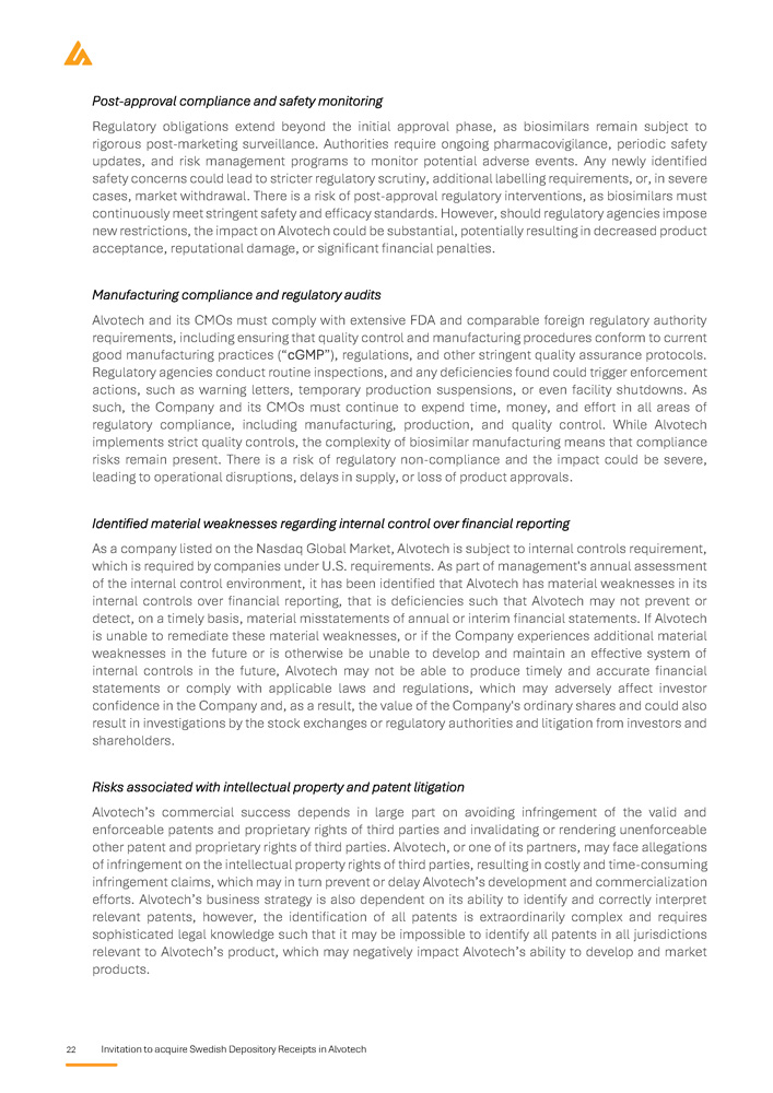 22 Invitation to acquire Swedish Depository Receipts in Alvotech Post - approval compliance and safety monitoring Regulatory obligations extend beyond the initial approval phase, as biosimilars remain subject to rigorous post - marketing surveillance . Authorities require ongoing pharmacovigilance, periodic safety updates, and risk management programs to monitor potential adverse events . Any newly identified safety concerns could lead to stricter regulatory scrutiny, additional labelling requirements, or, in severe cases, market withdrawal . There is a risk of post - approval regulatory interventions, as biosimilars must continuously meet stringent safety and efficacy standards . However, should regulatory agencies impose new restrictions, the impact on Alvotech could be substantial, potentially resulting in decreased product acceptance, reputational damage, or significant financial penalties . Manufacturing compliance and regulatory audits Alvotech and its CMOs must comply with extensive FDA and comparable foreign regulatory authority requirements, including ensuring that quality control and manufacturing procedures conform to current good manufacturing practices (“cGMP”), regulations, and other stringent quality assurance protocols . Regulatory agencies conduct routine inspections, and any deficiencies found could trigger enforcement actions, such as warning letters, temporary production suspensions, or even facility shutdowns . As such, the Company and its CMOs must continue to expend time, money, and effort in all areas of regulatory compliance, including manufacturing, production, and quality control . While Alvotech implements strict quality controls, the complexity of biosimilar manufacturing means that compliance risks remain present . There is a risk of regulatory non - compliance and the impact could be severe, leading to operational disruptions, delays in supply, or loss of product approvals . Identified material weaknesses regarding internal control over financial reporting As a company listed on the Nasdaq Global Market, Alvotech is subject to internal controls requirement, which is required by companies under U . S . requirements . As part of management's annual assessment of the internal control environment, it has been identified that Alvotech has material weaknesses in its internal controls over financial reporting, that is deficiencies such that Alvotech may not prevent or detect, on a timely basis, material misstatements of annual or interim financial statements . If Alvotech is unable to remediate these material weaknesses, or if the Company experiences additional material weaknesses in the future or is otherwise be unable to develop and maintain an effective system of internal controls in the future, Alvotech may not be able to produce timely and accurate financial statements or comply with applicable laws and regulations, which may adversely affect investor confidence in the Company and, as a result, the value of the Company's ordinary shares and could also result in investigations by the stock exchanges or regulatory authorities and litigation from investors and shareholders . Risks associated with intellectual property and patent litigation Alvotech’s commercial success depends in large part on avoiding infringement of the valid and enforceable patents and proprietary rights of third parties and invalidating or rendering unenforceable other patent and proprietary rights of third parties . Alvotech, or one of its partners, may face allegations of infringement on the intellectual property rights of third parties, resulting in costly and time - consuming infringement claims, which may in turn prevent or delay Alvotech’s development and commercialization efforts . Alvotech’s business strategy is also dependent on its ability to identify and correctly interpret relevant patents, however, the identification of all patents is extraordinarily complex and requires sophisticated legal knowledge such that it may be impossible to identify all patents in all jurisdictions relevant to Alvotech’s product, which may negatively impact Alvotech’s ability to develop and market products .