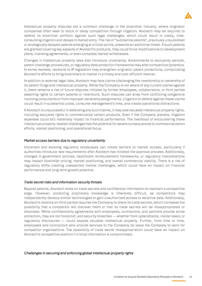 Invitation to acquire Swedish Depository Receipts in Alvotech 23 Intellectual property disputes are a common challenge in the biosimilar industry, where originator companies often seek to block or delay competition through litigation . Alvotech may be required to defend its biosimilar portfolio against such legal challenges, which could result in costly, time - consuming litigation and delays in market entry . The risk of "submarine patents", previously unpublished or strategically delayed patents emerging at critical points, presents an additional threat . If such patents are granted covering key aspects of Alvotech's products, they could force modifications to development plans, licensing agreements, or even complete market withdrawals . Changes in intellectual property laws also introduce uncertainty . Amendments to exclusivity periods, patent challenge procedures, or regulatory data protection frameworks may alter competitive dynamics . In some markets, revisions to IP legislation may strengthen originator patent protections, complicating Alvotech's efforts to bring biosimilars to market in a timely and cost - efficient manner . In addition to external legal risks, Alvotech may face claims challenging the inventorship or ownership of its patent filings and intellectual property . While the Company is not aware of any current claims against it, there remains a risk of future disputes initiated by former employees, collaborators, or third parties asserting rights to certain patents or inventions . Such disputes can arise from conflicting obligations involving consultants or from improper ownership assignments . Litigation to defend against these claims could result in substantial costs, consume management's time, and create operational distractions . If Alvotech is unsuccessful in defending any such claims, it may lose valuable intellectual property rights, including exclusive rights to commercialize certain products . Even if the Company prevails, litigation expenses could still materially impact its financial performance . The likelihood of encountering these intellectual property - related challenges has the potential for severe consequences to commercialization efforts, market positioning, and operational focus . Market access barriers due to regulatory uncertainty Uncertain and evolving regulatory landscapes can create barriers to market access, particularly if authorities introduce new requirements after Alvotech has initiated the approval process . Additionally, changes in government policies, healthcare reimbursement frameworks, or regulatory interpretations may impact biosimilar pricing, market positioning, and overall commercial viability . There is a risk of regulatory shifts creating unexpected market challenges, which could have an impact on financial performance and long - term growth potential . Trade secret risks and information security threats Beyond patents, Alvotech relies on trade secrets and confidential information to maintain a competitive edge . However, protecting proprietary knowledge is inherently difficult, as competitors may independently develop similar technologies or gain unauthorized access to sensitive data . Additionally, Alvotech's reliance on third parties requires the Company to share its trade secrets, which increases the possibility that a competitor will discover them or that its trade secrets will be misappropriated or disclosed . While confidentiality agreements with employees, contractors, and partners provide some protection, they are not foolproof, and security breaches — whether from cyberattacks, insider leaks, or regulatory disclosures — could expose valuable intellectual property . Further, from time to time, employees and contractors who provide services to the Company do leave the Company to work for competitor organisations . The possibility of trade secret misappropriation could have an impact on Alvotech's competitive position if critical information is compromised . Challenges in securing and enforcing global intellectual property rights