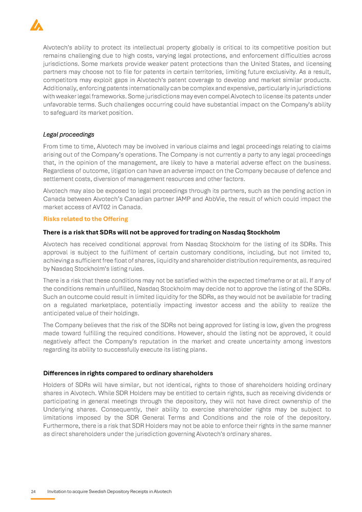24 Invitation to acquire Swedish Depository Receipts in Alvotech Alvotech's ability to protect its intellectual property globally is critical to its competitive position but remains challenging due to high costs, varying legal protections, and enforcement difficulties across jurisdictions . Some markets provide weaker patent protections than the United States, and licensing partners may choose not to file for patents in certain territories, limiting future exclusivity . As a result, competitors may exploit gaps in Alvotech's patent coverage to develop and market similar products . Additionally, enforcing patents internationally can be complex and expensive, particularly in jurisdictions with weaker legal frameworks . Some jurisdictions may even compel Alvotech to license its patents under unfavorable terms . Such challenges occurring could have substantial impact on the Company's ability to safeguard its market position . Legal proceedings From time to time, Alvotech may be involved in various claims and legal proceedings relating to claims arising out of the Company’s operations . The Company is not currently a party to any legal proceedings that, in the opinion of the management, are likely to have a material adverse effect on the business . Regardless of outcome, litigation can have an adverse impact on the Company because of defence and settlement costs, diversion of management resources and other factors . Alvotech may also be exposed to legal proceedings through its partners, such as the pending action in Canada between Alvotech’s Canadian partner JAMP and AbbVie, the result of which could impact the market access of AVT 02 in Canada . Risks related to the Offering There is a risk that SDRs will not be approved for trading on Nasdaq Stockholm Alvotech has received conditional approval from Nasdaq Stockholm for the listing of its SDRs . This approval is subject to the fulfilment of certain customary conditions, including, but not limited to, achieving a sufficient free float of shares, liquidity and shareholder distribution requirements, as required by Nasdaq Stockholm's listing rules . There is a risk that these conditions may not be satisfied within the expected timeframe or at all . If any of the conditions remain unfulfilled, Nasdaq Stockholm may decide not to approve the listing of the SDRs . Such an outcome could result in limited liquidity for the SDRs, as they would not be available for trading on a regulated marketplace, potentially impacting investor access and the ability to realize the anticipated value of their holdings . The Company believes that the risk of the SDRs not being approved for listing is low, given the progress made toward fulfilling the required conditions . However, should the listing not be approved, it could negatively affect the Company's reputation in the market and create uncertainty among investors regarding its ability to successfully execute its listing plans . Differences in rights compared to ordinary shareholders Holders of SDRs will have similar, but not identical, rights to those of shareholders holding ordinary shares in Alvotech . While SDR Holders may be entitled to certain rights, such as receiving dividends or participating in general meetings through the depository, they will not have direct ownership of the Underlying shares . Consequently, their ability to exercise shareholder rights may be subject to limitations imposed by the SDR General Terms and Conditions and the role of the depository . Furthermore, there is a risk that SDR Holders may not be able to enforce their rights in the same manner as direct shareholders under the jurisdiction governing Alvotech's ordinary shares .