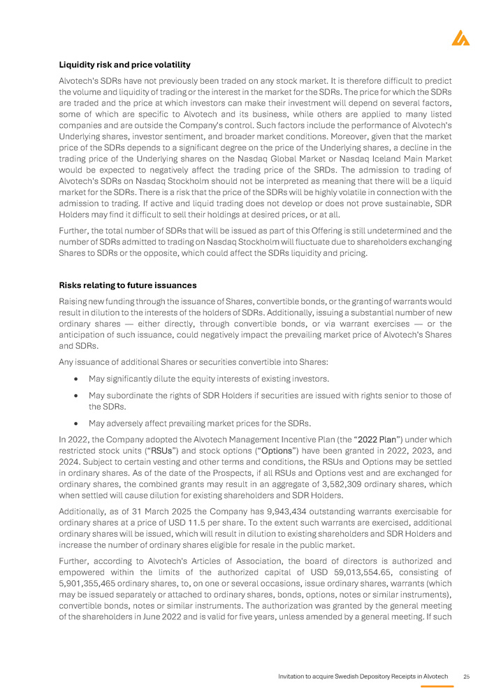 Invitation to acquire Swedish Depository Receipts in Alvotech 25 Liquidity risk and price volatility Alvotech's SDRs have not previously been traded on any stock market . It is therefore difficult to predict the volume and liquidity of trading or the interest in the market for the SDRs . The price for which the SDRs are traded and the price at which investors can make their investment will depend on several factors, some of which are specific to Alvotech and its business, while others are applied to many listed companies and are outside the Company's control . Such factors include the performance of Alvotech's Underlying shares, investor sentiment, and broader market conditions . Moreover, given that the market price of the SDRs depends to a significant degree on the price of the Underlying shares, a decline in the trading price of the Underlying shares on the Nasdaq Global Market or Nasdaq Iceland Main Market would be expected to negatively affect the trading price of the SRDs . The admission to trading of Alvotech's SDRs on Nasdaq Stockholm should not be interpreted as meaning that there will be a liquid market for the SDRs . There is a risk that the price of the SDRs will be highly volatile in connection with the admission to trading . If active and liquid trading does not develop or does not prove sustainable, SDR Holders may find it difficult to sell their holdings at desired prices, or at all . Further, the total number of SDRs that will be issued as part of this Offering is still undetermined and the number of SDRs admitted to trading on Nasdaq Stockholm will fluctuate due to shareholders exchanging Shares to SDRs or the opposite, which could affect the SDRs liquidity and pricing . Risks relating to future issuances Raising new funding through the issuance of Shares, convertible bonds, or the granting of warrants would result in dilution to the interests of the holders of SDRs . Additionally, issuing a substantial number of new ordinary shares — either directly, through convertible bonds, or via warrant exercises — or the anticipation of such issuance, could negatively impact the prevailing market price of Alvotech's Shares and SDRs . Any issuance of additional Shares or securities convertible into Shares : May significantly dilute the equity interests of existing investors . May subordinate the rights of SDR Holders if securities are issued with rights senior to those of the SDRs. May adversely affect prevailing market prices for the SDRs . In 2022 , the Company adopted the Alvotech Management Incentive Plan (the “ 2022 Plan”) under which restricted stock units (“RSUs”) and stock options (“Options”) have been granted in 2022 , 2023 , and 2024 . Subject to certain vesting and other terms and conditions, the RSUs and Options may be settled in ordinary shares . As of the date of the Prospects, if all RSUs and Options vest and are exchanged for ordinary shares, the combined grants may result in an aggregate of 3 , 582 , 309 ordinary shares, which when settled will cause dilution for existing shareholders and SDR Holders . Additionally, as of 31 March 2025 the Company has 9 , 943 , 434 outstanding warrants exercisable for ordinary shares at a price of USD 11 . 5 per share . To the extent such warrants are exercised, additional ordinary shares will be issued, which will result in dilution to existing shareholders and SDR Holders and increase the number of ordinary shares eligible for resale in the public market . Further, according to Alvotech's Articles of Association, the board of directors is authorized and empowered within the limits of the authorized capital of USD 59 , 013 , 554 . 65 , consisting of 5 , 901 , 355 , 465 ordinary shares, to, on one or several occasions, issue ordinary shares, warrants (which may be issued separately or attached to ordinary shares, bonds, options, notes or similar instruments), convertible bonds, notes or similar instruments . The authorization was granted by the general meeting of the shareholders in June 2022 and is valid for five years, unless amended by a general meeting . If such