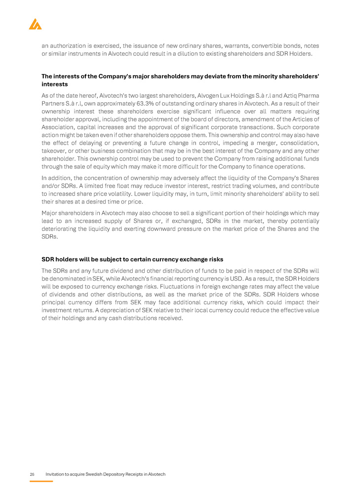 26 Invitation to acquire Swedish Depository Receipts in Alvotech an authorization is exercised, the issuance of new ordinary shares, warrants, convertible bonds, notes or similar instruments in Alvotech could result in a dilution to existing shareholders and SDR Holders . The interests of the Company's major shareholders may deviate from the minority shareholders' interests As of the date hereof, Alvotech's two largest shareholders, Alvogen Lux Holdings S . à r . l and Aztiq Pharma Partners S . à r . l, own approximately 63 . 3 % of outstanding ordinary shares in Alvotech . As a result of their ownership interest these shareholders exercise significant influence over all matters requiring shareholder approval, including the appointment of the board of directors, amendment of the Articles of Association, capital increases and the approval of significant corporate transactions . Such corporate action might be taken even if other shareholders oppose them . This ownership and control may also have the effect of delaying or preventing a future change in control, impeding a merger, consolidation, takeover, or other business combination that may be in the best interest of the Company and any other shareholder . This ownership control may be used to prevent the Company from raising additional funds through the sale of equity which may make it more difficult for the Company to finance operations . In addition, the concentration of ownership may adversely affect the liquidity of the Company's Shares and/or SDRs . A limited free float may reduce investor interest, restrict trading volumes, and contribute to increased share price volatility . Lower liquidity may, in turn, limit minority shareholders' ability to sell their shares at a desired time or price . Major shareholders in Alvotech may also choose to sell a significant portion of their holdings which may lead to an increased supply of Shares or, if exchanged, SDRs in the market, thereby potentially deteriorating the liquidity and exerting downward pressure on the market price of the Shares and the SDRs . SDR holders will be subject to certain currency exchange risks The SDRs and any future dividend and other distribution of funds to be paid in respect of the SDRs will be denominated in SEK, while Alvotech's financial reporting currency is USD . As a result, the SDR Holders will be exposed to currency exchange risks . Fluctuations in foreign exchange rates may affect the value of dividends and other distributions, as well as the market price of the SDRs . SDR Holders whose principal currency differs from SEK may face additional currency risks, which could impact their investment returns . A depreciation of SEK relative to their local currency could reduce the effective value of their holdings and any cash distributions received .
