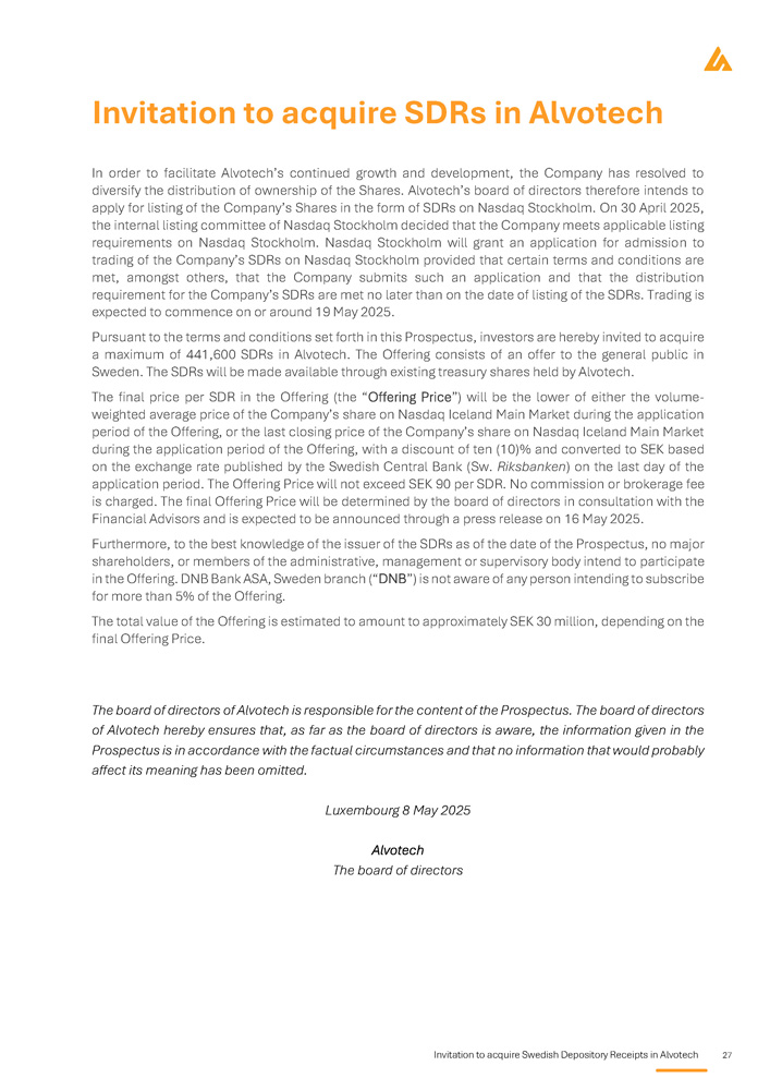 Invitation to acquire Swedish Depository Receipts in Alvotech 27 Invitation to acquire SDRs in Alvotech In order to facilitate Alvotech’s continued growth and development, the Company has resolved to diversify the distribution of ownership of the Shares . Alvotech’s board of directors therefore intends to apply for listing of the Company’s Shares in the form of SDRs on Nasdaq Stockholm . On 30 April 2025 , the internal listing committee of Nasdaq Stockholm decided that the Company meets applicable listing requirements on Nasdaq Stockholm . Nasdaq Stockholm will grant an application for admission to trading of the Company’s SDRs on Nasdaq Stockholm provided that certain terms and conditions are met, amongst others, that the Company submits such an application and that the distribution requirement for the Company’s SDRs are met no later than on the date of listing of the SDRs . Trading is expected to commence on or around 19 May 2025 . Pursuant to the terms and conditions set forth in this Prospectus, investors are hereby invited to acquire a maximum of 441 , 600 SDRs in Alvotech . The Offering consists of an offer to the general public in Sweden . The SDRs will be made available through existing treasury shares held by Alvotech . The final price per SDR in the Offering (the “Offering Price”) will be the lower of either the volume - weighted average price of the Company’s share on Nasdaq Iceland Main Market during the application period of the Offering, or the last closing price of the Company’s share on Nasdaq Iceland Main Market during the application period of the Offering, with a discount of ten ( 10 ) % and converted to SEK based on the exchange rate published by the Swedish Central Bank (Sw . Riksbanken ) on the last day of the application period . The Offering Price will not exceed SEK 90 per SDR . No commission or brokerage fee is charged . The final Offering Price will be determined by the board of directors in consultation with the Financial Advisors and is expected to be announced through a press release on 16 May 2025 . Furthermore, to the best knowledge of the issuer of the SDRs as of the date of the Prospectus, no major shareholders, or members of the administrative, management or supervisory body intend to participate in the Offering . DNB Bank ASA, Sweden branch (“DNB”) is not aware of any person intending to subscribe for more than 5 % of the Offering . The total value of the Offering is estimated to amount to approximately SEK 30 million, depending on the final Offering Price . The board of directors of Alvotech is responsible for the content of the Prospectus . The board of directors of Alvotech hereby ensures that, as far as the board of directors is aware, the information given in the Prospectus is in accordance with the factual circumstances and that no information that would probably affect its meaning has been omitted . Luxembourg 8 May 2025 Alvotech The board of directors