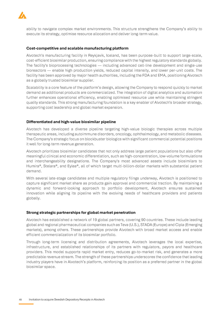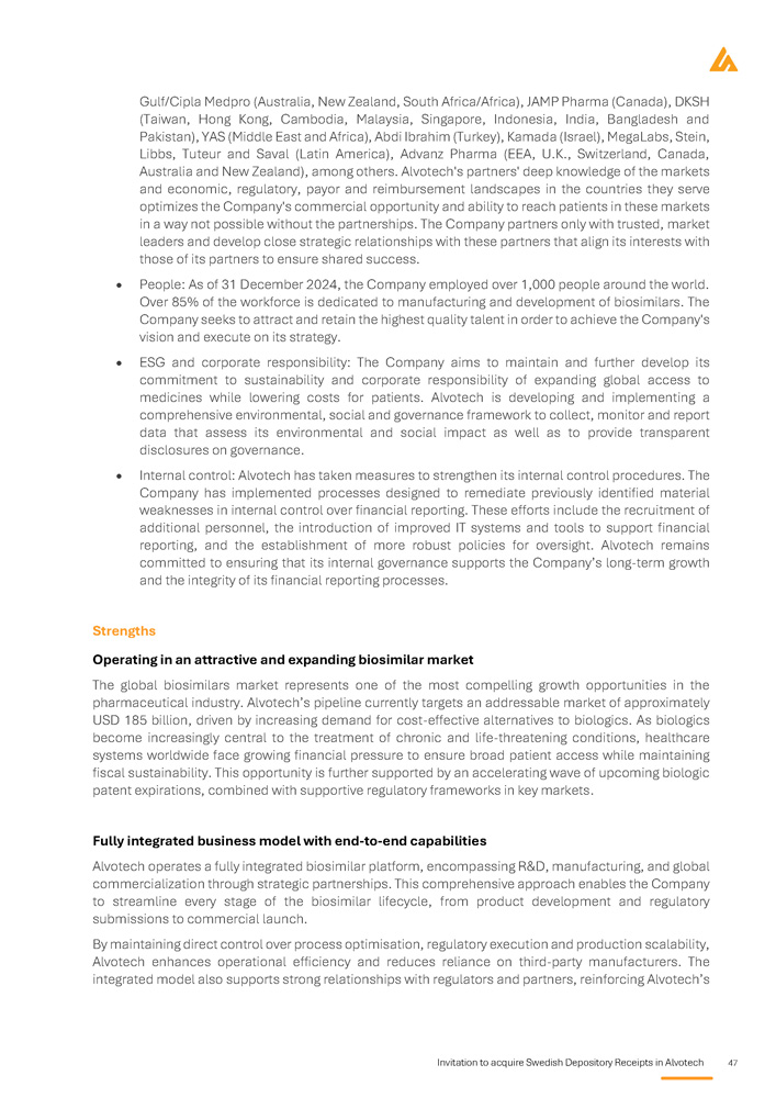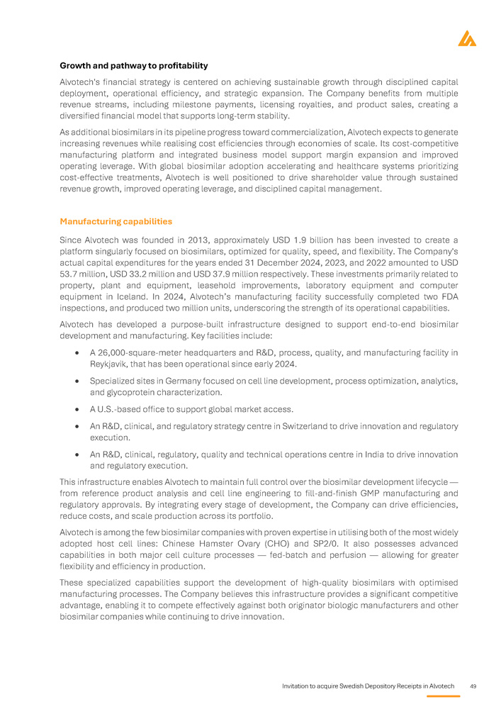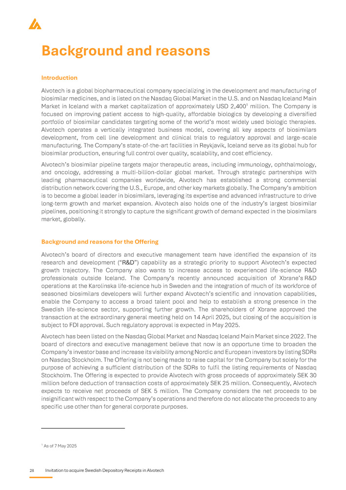 28 Invitation to acquire Swedish Depository Receipts in Alvotech Background and reasons Introduction Alvotech is a global biopharmaceutical company specializing in the development and manufacturing of biosimilar medicines, and is listed on the Nasdaq Global Market in the U . S . and on Nasdaq Iceland Main Market in Iceland with a market capitalization of approximately USD 2 , 400 1 million . The Company is focused on improving patient access to high - quality, affordable biologics by developing a diversified portfolio of biosimilar candidates targeting some of the world’s most widely used biologic therapies . Alvotech operates a vertically integrated business model, covering all key aspects of biosimilars development, from cell line development and clinical trials to regulatory approval and large - scale manufacturing . The Company’s state - of - the - art facilities in Reykjavik, Iceland serve as its global hub for biosimilar production, ensuring full control over quality, scalability, and cost efficiency . Alvotech’s biosimilar pipeline targets major therapeutic areas, including immunology, ophthalmology, and oncology, addressing a multi - billion - dollar global market . Through strategic partnerships with leading pharmaceutical companies worldwide, Alvotech has established a strong commercial distribution network covering the U . S . , Europe, and other key markets globally . The Company’s ambition is to become a global leader in biosimilars, leveraging its expertise and advanced infrastructure to drive long - term growth and market expansion . Alvotech also holds one of the industry’s largest biosimilar pipelines, positioning it strongly to capture the significant growth of demand expected in the biosimilars market, globally . Background and reasons for the Offering Alvotech’s board of directors and executive management team have identified the expansion of its research and development (“R&D”) capability as a strategic priority to support Alvotech’s expected growth trajectory . The Company also wants to increase access to experienced life - science R&D professionals outside Iceland . The Company’s recently announced acquisition of Xbrane’s R&D operations at the Karolinska life - science hub in Sweden and the integration of much of its workforce of seasoned biosimilars developers will further expand Alvotech’s scientific and innovation capabilities, enable the Company to access a broad talent pool and help to establish a strong presence in the Swedish life - science sector, supporting further growth . The shareholders of Xbrane approved the transaction at the extraordinary general meeting held on 14 April 2025 , but closing of the acquisition is subject to FDI approval . Such regulatory approval is expected in May 2025 . Alvotech has been listed on the Nasdaq Global Market and Nasdaq Iceland Main Market since 2022 . The board of directors and executive management believe that now is an opportune time to broaden the Company’s investor base and increase its visibility among Nordic and European investors by listing SDRs on Nasdaq Stockholm . The Offering is not being made to raise capital for the Company but solely for the purpose of achieving a sufficient distribution of the SDRs to fulfil the listing requirements of Nasdaq Stockholm . The Offering is expected to provide Alvotech with gross proceeds of approximately SEK 30 million before deduction of transaction costs of approximately SEK 25 million . Consequently, Alvotech expects to receive net proceeds of SEK 5 million . The Company considers the net proceeds to be insignificant with respect to the Company’s operations and therefore do not allocate the proceeds to any specific use other than for general corporate purposes . 1 As of 7 May 2025