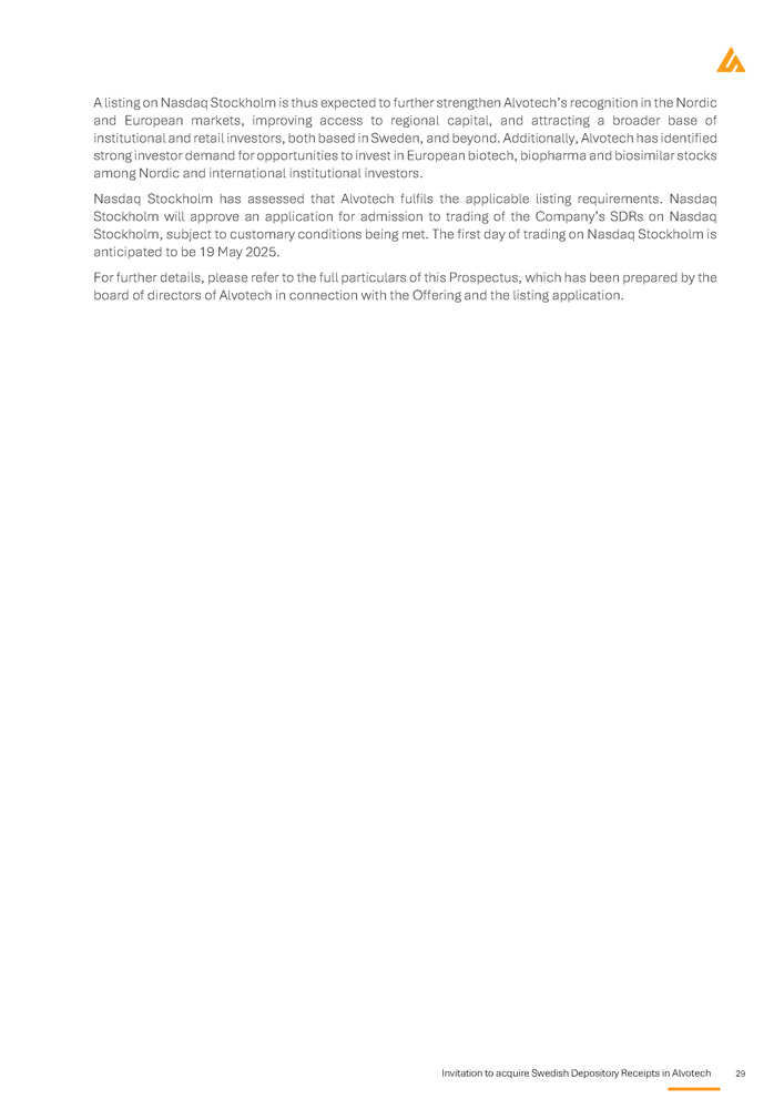 Invitation to acquire Swedish Depository Receipts in Alvotech 29 A listing on Nasdaq Stockholm is thus expected to further strengthen Alvotech’s recognition in the Nordic and European markets, improving access to regional capital, and attracting a broader base of institutional and retail investors, both based in Sweden, and beyond . Additionally, Alvotech has identified strong investor demand for opportunities to invest in European biotech, biopharma and biosimilar stocks among Nordic and international institutional investors . Nasdaq Stockholm has assessed that Alvotech fulfils the applicable listing requirements . Nasdaq Stockholm will approve an application for admission to trading of the Company’s SDRs on Nasdaq Stockholm, subject to customary conditions being met . The first day of trading on Nasdaq Stockholm is anticipated to be 19 May 2025 . For further details, please refer to the full particulars of this Prospectus, which has been prepared by the board of directors of Alvotech in connection with the Offering and the listing application .
