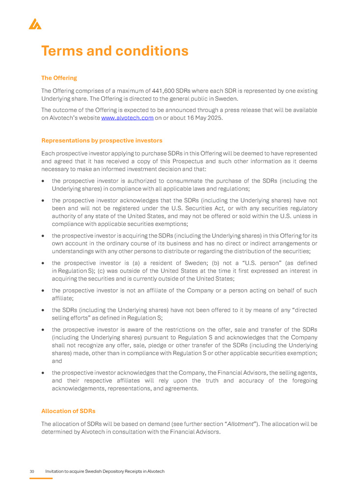 30 Invitation to acquire Swedish Depository Receipts in Alvotech Terms and conditions The Offering The Offering comprises of a maximum of 441 , 600 SDRs where each SDR is represented by one existing Underlying share . The Offering is directed to the general public in Sweden . The outcome of the Offering is expected to be announced through a press release that will be available on Alvotech’s website www . alvotech . com on or about 16 May 2025 . Representations by prospective investors Each prospective investor applying to purchase SDRs in this Offering will be deemed to have represented and agreed that it has received a copy of this Prospectus and such other information as it deems necessary to make an informed investment decision and that : the prospective investor is authorized to consummate the purchase of the SDRs (including the Underlying shares) in compliance with all applicable laws and regulations ; the prospective investor acknowledges that the SDRs (including the Underlying shares) have not been and will not be registered under the U . S . Securities Act, or with any securities regulatory authority of any state of the United States, and may not be offered or sold within the U . S . unless in compliance with applicable securities exemptions ; the prospective investor is acquiring the SDRs (including the Underlying shares) in this Offering for its own account in the ordinary course of its business and has no direct or indirect arrangements or understandings with any other persons to distribute or regarding the distribution of the securities ; the prospective investor is (a) a resident of Sweden ; (b) not a “U . S . person” (as defined in Regulation S) ; (c) was outside of the United States at the time it first expressed an interest in acquiring the securities and is currently outside of the United States ; the prospective investor is not an affiliate of the Company or a person acting on behalf of such affiliate ; the SDRs (including the Underlying shares) have not been offered to it by means of any “directed selling efforts” as defined in Regulation S ; the prospective investor is aware of the restrictions on the offer, sale and transfer of the SDRs (including the Underlying shares) pursuant to Regulation S and acknowledges that the Company shall not recognize any offer, sale, pledge or other transfer of the SDRs (including the Underlying shares) made, other than in compliance with Regulation S or other applicable securities exemption ; and the prospective investor acknowledges that the Company, the Financial Advisors, the selling agents, and their respective affiliates will rely upon the truth and accuracy of the foregoing acknowledgements, representations, and agreements . Allocation of SDRs The allocation of SDRs will be based on demand (see further section “ Allotment ”). The allocation will be determined by Alvotech in consultation with the Financial Advisors.