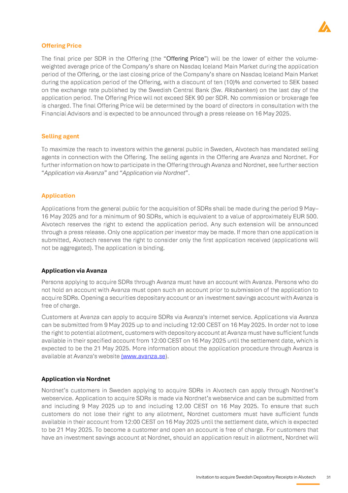 Invitation to acquire Swedish Depository Receipts in Alvotech 31 Offering Price The final price per SDR in the Offering (the “Offering Price”) will be the lower of either the volume - weighted average price of the Company’s share on Nasdaq Iceland Main Market during the application period of the Offering, or the last closing price of the Company’s share on Nasdaq Iceland Main Market during the application period of the Offering, with a discount of ten ( 10 ) % and converted to SEK based on the exchange rate published by the Swedish Central Bank (Sw . Riksbanken ) on the last day of the application period . The Offering Price will not exceed SEK 90 per SDR . No commission or brokerage fee is charged . The final Offering Price will be determined by the board of directors in consultation with the Financial Advisors and is expected to be announced through a press release on 16 May 2025 . Selling agent To maximize the reach to investors within the general public in Sweden, Alvotech has mandated selling agents in connection with the Offering . The selling agents in the Offering are Avanza and Nordnet . For further information on how to participate in the Offering through Avanza and Nordnet, see further section “ Application via Avanza ” and “ Application via Nordnet ” . Application Applications from the general public for the acquisition of SDRs shall be made during the period 9 May – 16 May 2025 and for a minimum of 90 SDRs, which is equivalent to a value of approximately EUR 500 . Alvotech reserves the right to extend the application period . Any such extension will be announced through a press release . Only one application per investor may be made . If more than one application is submitted, Alvotech reserves the right to consider only the first application received (applications will not be aggregated) . The application is binding . Application via Avanza Persons applying to acquire SDRs through Avanza must have an account with Avanza . Persons who do not hold an account with Avanza must open such an account prior to submission of the application to acquire SDRs . Opening a securities depositary account or an investment savings account with Avanza is free of charge . Customers at Avanza can apply to acquire SDRs via Avanza's internet service . Applications via Avanza can be submitted from 9 May 2025 up to and including 12 : 00 CEST on 16 May 2025 . In order not to lose the right to potential allotment, customers with depository account at Avanza must have sufficient funds available in their specified account from 12 : 00 CEST on 16 May 2025 until the settlement date, which is expected to be the 21 May 2025 . More information about the application procedure through Avanza is available at Avanza's website (www . avanza . se ) . Application via Nordnet Nordnet’s customers in Sweden applying to acquire SDRs in Alvotech can apply through Nordnet’s webservice . Application to acquire SDRs is made via Nordnet’s webservice and can be submitted from and including 9 May 2025 up to and including 12 . 00 CEST on 16 May 2025 . To ensure that such customers do not lose their right to any allotment, Nordnet customers must have sufficient funds available in their account from 12 : 00 CEST on 16 May 2025 until the settlement date, which is expected to be 21 May 2025 . To become a customer and open an account is free of charge . For customers that have an investment savings account at Nordnet, should an application result in allotment, Nordnet will