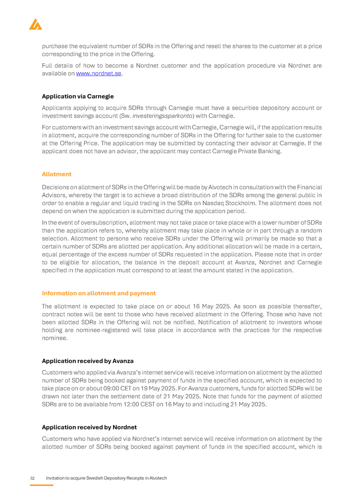 32 Invitation to acquire Swedish Depository Receipts in Alvotech purchase the equivalent number of SDRs in the Offering and resell the shares to the customer at a price corresponding to the price in the Offering . Full details of how to become a Nordnet customer and the application procedure via Nordnet are available on www . nordnet . se . Application via Carnegie Applicants applying to acquire SDRs through Carnegie must have a securities depository account or investment savings account (Sw . investeringssparkonto ) with Carnegie . For customers with an investment savings account with Carnegie, Carnegie will, if the application results in allotment, acquire the corresponding number of SDRs in the Offering for further sale to the customer at the Offering Price . The application may be submitted by contacting their advisor at Carnegie . If the applicant does not have an advisor, the applicant may contact Carnegie Private Banking . Allotment Decisions on allotment of SDRs in the Offering will be made by Alvotech in consultation with the Financial Advisors, whereby the target is to achieve a broad distribution of the SDRs among the general public in order to enable a regular and liquid trading in the SDRs on Nasdaq Stockholm . The allotment does not depend on when the application is submitted during the application period . In the event of oversubscription, allotment may not take place or take place with a lower number of SDRs than the application refers to, whereby allotment may take place in whole or in part through a random selection . Allotment to persons who receive SDRs under the Offering will primarily be made so that a certain number of SDRs are allotted per application . Any additional allocation will be made in a certain, equal percentage of the excess number of SDRs requested in the application . Please note that in order to be eligible for allocation, the balance in the deposit account at Avanza, Nordnet and Carnegie specified in the application must correspond to at least the amount stated in the application . Information on allotment and payment The allotment is expected to take place on or about 16 May 2025 . As soon as possible thereafter, contract notes will be sent to those who have received allotment in the Offering . Those who have not been allotted SDRs in the Offering will not be notified . Notification of allotment to investors whose holding are nominee - registered will take place in accordance with the practices for the respective nominee . Application received by Avanza Customers who applied via Avanza’s internet service will receive information on allotment by the allotted number of SDRs being booked against payment of funds in the specified account, which is expected to take place on or about 09 : 00 CET on 19 May 2025 . For Avanza customers, funds for allotted SDRs will be drawn not later than the settlement date of 21 May 2025 . Note that funds for the payment of allotted SDRs are to be available from 12 : 00 CEST on 16 May to and including 21 May 2025 . Application received by Nordnet Customers who have applied via Nordnet’s internet service will receive information on allotment by the allotted number of SDRs being booked against payment of funds in the specified account, which is
