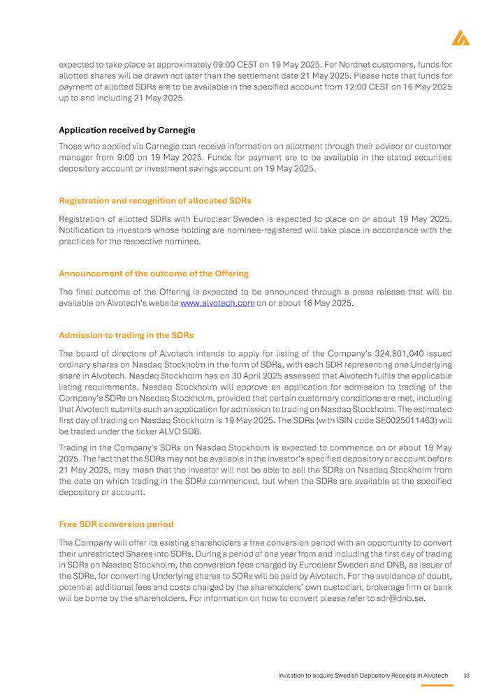 Invitation to acquire Swedish Depository Receipts in Alvotech 33 expected to take place at approximately 09 : 00 CEST on 19 May 2025 . For Nordnet customers, funds for allotted shares will be drawn not later than the settlement date 21 May 2025 . Please note that funds for payment of allotted SDRs are to be available in the specified account from 12 : 00 CEST on 16 May 2025 up to and including 21 May 2025 . Application received by Carnegie Those who applied via Carnegie can receive information on allotment through their advisor or customer manager from 9 : 00 on 19 May 2025 . Funds for payment are to be available in the stated securities depository account or investment savings account on 19 May 2025 . Registration and recognition of allocated SDRs Registration of allotted SDRs with Euroclear Sweden is expected to place on or about 19 May 2025 . Notification to investors whose holding are nominee - registered will take place in accordance with the practices for the respective nominee . Announcement of the outcome of the Offering The final outcome of the Offering is expected to be announced through a press release that will be available on Alvotech’s website www . alvotech . com on or about 16 May 2025 . Admission to trading in the SDRs The board of directors of Alvotech intends to apply for listing of the Company’s 324 , 801 , 040 issued ordinary shares on Nasdaq Stockholm in the form of SDRs, with each SDR representing one Underlying share in Alvotech . Nasdaq Stockholm has on 30 April 2025 assessed that Alvotech fulfils the applicable listing requirements . Nasdaq Stockholm will approve an application for admission to trading of the Company’s SDRs on Nasdaq Stockholm, provided that certain customary conditions are met, including that Alvotech submits such an application for admission to trading on Nasdaq Stockholm . The estimated first day of trading on Nasdaq Stockholm is 19 May 2025 . The SDRs (with ISIN code SE 0025011463 ) will be traded under the ticker ALVO SDB . Trading in the Company's SDRs on Nasdaq Stockholm is expected to commence on or about 19 May 2025 . The fact that the SDRs may not be available in the investor’s specified depository or account before 21 May 2025 , may mean that the investor will not be able to sell the SDRs on Nasdaq Stockholm from the date on which trading in the SDRs commenced, but when the SDRs are available at the specified depository or account . Free SDR conversion period The Company will offer its existing shareholders a free conversion period with an opportunity to convert their unrestricted Shares into SDRs . During a period of one year from and including the first day of trading in SDRs on Nasdaq Stockholm, the conversion fees charged by Euroclear Sweden and DNB, as issuer of the SDRs, for converting Underlying shares to SDRs will be paid by Alvotech . For the avoidance of doubt, potential additional fees and costs charged by the shareholders’ own custodian, brokerage firm or bank will be borne by the shareholders . For information on how to convert please refer to sdr@dnb . se .