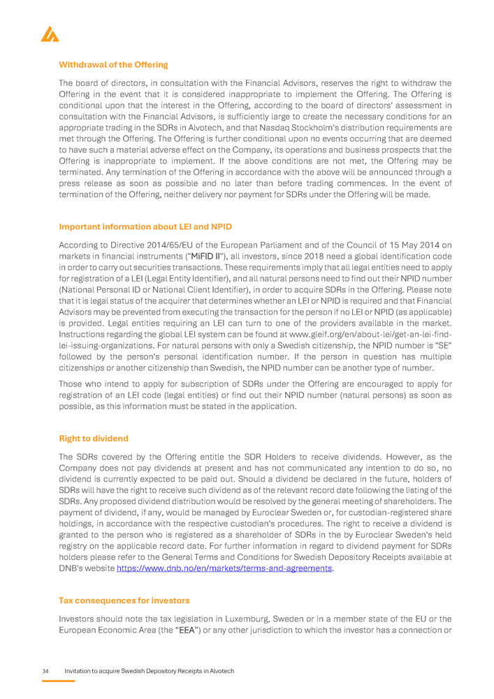 34 Invitation to acquire Swedish Depository Receipts in Alvotech Withdrawal of the Offering The board of directors, in consultation with the Financial Advisors, reserves the right to withdraw the Offering in the event that it is considered inappropriate to implement the Offering . The Offering is conditional upon that the interest in the Offering, according to the board of directors' assessment in consultation with the Financial Advisors, is sufficiently large to create the necessary conditions for an appropriate trading in the SDRs in Alvotech, and that Nasdaq Stockholm's distribution requirements are met through the Offering . The Offering is further conditional upon no events occurring that are deemed to have such a material adverse effect on the Company, its operations and business prospects that the Offering is inappropriate to implement . If the above conditions are not met, the Offering may be terminated . Any termination of the Offering in accordance with the above will be announced through a press release as soon as possible and no later than before trading commences . In the event of termination of the Offering, neither delivery nor payment for SDRs under the Offering will be made . Important information about LEI and NPID According to Directive 2014 / 65 /EU of the European Parliament and of the Council of 15 May 2014 on markets in financial instruments ("MiFID II"), all investors, since 2018 need a global identification code in order to carry out securities transactions . These requirements imply that all legal entities need to apply for registration of a LEI (Legal Entity Identifier), and all natural persons need to find out their NPID number (National Personal ID or National Client Identifier), in order to acquire SDRs in the Offering . Please note that it is legal status of the acquirer that determines whether an LEI or NPID is required and that Financial Advisors may be prevented from executing the transaction for the person if no LEI or NPID (as applicable) is provided . Legal entities requiring an LEI can turn to one of the providers available in the market . Instructions regarding the global LEI system can be found at www . gleif . org/en/about - lei/get - an - lei - find - lei - issuing - organizations . For natural persons with only a Swedish citizenship, the NPID number is "SE" followed by the person's personal identification number . If the person in question has multiple citizenships or another citizenship than Swedish, the NPID number can be another type of number . Those who intend to apply for subscription of SDRs under the Offering are encouraged to apply for registration of an LEI code (legal entities) or find out their NPID number (natural persons) as soon as possible, as this information must be stated in the application . Right to dividend The SDRs covered by the Offering entitle the SDR Holders to receive dividends . However, as the Company does not pay dividends at present and has not communicated any intention to do so, no dividend is currently expected to be paid out . Should a dividend be declared in the future, holders of SDRs will have the right to receive such dividend as of the relevant record date following the listing of the SDRs . Any proposed dividend distribution would be resolved by the general meeting of shareholders . The payment of dividend, if any, would be managed by Euroclear Sweden or, for custodian - registered share holdings, in accordance with the respective custodian's procedures . The right to receive a dividend is granted to the person who is registered as a shareholder of SDRs in the by Euroclear Sweden's held registry on the applicable record date . For further information in regard to dividend payment for SDRs holders please refer to the General Terms and Conditions for Swedish Depository Receipts available at DNB's website https : //www . dnb . no/en/markets/terms - and - agreements . Tax consequences for investors Investors should note the tax legislation in Luxemburg, Sweden or in a member state of the EU or the European Economic Area (the “EEA”) or any other jurisdiction to which the investor has a connection or