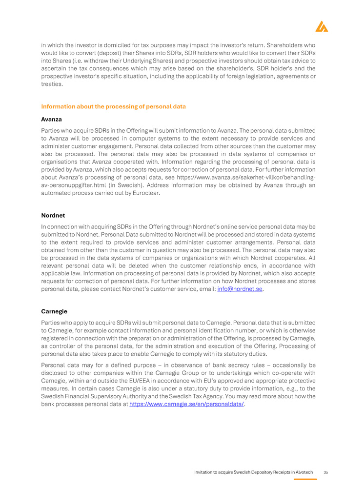 Invitation to acquire Swedish Depository Receipts in Alvotech 35 in which the investor is domiciled for tax purposes may impact the investor's return . Shareholders who would like to convert (deposit) their Shares into SDRs, SDR holders who would like to convert their SDRs into Shares (i . e . withdraw their Underlying Shares) and prospective investors should obtain tax advice to ascertain the tax consequences which may arise based on the shareholder's, SDR holder's and the prospective investor's specific situation, including the applicability of foreign legislation, agreements or treaties . Information about the processing of personal data Avanza Parties who acquire SDRs in the Offering will submit information to Avanza . The personal data submitted to Avanza will be processed in computer systems to the extent necessary to provide services and administer customer engagement . Personal data collected from other sources than the customer may also be processed . The personal data may also be processed in data systems of companies or organisations that Avanza cooperated with . Information regarding the processing of personal data is provided by Avanza, which also accepts requests for correction of personal data . For further information about Avanza’s processing of personal data, see https : //www . avanza . se/sakerhet - villkor/behandling - av - personuppgifter . html (in Swedish) . Address information may be obtained by Avanza through an automated process carried out by Euroclear . Nordnet In connection with acquiring SDRs in the Offering through Nordnet’s online service personal data may be submitted to Nordnet . Personal Data submitted to Nordnet will be processed and stored in data systems to the extent required to provide services and administer customer arrangements . Personal data obtained from other than the customer in question may also be processed . The personal data may also be processed in the data systems of companies or organizations with which Nordnet cooperates . All relevant personal data will be deleted when the customer relationship ends, in accordance with applicable law . Information on processing of personal data is provided by Nordnet, which also accepts requests for correction of personal data . For further information on how Nordnet processes and stores personal data, please contact Nordnet’s customer service, email : info@nordnet . se . Carnegie Parties who apply to acquire SDRs will submit personal data to Carnegie . Personal data that is submitted to Carnegie, for example contact information and personal identification number, or which is otherwise registered in connection with the preparation or administration of the Offering, is processed by Carnegie, as controller of the personal data, for the administration and execution of the Offering . Processing of personal data also takes place to enable Carnegie to comply with its statutory duties . Personal data may for a defined purpose – in observance of bank secrecy rules – occasionally be disclosed to other companies within the Carnegie Group or to undertakings which co - operate with Carnegie, within and outside the EU/EEA in accordance with EU’s approved and appropriate protective measures . In certain cases Carnegie is also under a statutory duty to provide information, e . g . , to the Swedish Financial Supervisory Authority and the Swedish Tax Agency . You may read more about how the bank processes personal data at https : //www . carnegie . se/en/personaldata/ .