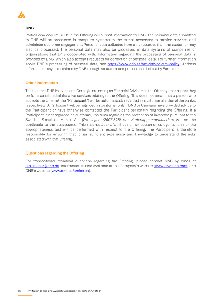 36 Invitation to acquire Swedish Depository Receipts in Alvotech DNB Parties who acquire SDRs in the Offering will submit information to DNB . The personal data submitted to DNB will be processed in computer systems to the extent necessary to provide services and administer customer engagement . Personal data collected from other sources than the customer may also be processed . The personal data may also be processed in data systems of companies or organisations that DNB cooperated with . Information regarding the processing of personal data is provided by DNB, which also accepts requests for correction of personal data . For further information about DNB’s processing of personal data, see https : //www . dnb . se/om - dnb/privacy - policy . Address information may be obtained by DNB through an automated process carried out by Euroclear . Other information The fact that DNB Markets and Carnegie are acting as Financial Advisors in the Offering, means that they perform certain administrative services relating to the Offering . This does not mean that a person who accepts the Offering (the “Participant”) will be automatically regarded as customer of either of the banks, respectively . A Participant will be regarded as customer only if DNB or Carnegie have provided advice to the Participant or have otherwise contacted the Participant personally regarding the Offering . If a Participant is not regarded as customer, the rules regarding the protection of investors pursuant to the Swedish Securities Market Act (Sw . lagen ( 2007 : 528 ) om värdepappersmarknaden ) will not be applicable to the acceptance . This means, inter alia , that neither customer categorization nor the appropriateness test will be performed with respect to the Offering . The Participant is therefore responsible for ensuring that it has sufficient experience and knowledge to understand the risks associated with the Offering . Questions regarding the Offering For transactional technical questions regarding the Offering, please contact DNB by email at emissioner@dnb . se . Information is also available at the Company’s website ( www . alvotech . com ) and DNB's website ( www . dnb . se/emission ) .