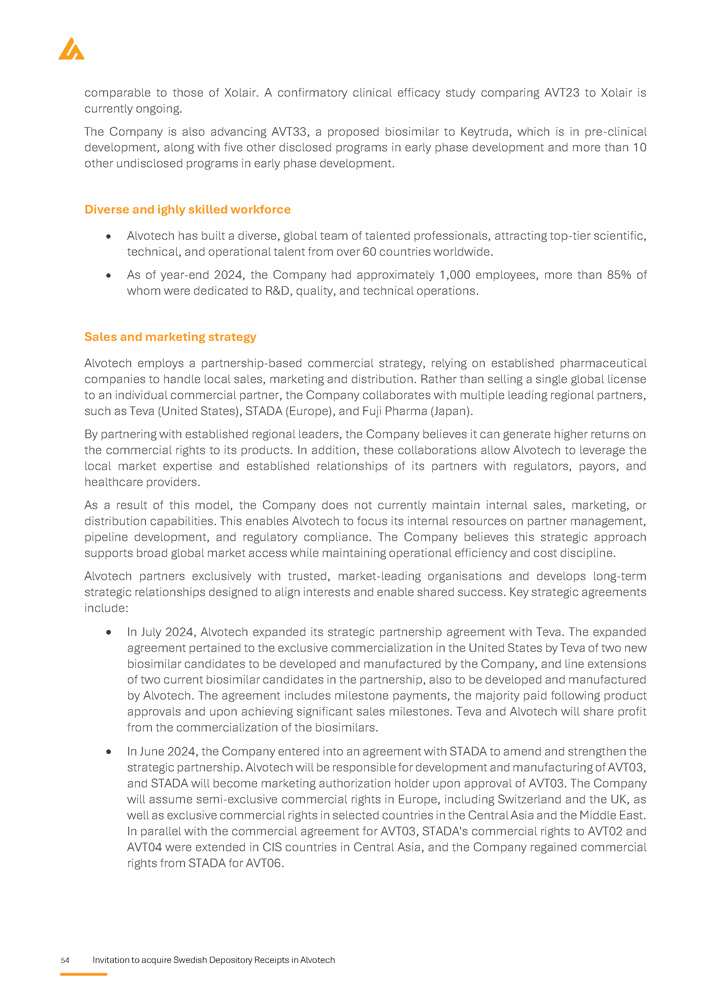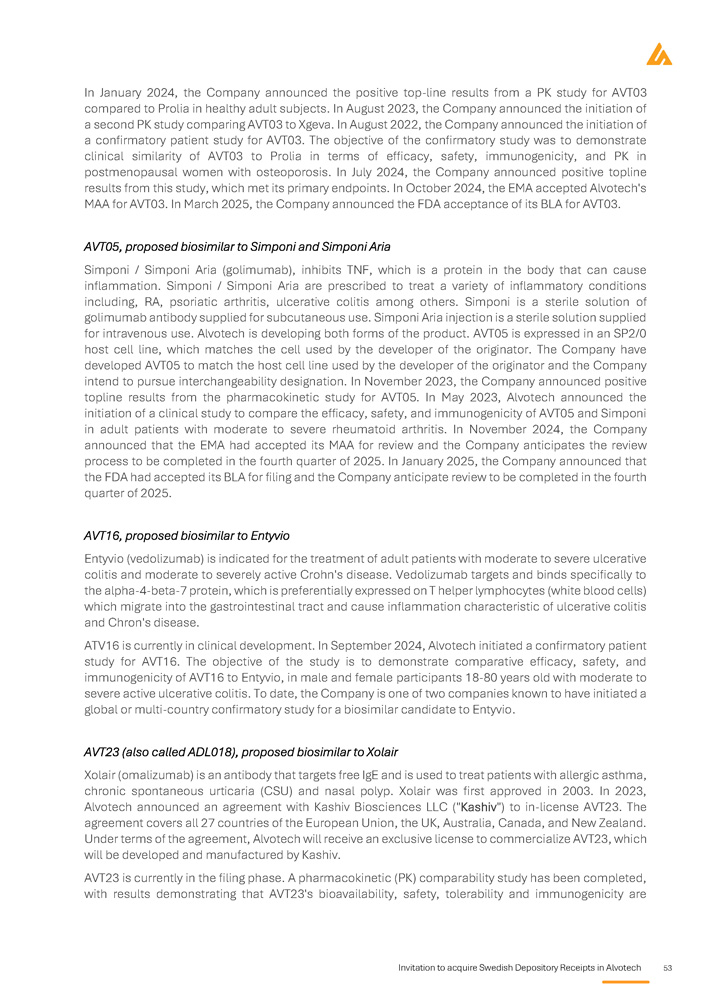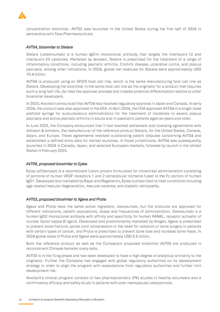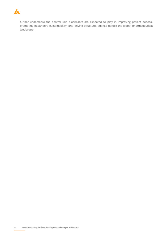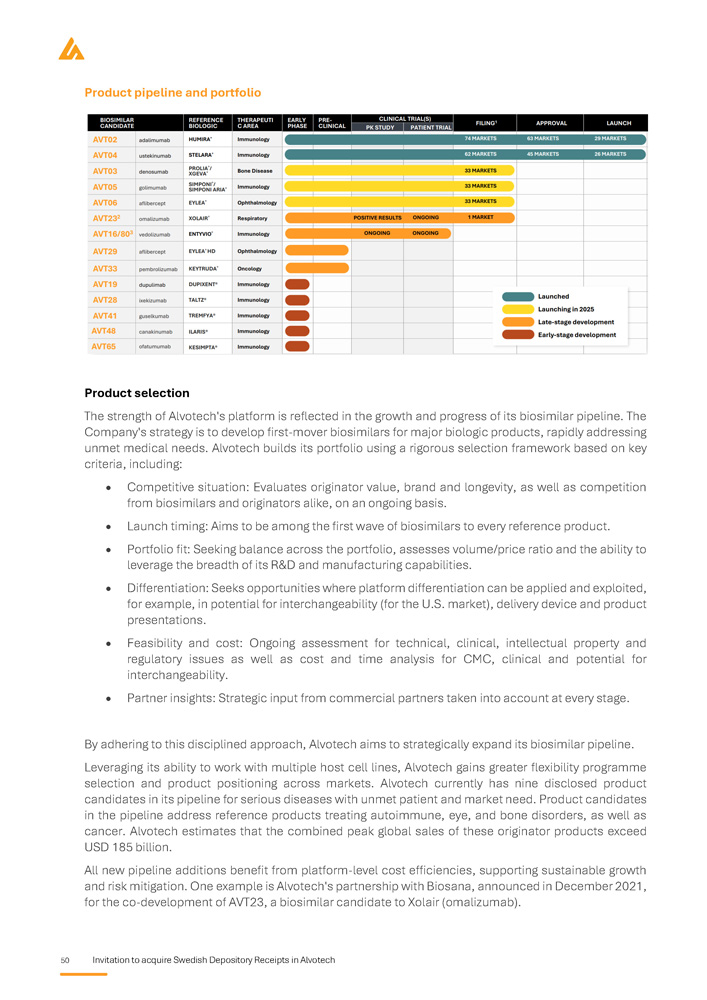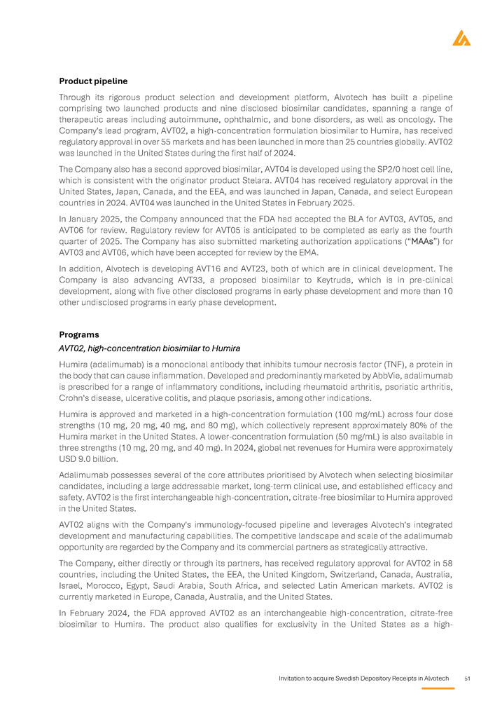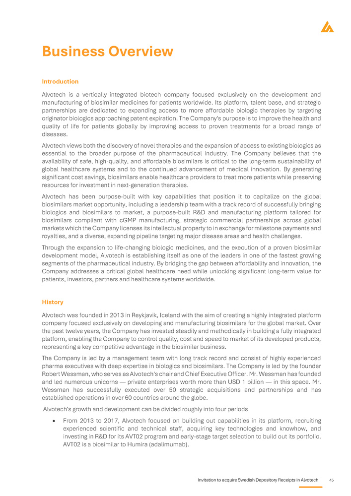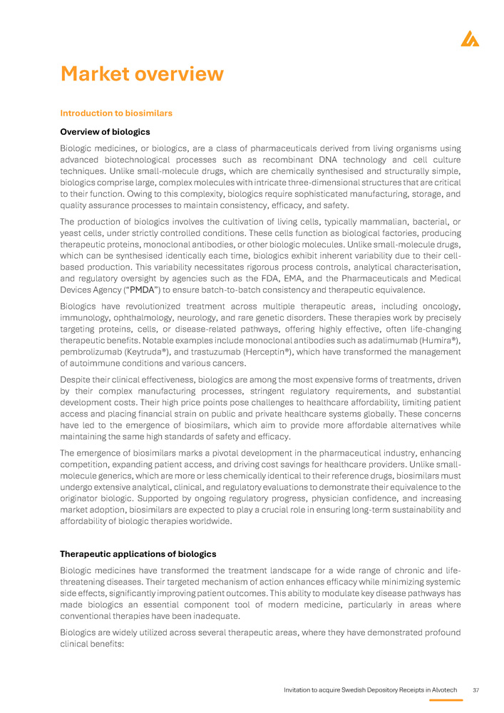 Invitation to acquire Swedish Depository Receipts in Alvotech 37 Market overview Introduction to biosimilars Overview of biologics Biologic medicines, or biologics, are a class of pharmaceuticals derived from living organisms using advanced biotechnological processes such as recombinant DNA technology and cell culture techniques . Unlike small - molecule drugs, which are chemically synthesised and structurally simple, biologics comprise large, complex molecules with intricate three - dimensional structures that are critical to their function . Owing to this complexity, biologics require sophisticated manufacturing, storage, and quality assurance processes to maintain consistency, efficacy, and safety . The production of biologics involves the cultivation of living cells, typically mammalian, bacterial, or yeast cells, under strictly controlled conditions . These cells function as biological factories, producing therapeutic proteins, monoclonal antibodies, or other biologic molecules . Unlike small - molecule drugs, which can be synthesised identically each time, biologics exhibit inherent variability due to their cell - based production . This variability necessitates rigorous process controls, analytical characterisation, and regulatory oversight by agencies such as the FDA, EMA, and the Pharmaceuticals and Medical Devices Agency (“PMDA”) to ensure batch - to - batch consistency and therapeutic equivalence . Biologics have revolutionized treatment across multiple therapeutic areas, including oncology, immunology, ophthalmology, neurology, and rare genetic disorders . These therapies work by precisely targeting proteins, cells, or disease - related pathways, offering highly effective, often life - changing therapeutic benefits . Notable examples include monoclonal antibodies such as adalimumab (Humira®), pembrolizumab (Keytruda®), and trastuzumab (Herceptin®), which have transformed the management of autoimmune conditions and various cancers . Despite their clinical effectiveness, biologics are among the most expensive forms of treatments, driven by their complex manufacturing processes, stringent regulatory requirements, and substantial development costs . Their high price points pose challenges to healthcare affordability, limiting patient access and placing financial strain on public and private healthcare systems globally . These concerns have led to the emergence of biosimilars, which aim to provide more affordable alternatives while maintaining the same high standards of safety and efficacy . The emergence of biosimilars marks a pivotal development in the pharmaceutical industry, enhancing competition, expanding patient access, and driving cost savings for healthcare providers . Unlike small - molecule generics, which are more or less chemically identical to their reference drugs, biosimilars must undergo extensive analytical, clinical, and regulatory evaluations to demonstrate their equivalence to the originator biologic . Supported by ongoing regulatory progress, physician confidence, and increasing market adoption, biosimilars are expected to play a crucial role in ensuring long - term sustainability and affordability of biologic therapies worldwide . Therapeutic applications of biologics Biologic medicines have transformed the treatment landscape for a wide range of chronic and life - threatening diseases . Their targeted mechanism of action enhances efficacy while minimizing systemic side effects, significantly improving patient outcomes . This ability to modulate key disease pathways has made biologics an essential component tool of modern medicine, particularly in areas where conventional therapies have been inadequate . Biologics are widely utilized across several therapeutic areas, where they have demonstrated profound clinical benefits :