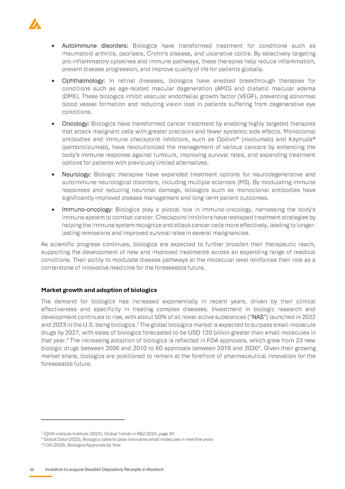 38 Invitation to acquire Swedish Depository Receipts in Alvotech Autoimmune disorders : Biologics have transformed treatment for conditions such as rheumatoid arthritis, psoriasis, Crohn's disease, and ulcerative colitis . By selectively targeting pro - inflammatory cytokines and immune pathways, these therapies help reduce inflammation, prevent disease progression, and improve quality of life for patients globally . Ophthalmology : In retinal diseases, biologics have enabled breakthrough therapies for conditions such as age - related macular degeneration (AMD) and diabetic macular edema (DME) . These biologics inhibit vascular endothelial growth factor (VEGF), preventing abnormal blood vessel formation and reducing vision loss in patients suffering from degenerative eye conditions . Oncology : Biologics have transformed cancer treatment by enabling highly targeted therapies that attack malignant cells with greater precision and fewer systemic side effects . Monoclonal antibodies and immune checkpoint inhibitors, such as Opdivo® (nivolumab) and Keytruda® (pembrolizumab), have revolutionized the management of various cancers by enhancing the body's immune response against tumours, improving survival rates, and expanding treatment options for patients with previously limited alternatives . Neurology : Biologic therapies have expanded treatment options for neurodegenerative and autoimmune neurological disorders, including multiple sclerosis (MS) . By modulating immune responses and reducing neuronal damage, biologics such as monoclonal antibodies have significantly improved disease management and long - term patient outcomes . Immuno - oncology : Biologics play a pivotal role in immuno - oncology, harnessing the body's immune system to combat cancer . Checkpoint inhibitors have reshaped treatment strategies by helping the immune system recognize and attack cancer cells more effectively, leading to longer - lasting remissions and improved survival rates in several malignancies . As scientific progress continues, biologics are expected to further broaden their therapeutic reach, supporting the development of new and improved treatments across an expanding range of medical conditions . Their ability to modulate disease pathways at the molecular level reinforces their role as a cornerstone of innovative medicine for the foreseeable future . Market growth and adoption of biologics The demand for biologics has increased exponentially in recent years, driven by their clinical effectiveness and specificity in treating complex diseases . Investment in biologic research and development continues to rise, with about 50 % of all novel active substances (“NAS”) launched in 2022 and 2023 in the U . S . being biologics . 2 The global biologics market is expected to surpass small - molecule drugs by 2027 , with sales of biologics forecasted to be USD 120 billion greater than small molecules in that year . 3 The increasing adoption of biologics is reflected in FDA approvals, which grew from 23 new biologic drugs between 2006 and 2010 to 60 approvals between 2016 and 2020 4 . Given their growing market share, biologics are positioned to remain at the forefront of pharmaceutical innovation for the foreseeable future . 2 IQVIA institute Institute (2024), Global Trends in R&D 2024, page 34 3 Global Data (2022), Biologics sales to pass innovative small molecules in next five years 4 FDA (2025), Biologics Approvals by Year
