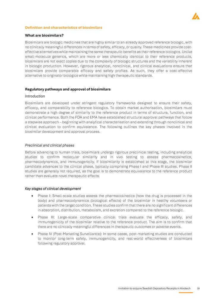 Invitation to acquire Swedish Depository Receipts in Alvotech 39 Definition and characteristics of biosimilars What are biosimilars? Biosimilars are biologic medicines that are highly similar to an already approved reference biologic, with no clinically meaningful differences in terms of safety, efficacy, or quality . These medicines provide cost - effective alternatives while maintaining the same therapeutic benefits as their reference biologics . Unlike small - molecule generics, which are more or less chemically identical to their reference products, biosimilars are not exact copies due to the complexity of biologic structures and the variability inherent in biologic production . However, rigorous analytical, nonclinical, and clinical evaluations ensure that biosimilars provide comparable efficacy and safety profiles . As such, they offer a cost - effective alternative to originator biologics while maintaining high therapeutic standards . Regulatory pathways and approval of biosimilars Introduction Biosimilars are developed under stringent regulatory frameworks designed to ensure their safety, efficacy, and comparability to reference biologics . To obtain market authorisation, biosimilars must demonstrate a high degree of similarity to the reference product in terms of structure, function, and clinical performance . Both the FDA and EMA have established structural approval pathways that follow a stepwise approach – beginning with analytical characterisation and extending through nonclinical and clinical evaluation to confirm equivalence . Th e following outlines the key phases involved in the biosimilar development and approval process . Preclinical and clinical phases Before advancing to human trials, biosimilars undergo rigorous preclinical testing, including analytical studies to confirm molecular similarity and in vivo testing to assess pharmacokinetics, pharmacodynamics, and immunogenicity . If biosimilarity is established at this stage, the biosimilar candidate advances to the clinical phase, typically comprising Phase I and Phase III studies . Phase II studies are generally not required, as the goal is to demonstrate equivalence to the reference product rather than evaluate novel therapeutic effects . Key stages of clinical development Phase I : Small - scale studies assess the pharmacokinetics (how the drug is processed in the body) and pharmacodynamics (biological effects) of the biosimilar in healthy volunteers or patients with the target condition . These studies confirm that there are no significant differences in absorption, distribution, metabolism, and excretion compared to the reference biologic . Phase III : Large - scale comparative clinical trials evaluate the efficacy, safety, and immunogenicity of the biosimilar relative to the reference product . The aim is to confirm that there are no clinically meaningful differences in therapeutic outcomes or adverse events . Phase IV (Post - Marketing Surveillance) : In some cases, post - marketing studies are conducted to monitor long - term safety, immunogenicity, and real - world effectiveness of biosimilars following regulatory approval .