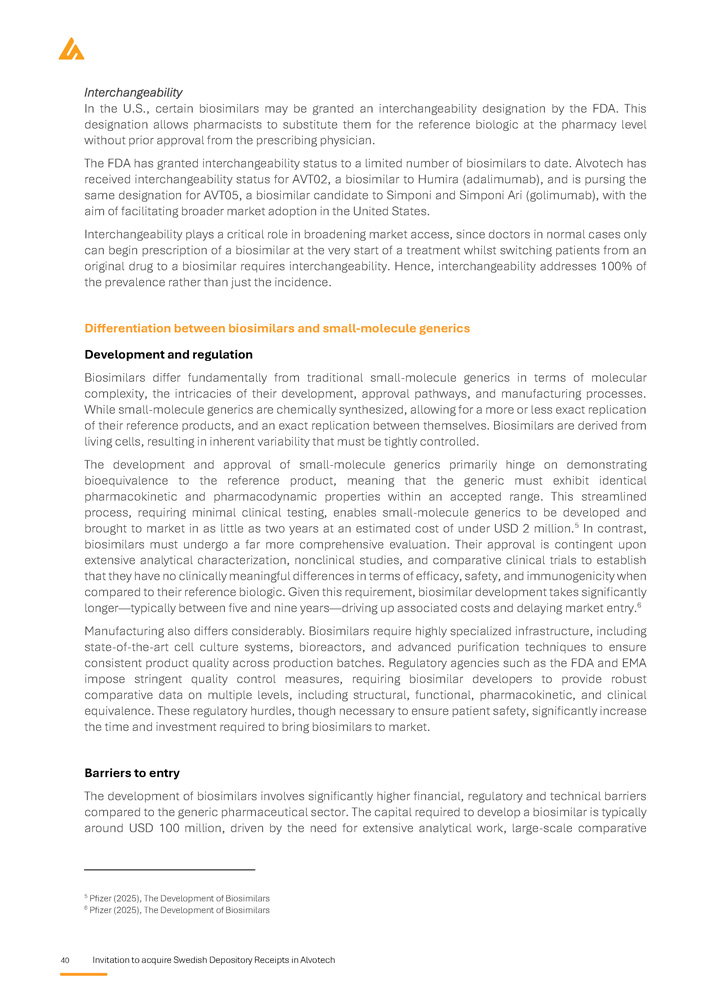 40 Invitation to acquire Swedish Depository Receipts in Alvotech Interchangeability In the U . S . , certain biosimilars may be granted an interchangeability designation by the FDA . This designation allows pharmacists to substitute them for the reference biologic at the pharmacy level without prior approval from the prescribing physician . The FDA has granted interchangeability status to a limited number of biosimilars to date . Alvotech has received interchangeability status for AVT 02 , a biosimilar to Humira (adalimumab), and is pursing the same designation for AVT 05 , a biosimilar candidate to Simponi and Simponi Ari (golimumab), with the aim of facilitating broader market adoption in the United States . Interchangeability plays a critical role in broadening market access, since doctors in normal cases only can begin prescription of a biosimilar at the very start of a treatment whilst switching patients from an original drug to a biosimilar requires interchangeability . Hence, interchangeability addresses 100 % of the prevalence rather than just the incidence . Differentiation between biosimilars and small - molecule generics Development and regulation Biosimilars differ fundamentally from traditional small - molecule generics in terms of molecular complexity, the intricacies of their development, approval pathways, and manufacturing processes . While small - molecule generics are chemically synthesized, allowing for a more or less exact replication of their reference products, and an exact replication between themselves . Biosimilars are derived from living cells, resulting in inherent variability that must be tightly controlled . The development and approval of small - molecule generics primarily hinge on demonstrating bioequivalence to the reference product, meaning that the generic must exhibit identical pharmacokinetic and pharmacodynamic properties within an accepted range . This streamlined process, requiring minimal clinical testing, enables small - molecule generics to be developed and brought to market in as little as two years at an estimated cost of under USD 2 million . 5 In contrast, biosimilars must undergo a far more comprehensive evaluation . Their approval is contingent upon extensive analytical characterization, nonclinical studies, and comparative clinical trials to establish that they have no clinically meaningful differences in terms of efficacy, safety, and immunogenicity when compared to their reference biologic . Given this requirement, biosimilar development takes significantly longer — typically between five and nine years — driving up associated costs and delaying market entry . 6 Manufacturing also differs considerably . Biosimilars require highly specialized infrastructure, including state - of - the - art cell culture systems, bioreactors, and advanced purification techniques to ensure consistent product quality across production batches . Regulatory agencies such as the FDA and EMA impose stringent quality control measures, requiring biosimilar developers to provide robust comparative data on multiple levels, including structural, functional, pharmacokinetic, and clinical equivalence . These regulatory hurdles, though necessary to ensure patient safety, significantly increase the time and investment required to bring biosimilars to market . Barriers to entry The development of biosimilars involves significantly higher financial, regulatory and technical barriers compared to the generic pharmaceutical sector . The capital required to develop a biosimilar is typically around USD 100 million, driven by the need for extensive analytical work, large - scale comparative 5 Pfizer (2025), The Development of Biosimilars 6 Pfizer (2025), The Development of Biosimilars