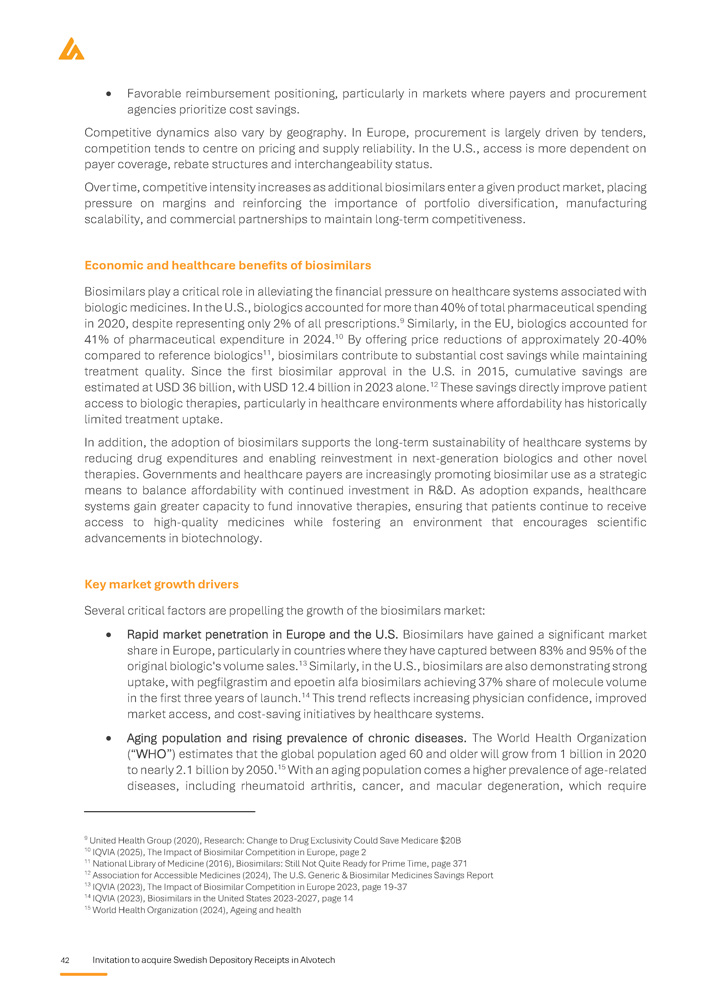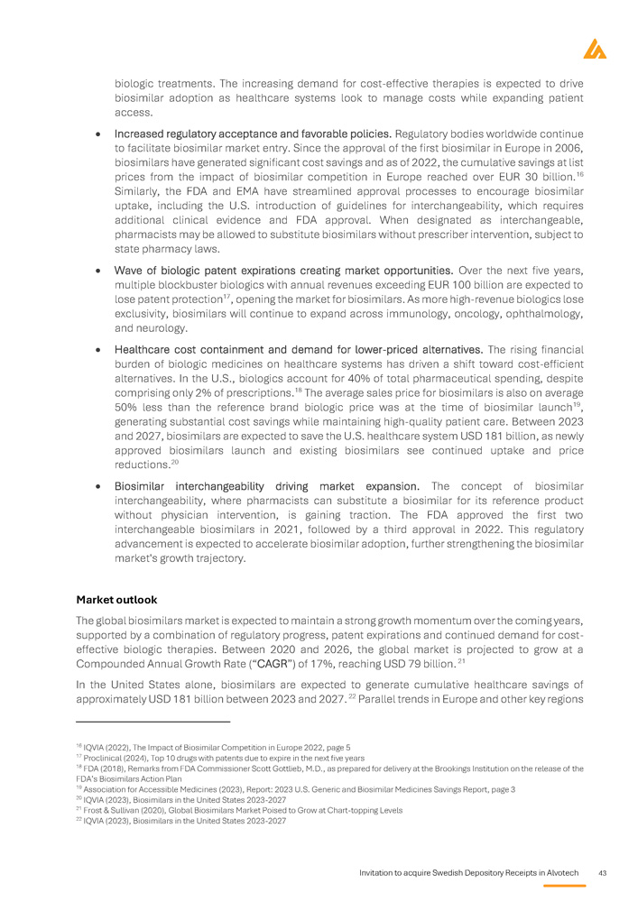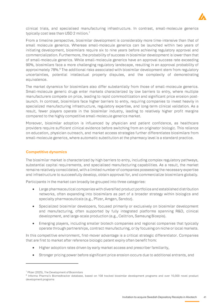 Invitation to acquire Swedish Depository Receipts in Alvotech 41 clinical trials, and specialised manufacturing infrastructure . In contrast, small - molecule generics typically cost less than USD 2 million . 7 From a timeline perspective, biosimilar development is considerably more time - intensive than that of small molecule generics . Whereas small - molecule generics can be launched within two years of initiating development, biosimilars require six to nine years before achieving regulatory approval and commercialization . Furthermore, the probability of success in biosimilar development is lower than that of small - molecule generics . While small - molecule generics have an approval success rate exceeding 90 % , biosimilars face a more challenging regulatory landscape, resulting in an approval probability of approximately 78 % . 8 The additional risks associated with biosimilar development stem from regulatory uncertainties, potential intellectual property disputes, and the complexity of demonstrating equivalence . The market dynamics for biosimilars also differ substantially from those of small - molecule generics . Small - molecule generic drugs enter markets characterized by low barriers to entry, where multiple manufacturers compete on price, leading to rapid commoditization and significant price erosion post - launch . In contrast, biosimilars face higher barriers to entry, requiring companies to invest heavily in specialized manufacturing infrastructure, regulatory expertise, and long - term clinical validation . As a result, fewer players operate in the biosimilar industry, leading to relatively higher profit margins compared to the highly competitive small - molecule generics market . Moreover, biosimilar adoption is influenced by physician and patient confidence, as healthcare providers require sufficient clinical evidence before switching from an originator biologic . This reliance on education, physician outreach, and market access strategies further differentiates biosimilars from small - molecule generics, where automatic substitution at the pharmacy level is a standard practice . Competitive dynamics The biosimilar market is characterized by high barriers to entry, including complex regulatory pathways, substantial capital requirements, and specialised manufacturing capabilities . As a result, the market remains relatively consolidated, with a limited number of companies possessing the necessary expertise and infrastructure to successfully develop, obtain approval for, and commercialize biosimilars globally . Participants in the market can broadly be grouped into three categories : Large pharmaceutical companies with diversified product portfolios and established distribution networks, often expanding into biosimilars as part of a broader strategy within biologics and specialty pharmaceuticals (e . g . , Pfizer, Amgen, Sandoz) . Specialized biosimilar developers, focused primarily or exclusively on biosimilar development and manufacturing, often supported by fully integrated platforms spanning R&D, clinical development, and large - scale production (e . g . , Celltrion, Samsung Bioepis) . Emerging players, including smaller biotech companies and regional companies that typically operate through partnerships, contract manufacturing, or by focusing on niche or local markets . In this competitive environment, first - mover advantage is a critical strategic differentiator . Companies that are first to market after reference biologic patent expiry often benefit from : Higher adoption rates driven by early market access and prescriber familiarity, Stronger pricing power before significant price erosion occurs due to additional entrants, and 7 Pfizer (2025), The Development of Biosimilars 8 Informa Pharma’s Biomedtracker database, based on 108 tracked biosimilar development programs and over 10,000 novel product development programs