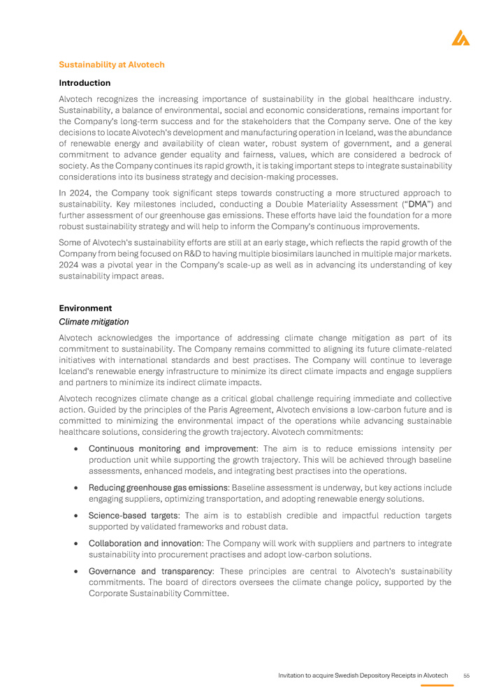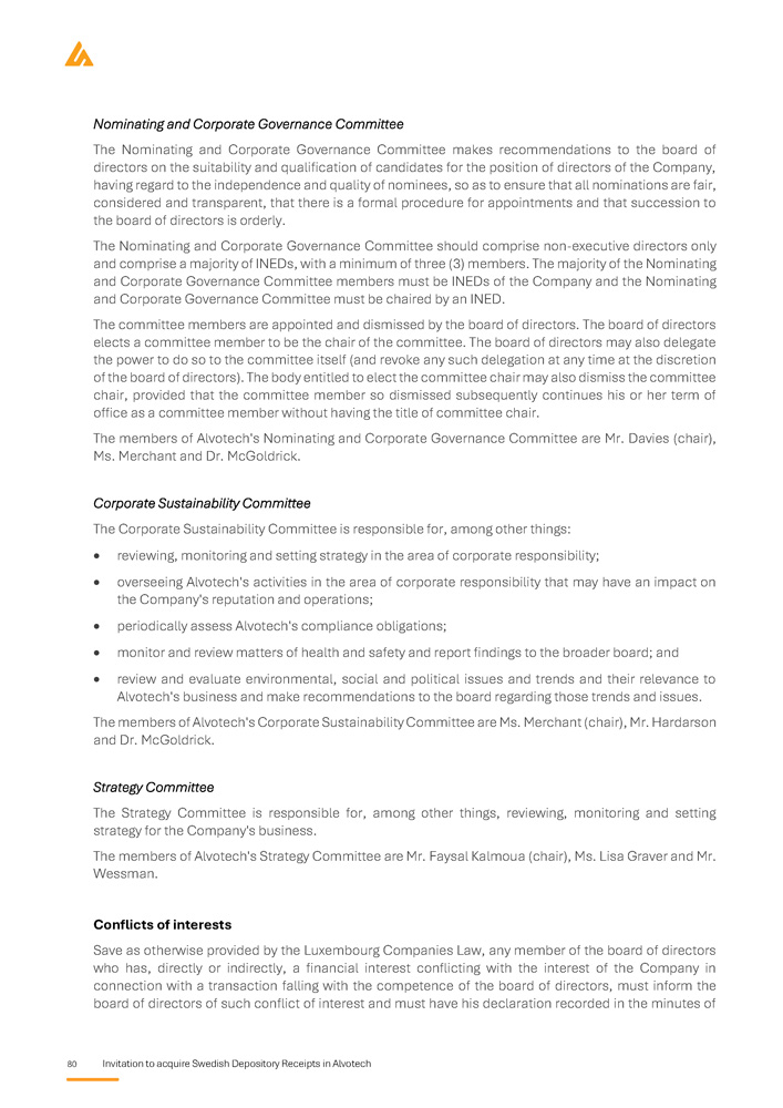 80 Invitation to acquire Swedish Depository Receipts in Alvotech Nominating and Corporate Governance Committee The Nominating and Corporate Governance Committee makes recommendations to the board of directors on the suitability and qualification of candidates for the position of directors of the Company, having regard to the independence and quality of nominees, so as to ensure that all nominations are fair, considered and transparent, that there is a formal procedure for appointments and that succession to the board of directors is orderly . The Nominating and Corporate Governance Committee should comprise non - executive directors only and comprise a majority of INEDs, with a minimum of three ( 3 ) members . The majority of the Nominating and Corporate Governance Committee members must be INEDs of the Company and the Nominating and Corporate Governance Committee must be chaired by an INED . The committee members are appointed and dismissed by the board of directors . The board of directors elects a committee member to be the chair of the committee . The board of directors may also delegate the power to do so to the committee itself (and revoke any such delegation at any time at the discretion of the board of directors) . The body entitled to elect the committee chair may also dismiss the committee chair, provided that the committee member so dismissed subsequently continues his or her term of office as a committee member without having the title of committee chair . The members of Alvotech's Nominating and Corporate Governance Committee are Mr . Davies (chair), Ms . Merchant and Dr . McGoldrick . Corporate Sustainability Committee The Corporate Sustainability Committee is responsible for, among other things: reviewing, monitoring and setting strategy in the area of corporate responsibility; overseeing Alvotech's activities in the area of corporate responsibility that may have an impact on the Company's reputation and operations; periodically assess Alvotech's compliance obligations; monitor and review matters of health and safety and report findings to the broader board; and review and evaluate environmental, social and political issues and trends and their relevance to Alvotech's business and make recommendations to the board regarding those trends and issues. The members of Alvotech's Corporate Sustainability Committee are Ms . Merchant (chair), Mr . Hardarson and Dr . McGoldrick . Strategy Committee The Strategy Committee is responsible for, among other things, reviewing, monitoring and setting strategy for the Company's business. The members of Alvotech's Strategy Committee are Mr. Faysal Kalmoua (chair), Ms. Lisa Graver and Mr. Wessman. Conflicts of interests Save as otherwise provided by the Luxembourg Companies Law, any member of the board of directors who has, directly or indirectly, a financial interest conflicting with the interest of the Company in connection with a transaction falling with the competence of the board of directors, must inform the board of directors of such conflict of interest and must have his declaration recorded in the minutes of
