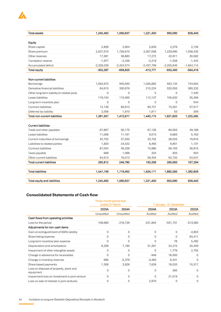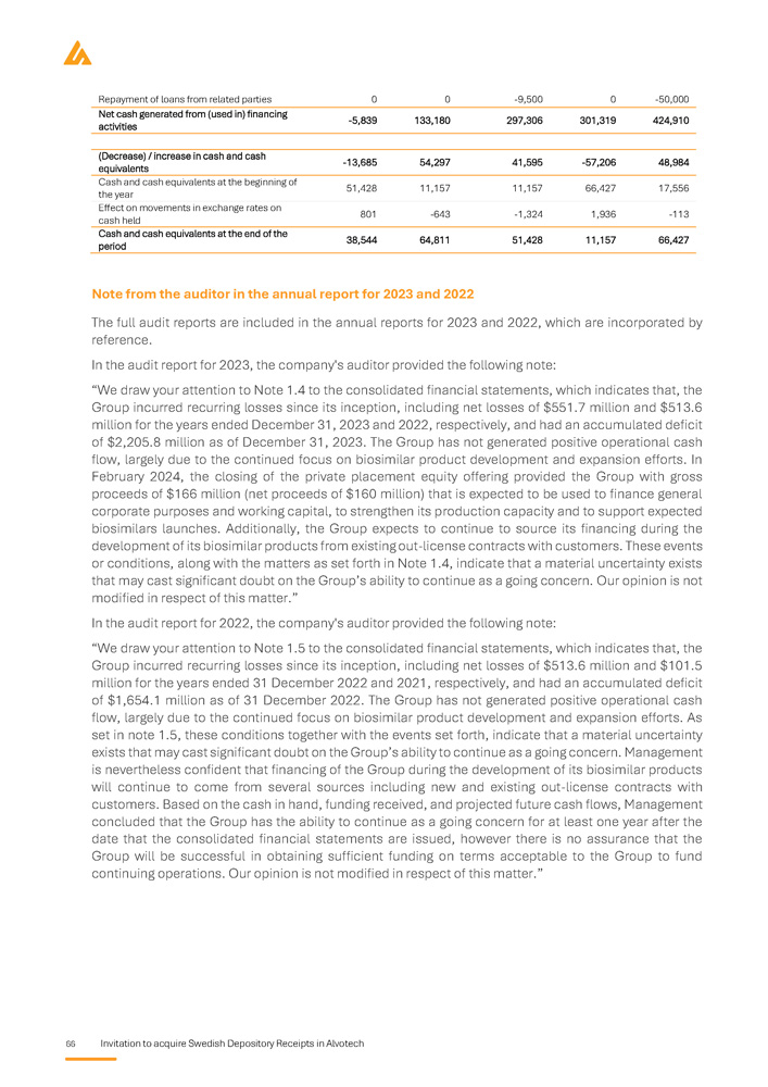 Invitation to acquire Swedish Depository Receipts in Alvotech 5 1,245,462 828,443 950,090 1,221,400 Total assets - 302,287 - 564,416 - 932,493 - 412,771 Total equity 1,281,937 1,225,565 1,621,633 1,440,775 Total non - current liabilities 265,812 167,294 260,950 193,396 Total current liabilities period March orporated of . 1,245,462 Three - month ended 31 2025A Unaudited 12,549 - 20,395 - 5,839 , which are inc provided a note n of going concern 828,443 ember 2022A Audited - 312,389 - 63,537 424,910 r 2023 and 2022 ny's auditor has the assumptio 950,090 ash flow items thousands uary - 31 Dec 2023A Audited - 312,185 - 46,340 301,319 3 and 2022 l report fo , the Compa tor related to 1,221,400 Selected c USD in 1 Jan 2024A Audited ies - 236,843 ies - 18,868 s 297,306 ual report for 202 ded in the annua r 2023 and 2022 al uncertainty fac Total Equity and liabilities Net cash used in operating activit Net cash used in investing activit Cash flow from financing activitie Note from the auditor in the ann The full audit reports are inclu reference . In the audit report fo significance regarding a materi Specific key risks for the issuer What are the key risks that are specific to the issuer? Prior to any investment decision, it is important to carefully analyze the risk factors that are deemed to be Significant material for Alvotech. These include, inter alia, the following risks: risk factors If the Company's competitors successfully delay or limit biosimilar market entry, Alvotech may face significant challenges in capturing market shares or delivering on projected timelines . The competitive pressure could have a potential impact on Alvotech's business, financial position, and operations . Alvotech is dependent on its partners for the commercialization of its biosimilar products candidates in certain major markets, and their failure to achieve sufficient market penetration could have a material adverse effect on revenue and the Company may struggle to recover its investments, delaying or preventing profitability . If Alvotech is unable to secure favorable pricing and reimbursement terms due to downward pricing, revenue generation may be limited, and competition among biosimilars within the same reference product class may drive price erosion, reducing profitability and limiting the Company's ability to invest in future development, which can have an impact on financial and operational performance . Alvotech's operational and financial results are subject to concentration risk, where its success will depend significantly on the development of a limited number of product candidates, their regulatory approval in a limited number of jurisdictions and their commercialization by a limited number of commercial partners . Unfavorable conditions for the Company's products would severely affect operations . Alvotech will likely require substantial additional capital to fund operations, ongoing clinical development, regulatory processes, and commercial launches . This additional funding may not be available at favourable terms or at all . If additional funding is unavailable, the Company may be forced to delay or abandon product development efforts, which would directly impact its growth trajectory . Alvotech is operating in a highly regulated environment which varies significantly across jurisdictions and impact market entry timelines and commercialization strategies . The encountering of regulatory discrepancies across markets may lead to delayed product launches, increased compliance costs, and missed revenue opportunities . Alvotech may be unable to generate sufficient cash flow to satisfy its significant debt service obligations which could severely impact its financial position and operational capabilities . Alvotech relies on third parties to conduct its nonclinical and clinical studies, to manufacture aspects of clinical and commercial supplies of its product candidates, and to store critical components of its product candidates . If these third parties do not successfully carry out their contractual duties, or are not compliant with regulatory requirements, Alvotech may not be able to obtain regulatory approval for or commercialize its product candidates . Alvotech’s two largest shareholders own approximately 63 . 3 % of its ordinary shares, giving them significant control over key decisions that require shareholder approval . Their influence can override specific to the issuer