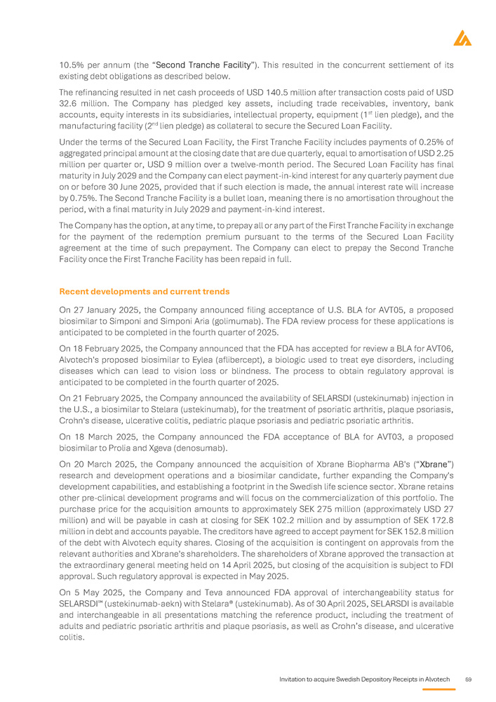 Invitation to acquire Swedish Depository Receipts in Alvotech 69 10.5% per annum (the “Second Tranche Facility”). This resulted in the concurrent settlement of its existing debt obligations as described below. The refinancing resulted in net cash proceeds of USD 140.5 million after transaction costs paid of USD 32 . 6 million . The Company has pledged key assets, including trade receivables, inventory, bank accounts, equity interests in its subsidiaries, intellectual property, equipment ( 1 st lien pledge), and the manufacturing facility ( 2 nd lien pledge) as collateral to secure the Secured Loan Facility . Under the terms of the Secured Loan Facility, the First Tranche Facility includes payments of 0 . 25 % of aggregated principal amount at the closing date that are due quarterly, equal to amortisation of USD 2 . 25 million per quarter or, USD 9 million over a twelve - month period . The Secured Loan Facility has final maturity in July 2029 and the Company can elect payment - in - kind interest for any quarterly payment due on or before 30 June 2025 , provided that if such election is made, the annual interest rate will increase by 0 . 75 % . The Second Tranche Facility is a bullet loan, meaning there is no amortisation throughout the period, with a final maturity in July 2029 and payment - in - kind interest . The Company has the option, at any time, to prepay all or any part of the First Tranche Facility in exchange for the payment of the redemption premium pursuant to the terms of the Secured Loan Facility agreement at the time of such prepayment . The Company can elect to prepay the Second Tranche Facility once the First Tranche Facility has been repaid in full . Recent developments and current trends On 27 January 2025 , the Company announced filing acceptance of U . S . BLA for AVT 05 , a proposed biosimilar to Simponi and Simponi Aria (golimumab) . The FDA review process for these applications is anticipated to be completed in the fourth quarter of 2025 . On 18 February 2025 , the Company announced that the FDA has accepted for review a BLA for AVT 06 , Alvotech's proposed biosimilar to Eylea (aflibercept), a biologic used to treat eye disorders, including diseases which can lead to vision loss or blindness . The process to obtain regulatory approval is anticipated to be completed in the fourth quarter of 2025 . On 21 February 2025 , the Company announced the availability of SELARSDI (ustekinumab) injection in the U . S . , a biosimilar to Stelara (ustekinumab), for the treatment of psoriatic arthritis, plaque psoriasis, Crohn's disease, ulcerative colitis, pediatric plaque psoriasis and pediatric psoriatic arthritis . On 18 March 2025 , the Company announced the FDA acceptance of BLA for AVT 03 , a proposed biosimilar to Prolia and Xgeva (denosumab) . On 20 March 2025 , the Company announced the acquisition of Xbrane Biopharma AB's (“Xbrane”) research and development operations and a biosimilar candidate, further expanding the Company's development capabilities, and establishing a footprint in the Swedish life science sector . Xbrane retains other pre - clinical development programs and will focus on the commercialization of this portfolio . The purchase price for the acquisition amounts to approximately SEK 275 million (approximately USD 27 million) and will be payable in cash at closing for SEK 102 . 2 million and by assumption of SEK 172 . 8 million in debt and accounts payable . The creditors have agreed to accept payment for SEK 152 . 8 million of the debt with Alvotech equity shares . Closing of the acquisition is contingent on approvals from the relevant authorities and Xbrane's shareholders . The shareholders of Xbrane approved the transaction at the extraordinary general meeting held on 14 April 2025 , but closing of the acquisition is subject to FDI approval . Such regulatory approval is expected in May 2025 . On 5 May 2025 , the Company and Teva announced FDA approval of interchangeability status for SELARSDI (ustekinumab - aekn) with Stelara® (ustekinumab) . As of 30 April 2025 , SELARSDI is available and interchangeable in all presentations matching the reference product, including the treatment of adults and pediatric psoriatic arthritis and plaque psoriasis, as well as Crohn’s disease, and ulcerative colitis .