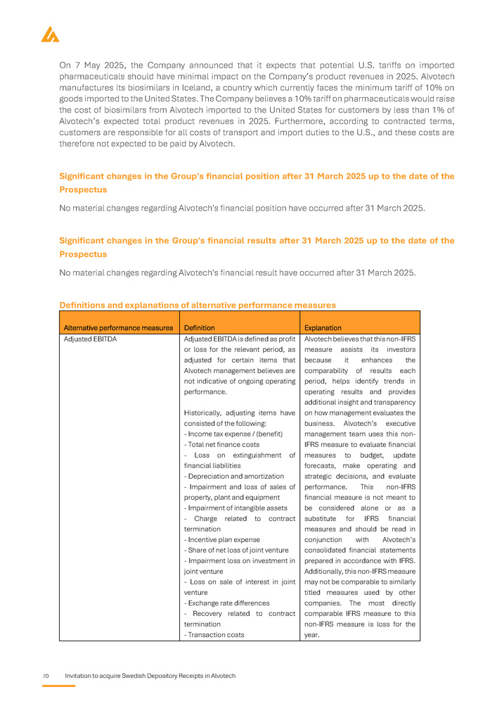 70 Invitation to acquire Swedish Depository Receipts in Alvotech On 7 May 2025 , the Company announced that it expects that potential U . S . tariffs on imported pharmaceuticals should have minimal impact on the Company’s product revenues in 2025 . Alvotech manufactures its biosimilars in Iceland, a country which currently faces the minimum tariff of 10 % on goods imported to the United States . The Company believes a 10 % tariff on pharmaceuticals would raise the cost of biosimilars from Alvotech imported to the United States for customers by less than 1 % of Alvotech’s expected total product revenues in 2025 . Furthermore, according to contracted terms, customers are responsible for all costs of transport and import duties to the U . S . , and these costs are therefore not expected to be paid by Alvotech . Significant changes in the Group's financial position after 31 March 2025 up to the date of the Prospectus No material changes regarding Alvotech's financial position have occurred after 31 March 2025. Significant changes in the Group's financial results after 31 March 2025 up to the date of the Prospectus No material changes regarding Alvotech's financial result have occurred after 31 March 2025. Definitions and explanations of alternative performance measures Explanation Definition Alternative performance measures Alvotech believes that this non - IFRS measure assists its investors because it enhances the comparability of results each period, helps identify trends in operating results and provides additional insight and transparency on how management evaluates the business . Alvotech’s executive management team uses this non - IFRS measure to evaluate financial measures to budget, update forecasts, make operating and strategic decisions, and evaluate performance . This non - IFRS financial measure is not meant to be considered alone or as a substitute for IFRS financial measures and should be read in conjunction with Alvotech’s consolidated financial statements prepared in accordance with IFRS . Additionally, this non - IFRS measure may not be comparable to similarly titled measures used by other companies . The most directly comparable IFRS measure to this non - IFRS measure is loss for the year . Adjusted EBITDA is defined as profit or loss for the relevant period, as adjusted for certain items that Alvotech management believes are not indicative of ongoing operating performance . Historically, adjusting items have consisted of the following: - Income tax expense / (benefit) - Total net finance costs - Loss on extinguishment of financial liabilities - Depreciation and amortization - Impairment and loss of sales of property, plant and equipment - Impairment of intangible assets - Charge related to contract termination - Incentive plan expense - Share of net loss of joint venture - Impairment loss on investment in joint venture - Loss on sale of interest in joint venture - Exchange rate differences - Recovery related to contract termination - Transaction costs Adjusted EBITDA