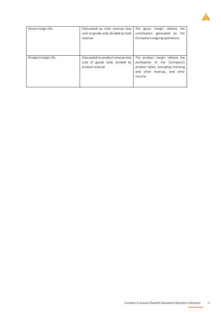 Invitation to acquire Swedish Depository Receipts in Alvotech 71 The gross margin reflects the contribution generated by the Company's ongoing operations. Calculated as total revenue less cost of goods sold, divided by total revenue Gross margin (%) The product margin reflects the profitability of the Company's product sales, excluding licensing and other revenue, and other income Calculated as product revenue less cost of goods sold, divided by product revenue Product margin (%)