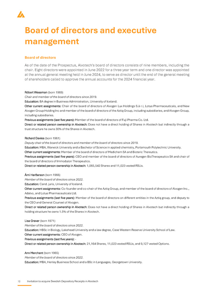 72 Invitation to acquire Swedish Depository Receipts in Alvotech Board of directors and executive management Board of directors As of the date of the Prospectus, Alvotech's board of directors consists of nine members, including the chair . Eight directors were appointed in June 2022 for a three year term and one director was appointed at the annual general meeting held in June 2024 , to serve as director until the end of the general meeting of shareholders called to approve the annual accounts for the 2024 financial year . Róbert Wessman (born 1969) Chair and member of the board of directors since 2019. Education: BA degree in Business Administration, University of Iceland. Other current assignments : Chair of the board of directors of Alvogen Lux Holdings S . à r . l, Lotus Pharmaceuticals, and New Alvogen Group Holding Inc and member of the board of directors of the Aztiq Group, including subsidiaries, and Alvogen Group, including subsidiaries . Previous assignments (last five years) : Member of the board of directors of Fuji Pharma Co . Ltd . Direct or related person ownership in Alvotech : Does not have a direct holding of Shares in Alvotech but indirectly through a trust structure he owns 30 % of the Shares in Alvotech . Richard Davies (born 1961) Deputy chair of the board of directors and member of the board of directors since 2019. Education: MBA, Warwick University and a Bachelor of Science in applied chemistry, Portsmouth Polytechnic University. Other current assignments: Member of the board of directors of Medichem SA and Bioteric Thereutics. Previous assignments (last five years): CEO and member of the board of directors of Auregen BioTherapeutics SA and chair of the board of directors of Immodulon Therapeutics. Direct or related person ownership in Alvotech: 1,065,542 Shares and 11,023 vested RSUs. Árni Harðarson (born 1966) Member of the board of directors since 2022. Education: Cand. juris, University of Iceland. Other current assignments: Co - founder and co - chair of the Aztiq Group, and member of the board of directors of Alvogen Inc., Adalvo, and Lotus Pharmaceuticals Ltd. Previous assignments (last five years): Member of the board of directors on different entities in the Aztiq group, and deputy to the CEO and General Counsel of Alvogen. Direct or related person ownership in Alvotech: Does not have a direct holding of Shares in Alvotech but indirectly through a holding structure he owns 1.5% of the Shares in Alvotech. Lisa Graver (born 1971) Member of the board of directors since 2022. Education: HBSc in Biology, Lakehead University and a law degree, Case Western Reserve University School of Law. Other current assignments: CEO of Alvogen. Previous assignments (last five years): - Direct or related person ownership in Alvotech: 21,164 Shares, 11,023 vested RSUs, and 9,127 vested Options. Ann Merchant (born 1965) Member of the board of directors since 2022. Education: MBA, Henley Business School and a BSc in Languages, Georgetown University.