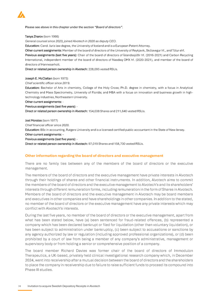 74 Invitation to acquire Swedish Depository Receipts in Alvotech Please see above in this chapter under the section “Board of directors”. Tanya Zharov (born 1966) General counsel since 2023, joined Alvotech in 2020 as deputy CEO. Education: Cand. Juris law degree, the University of Iceland and is a European Patent Attorney. Other current assignments: Member of the board of directors of the University of Reykjavik, Skólavegur hf., and Tölur ehf. Previous assignments (last five years): Chair of the board of directors of Íslandssjóðir hf. (2016 - 2021) and Carbon Recycling International, independent member of the board of directors of Nasdaq OMX hf. (2020 - 2021), and member of the board of directors of Hannesarholt. Direct or related person ownership in Alvotech: 228,095 vested RSUs. Joseph E . McClellan (born 1973 ) Chief scientific officer since 2019 . Education : Bachelor of Arts in chemistry, College of the Holy Cross ; Ph . D . degree in chemistry, with a focus in Analytical Chemistry and Mass Spectrometry, University of Florida ; and MBA with a focus on innovation and business growth in high - technology industries, Northeastern University . Other current assignments: - Previous assignments (last five years): - Direct or related person ownership in Alvotech: 154,038 Shares and 211,640 vested RSUs. Joel Morales (born 1977) Chief financial officer since 2020. Education: BSc in accounting, Rutgers University and is a licensed certified public accountant in the State of New Jersey. Other current assignments: - Previous assignments (last five years): - Direct or related person ownership in Alvotech: 97,019 Shares and 158,730 vested RSUs. Other information regarding the board of directors and executive management There are no family ties between any of the members of the board of directors or the executive management . The members of the board of directors and the executive management have private interests in Alvotech through their holdings of shares and other financial instruments . In addition, Alvotech aims to commit the members of the board of directors and the executive management to Alvotech's and its shareholders' interests through different remuneration forms, including remuneration in the form of Shares in Alvotech . Members of the board of directors and the executive management in Alvotech may be board members and executives in other companies and have shareholdings in other companies . In addition to the stated, no member of the board of directors or the executive management have any private interests which may conflict with Alvotech's interests . During the last five years, no member of the board of directors or the executive management, apart from what has been stated below, have (a) been sentenced for fraud - related offences, (b) represented a company which has been declared bankrupt or filed for liquidation (other than voluntary liquidation), or has been subject to administration under bankruptcy, (c) been subject to accusations or sanctions by any agency authorized by law or regulation (including approved professional organizations), or (d) been prohibited by a court of law from being a member of any company's administrative, management or supervisory body or from holding a senior or comprehensive position of a company . The board member Richard Davies was former chair of the board of directors of Immodulon Therapeutics, a UK - based, privately held clinical investigational research company which, in December 2024 , went into receivership after a mutual decision between the board of directors and the shareholders to place the company in receivership due to failure to raise sufficient funds to proceed its compound into Phase III studies .