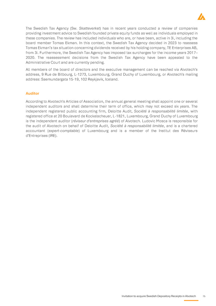 Invitation to acquire Swedish Depository Receipts in Alvotech 75 The Swedish Tax Agency (Sw . Skatteverket ) has in recent years conducted a review of companies providing investment advice to Swedish founded private equity funds as well as individuals employed in these companies . The review has included individuals who are, or have been, active in 3 i, including the board member Tomas Ekman . In this context, the Swedish Tax Agency decided in 2023 to reassess Tomas Ekman’s tax situation concerning dividends received by his holding company, TE Enterprises AB, from 3 i . Furthermore, the Swedish Tax Agency has imposed tax surcharges for the income years 2017 – 2020 . The reassessment decisions from the Swedish Tax Agency have been appealed to the Administrative Court and are currently pending . All members of the board of directors and the executive management can be reached via Alvotech's address, 9 Rue de Bitbourg, L - 1273 , Luxembourg, Grand Duchy of Luxembourg, or Alvotech's mailing address : Saemundargata 15 - 19 , 102 Reykjavik, Iceland . Auditor According to Alvotech's Articles of Association, the annual general meeting shall appoint one or several independent auditors and shall determine their term of office, which may not exceed six years . The independent registered public accounting firm, Deloitte Audit, Société à responsabilité limitée , with registered office at 20 Boulevard de Kockelscheuer, L - 1821 , Luxembourg, Grand Duchy of Luxembourg is the independent auditor ( réviseur d'entreprises agréé ) of Alvotech . Ludovic Mosca is responsible for the audit of Alvotech on behalf of Deloitte Audit, Société à responsabilité limitée , and is a chartered accountant ( expert - comptable ) of Luxembourg and is a member of the Institut des Réviseurs d'Entreprises (IRE) .