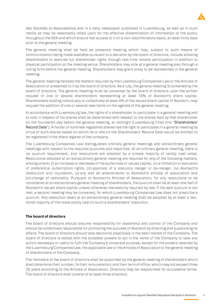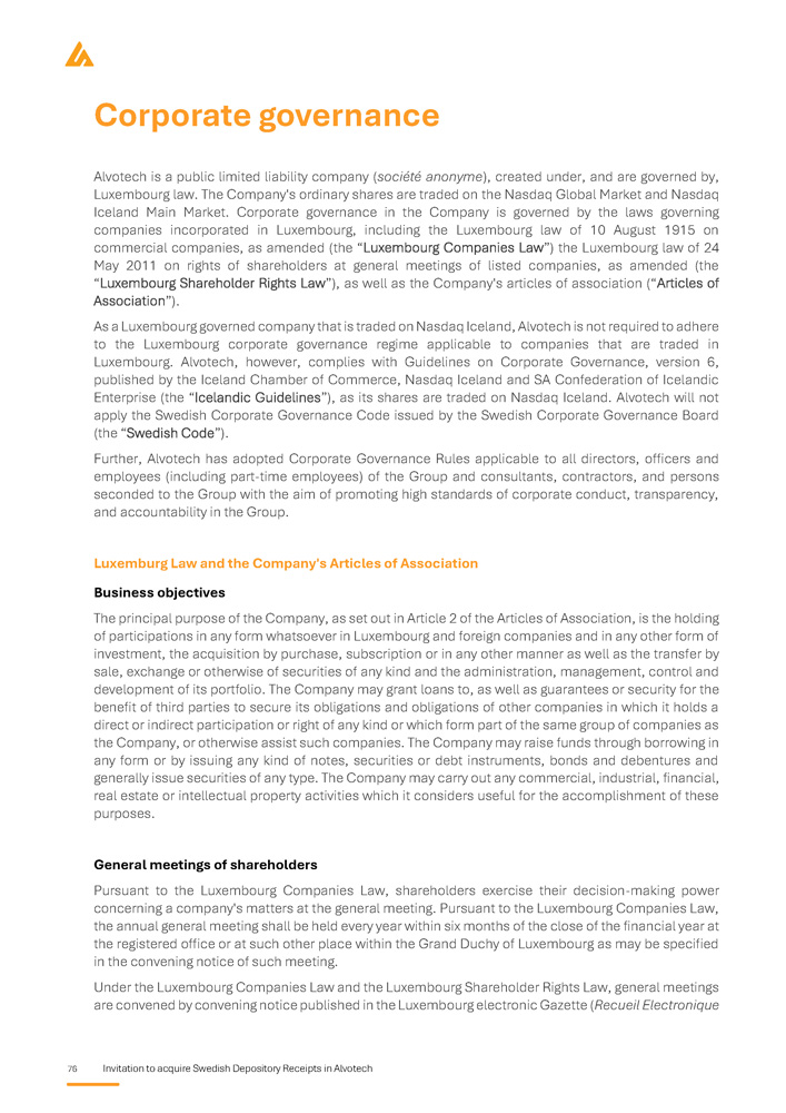76 Invitation to acquire Swedish Depository Receipts in Alvotech Corporate governance Alvotech is a public limited liability company ( société anonyme ), created under, and are governed by, Luxembourg law . The Company's ordinary shares are traded on the Nasdaq Global Market and Nasdaq Iceland Main Market . Corporate governance in the Company is governed by the laws governing companies incorporated in Luxembourg, including the Luxembourg law of 10 August 1915 on commercial companies, as amended (the “Luxembourg Companies Law”) the Luxembourg law of 24 May 2011 on rights of shareholders at general meetings of listed companies, as amended (the “Luxembourg Shareholder Rights Law”), as well as the Company's articles of association (“Articles of Association”) . As a Luxembourg governed company that is traded on Nasdaq Iceland, Alvotech is not required to adhere to the Luxembourg corporate governance regime applicable to companies that are traded in Luxembourg . Alvotech, however, complies with Guidelines on Corporate Governance, version 6 , published by the Iceland Chamber of Commerce, Nasdaq Iceland and SA Confederation of Icelandic Enterprise (the “Icelandic Guidelines”), as its shares are traded on Nasdaq Iceland . Alvotech will not apply the Swedish Corporate Governance Code issued by the Swedish Corporate Governance Board (the “Swedish Code”) . Further, Alvotech has adopted Corporate Governance Rules applicable to all directors, officers and employees (including part - time employees) of the Group and consultants, contractors, and persons seconded to the Group with the aim of promoting high standards of corporate conduct, transparency, and accountability in the Group . Luxemburg Law and the Company's Articles of Association Business objectives The principal purpose of the Company, as set out in Article 2 of the Articles of Association, is the holding of participations in any form whatsoever in Luxembourg and foreign companies and in any other form of investment, the acquisition by purchase, subscription or in any other manner as well as the transfer by sale, exchange or otherwise of securities of any kind and the administration, management, control and development of its portfolio . The Company may grant loans to, as well as guarantees or security for the benefit of third parties to secure its obligations and obligations of other companies in which it holds a direct or indirect participation or right of any kind or which form part of the same group of companies as the Company, or otherwise assist such companies . The Company may raise funds through borrowing in any form or by issuing any kind of notes, securities or debt instruments, bonds and debentures and generally issue securities of any type . The Company may carry out any commercial, industrial, financial, real estate or intellectual property activities which it considers useful for the accomplishment of these purposes . General meetings of shareholders Pursuant to the Luxembourg Companies Law, shareholders exercise their decision - making power concerning a company's matters at the general meeting . Pursuant to the Luxembourg Companies Law, the annual general meeting shall be held every year within six months of the close of the financial year at the registered office or at such other place within the Grand Duchy of Luxembourg as may be specified in the convening notice of such meeting . Under the Luxembourg Companies Law and the Luxembourg Shareholder Rights Law, general meetings are convened by convening notice published in the Luxembourg electronic Gazette ( Recueil Electronique