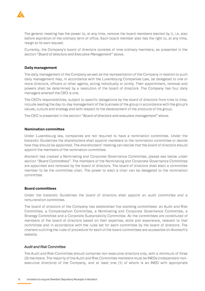 78 Invitation to acquire Swedish Depository Receipts in Alvotech The general meeting has the power to, at any time, remove the board members elected by it, i . e . also before expiration of the ordinary term of office . Each board member also has the right to, at any time, resign at its own request . Currently, the Company's board of directors consists of nine ordinary members, as presented in the section “ Board of directors and Executive Management ” above . Daily management The daily management of the Company as well as the representation of the Company in relation to such daily management may, in accordance with the Luxembourg Companies Law, be delegated to one or more directors, officers or other agents, acting individually or jointly . Their appointment, removal and powers shall be determined by a resolution of the board of directors . The Company has four daily managers whereof the CEO is one . The CEO's responsibilities, subject to specific delegations by the board of directors from time to time, include leading the day - to - day management of the business of the group in accordance with the group's values, culture and strategy and with respect to the development of the products of the group . The CEO is presented in the section “ Board of directors and executive management ” above . Nomination committee Under Luxembourg law, companies are not required to have a nomination committee . Under the Icelandic Guidelines the shareholders shall appoint members to the nomination committee or decide how they should be appointed . The shareholders’ meeting can decide that the board of directors should appoint the members of the nomination committee . Alvotech has created a Nominating and Corporate Governance Committee, please see below under section “ Board Committees ” . The members of the Nominating and Corporate Governance Committee are appointed and removed by the board of directors . The board of directors shall elect a committee member to be the committee chair . The power to elect a chair can be delegated to the nomination committee . Board committees Under the Icelandic Guidelines the board of directors shall appoint an audit committee and a remuneration committee . The board of directors of the Company has established five standing committees : an Audit and Risk Committee, a Compensation Committee, a Nominating and Corporate Governance Committee, a Strategy Committee and a Corporate Sustainability Committee . All the committees are constituted of members of the board of directors based on their expertise, skills and experience, relevant to that committee and in accordance with the rules set for each committee by the board of directors . The charters outlining the rules of procedure for each of the board committees are accessible on Alvotech’s website . Audit and Risk Committee The Audit and Risk Committee should comprise non - executive directors only, with a minimum of three (3) members. The majority of the Audit and Risk Committee members must be INEDs (independent non - executive directors) of the Company, and at least one (1) of whom is an INED with appropriate