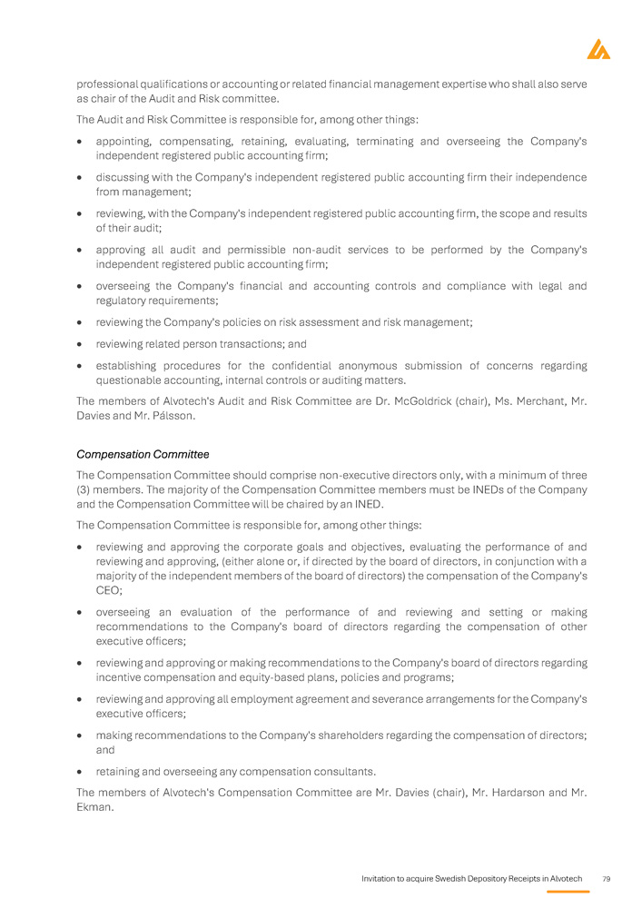Invitation to acquire Swedish Depository Receipts in Alvotech 79 professional qualifications or accounting or related financial management expertise who shall also serve as chair of the Audit and Risk committee. The Audit and Risk Committee is responsible for, among other things: appointing, compensating, retaining, evaluating, terminating and overseeing the Company's independent registered public accounting firm; discussing with the Company's independent registered public accounting firm their independence from management; reviewing, with the Company's independent registered public accounting firm, the scope and results of their audit; approving all audit and permissible non - audit services to be performed by the Company's independent registered public accounting firm; overseeing the Company's financial and accounting controls and compliance with legal and regulatory requirements; reviewing the Company's policies on risk assessment and risk management; reviewing related person transactions; and establishing procedures for the confidential anonymous submission of concerns regarding questionable accounting, internal controls or auditing matters. The members of Alvotech's Audit and Risk Committee are Dr. McGoldrick (chair), Ms. Merchant, Mr. Davies and Mr. Pálsson. Compensation Committee The Compensation Committee should comprise non - executive directors only, with a minimum of three (3) members. The majority of the Compensation Committee members must be INEDs of the Company and the Compensation Committee will be chaired by an INED. The Compensation Committee is responsible for, among other things: reviewing and approving the corporate goals and objectives, evaluating the performance of and reviewing and approving, (either alone or, if directed by the board of directors, in conjunction with a majority of the independent members of the board of directors) the compensation of the Company's CEO ; overseeing an evaluation of the performance of and reviewing and setting or making recommendations to the Company's board of directors regarding the compensation of other executive officers ; reviewing and approving or making recommendations to the Company's board of directors regarding incentive compensation and equity - based plans, policies and programs ; reviewing and approving all employment agreement and severance arrangements for the Company's executive officers ; making recommendations to the Company's shareholders regarding the compensation of directors ; and retaining and overseeing any compensation consultants. The members of Alvotech's Compensation Committee are Mr. Davies (chair), Mr. Hardarson and Mr. Ekman.