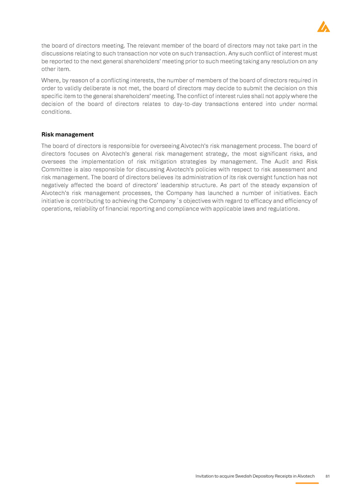 Invitation to acquire Swedish Depository Receipts in Alvotech 81 the board of directors meeting . The relevant member of the board of directors may not take part in the discussions relating to such transaction nor vote on such transaction . Any such conflict of interest must be reported to the next general shareholders' meeting prior to such meeting taking any resolution on any other item . Where, by reason of a conflicting interests, the number of members of the board of directors required in order to validly deliberate is not met, the board of directors may decide to submit the decision on this specific item to the general shareholders' meeting . The conflict of interest rules shall not apply where the decision of the board of directors relates to day - to - day transactions entered into under normal conditions . Risk management The board of directors is responsible for overseeing Alvotech's risk management process . The board of directors focuses on Alvotech's general risk management strategy, the most significant risks, and oversees the implementation of risk mitigation strategies by management . The Audit and Risk Committee is also responsible for discussing Alvotech's policies with respect to risk assessment and risk management . The board of directors believes its administration of its risk oversight function has not negatively affected the board of directors' leadership structure . As part of the steady expansion of Alvotech's risk management processes, the Company has launched a number of initiatives . Each initiative is contributing to achieving the Company Dz s objectives with regard to efficacy and efficiency of operations, reliability of financial reporting and compliance with applicable laws and regulations .