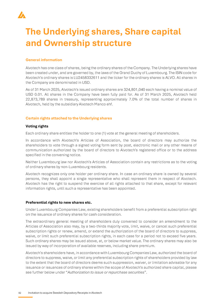 82 Invitation to acquire Swedish Depository Receipts in Alvotech The Underlying shares, Share capital and Ownership structure General information Alvotech has one class of shares, being the ordinary shares of the Company . The Underlying shares have been created under, and are governed by, the laws of the Grand Duchy of Luxembourg . The ISIN code for Alvotech's ordinary shares is LU 2458332611 and the ticker for the ordinary shares is ALVO . All shares in the Company are denominated in USD . As of 31 March 2025 , Alvotech's issued ordinary shares are 324 , 801 , 040 each having a nominal value of USD 0 . 01 . All shares in the Company have been fully paid for . As of 31 March 2025 , Alvotech held 22 , 873 , 789 shares in treasury, representing approximately 7 . 0 % of the total number of shares in Alvotech, held by the subsidiary Alvotech Manco ehf . Certain rights attached to the Underlying shares Voting rights Each ordinary share entitles the holder to one (1) vote at the general meeting of shareholders. In accordance with Alvotech's Articles of Association, the board of directors may authorize the shareholders to vote through a signed voting form sent by post, electronic mail or any other means of communication authorized by the board of directors to Alvotech's registered office or to the address specified in the convening notice . Neither Luxembourg law nor Alvotech's Articles of Association contain any restrictions as to the voting of ordinary shares by non - Luxembourg residents . Alvotech recognizes only one holder per ordinary share . In case an ordinary share is owned by several persons, they shall appoint a single representative who shall represent them in respect of Alvotech . Alvotech has the right to suspend the exercise of all rights attached to that share, except for relevant information rights, until such a representative has been appointed . Preferential rights to new shares etc . Under Luxembourg Companies Law, existing shareholders benefit from a preferential subscription right on the issuance of ordinary shares for cash consideration . The extraordinary general meeting of shareholders duly convened to consider an amendment to the Articles of Association also may, by a two - thirds majority vote, limit, waive, or cancel such preferential subscription rights or renew, amend, or extend the authorization of the board of directors to suppress, waive, or limit such preferential subscription rights, in each case for a period not to exceed five years . Such ordinary shares may be issued above, at, or below market value . The ordinary shares may also be issued by way of incorporation of available reserves, including share premium . Alvotech's shareholders have, in accordance with Luxembourg Companies Law, authorized the board of directors to suppress, waive, or limit any preferential subscription rights of shareholders provided by law to the extent that the board of directors deems such suppression, waiver, or limitation advisable for any issuance or issuances of ordinary shares within the scope of Alvotech's authorized share capital, please see further below under “ Authorization to issue or repurchase securities ” .
