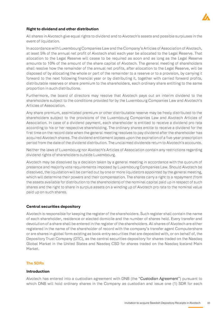Invitation to acquire Swedish Depository Receipts in Alvotech 83 Right to dividend and other distribution All shares in Alvotech give equal rights to dividend and to Alvotech's assets and possible surpluses in the event of liquidation . In accordance with Luxembourg Companies Law and the Company’s Articles of Association of Alvotech, at least 5 % of the annual net profit of Alvotech shall each year be allocated to the Legal Reserve . That allocation to the Legal Reserve will cease to be required as soon and as long as the Legal Reserve amounts to 10 % of the amount of the share capital of Alvotech . The general meeting of shareholders shall resolve how the remainder of the annual net profits, after allocation to the Legal Reserve, will be disposed of by allocating the whole or part of the remainder to a reserve or to a provision, by carrying it forward to the next following financial year or by distributing it, together with carried forward profits, distributable reserves or share premium to the shareholders, each ordinary share entitling to the same proportion in such distributions . Furthermore, the board of directors may resolve that Alvotech pays out an interim dividend to the shareholders subject to the conditions provided for by the Luxembourg Companies Law and Alvotech's Articles of Association . Any share premium, assimilated premium or other distributable reserve may be freely distributed to the shareholders subject to the provisions of the Luxembourg Companies Law and Alvotech Articles of Association . In case of a dividend payment, each shareholder is entitled to receive a dividend pro rata according to his or her respective shareholding . The ordinary shares entitle to receive a dividend for the first time on the record date when the general meeting resolves to pay dividend after the shareholder has acquired Alvotech shares . The dividend entitlement lapses upon the expiration of a five - year prescription period from the date of the dividend distribution . The unclaimed dividends return to Alvotech's accounts . Neither the laws of Luxembourg nor Alvotech's Articles of Association contain any restrictions regarding dividend rights of shareholders outside Luxembourg . Alvotech may be dissolved by a decision taken by a general meeting in accordance with the quorum of presence and majority vote requirements imposed by Luxembourg Companies Law . Should Alvotech be dissolved, the liquidation will be carried out by one or more liquidators appointed by the general meeting, which will determine their powers and their compensation . The shares carry a right to a repayment (from the assets available for distribution to the shareholders) of the nominal capital paid up in respect of such shares and the right to share in surplus assets on a winding up of Alvotech pro rata to the nominal value paid up on such shares . Central securities depository Alvotech is responsible for keeping the register of the shareholders . Such register shall contain the name of each shareholder, residence or elected domicile and the number of shares held . Every transfer and devolution of a share shall be entered in the register of the shareholders . All shares of Alvotech are either registered in the name of the shareholder of record with the company’s transfer agent Computershare or are shares in global form existing as book - entry securities that are deposited with, or on behalf of, the Depository Trust Company (DTC), as the central securities depository for shares traded on the Nasdaq Global Market in the United States and Nasdaq CSD for shares traded on the Nasdaq Iceland Main Market . The SDRs Introduction Alvotech has entered into a custodian agreement with DNB (the “Custodian Agreement”) pursuant to which DNB will hold ordinary shares in the Company as custodian and issue one (1) SDR for each