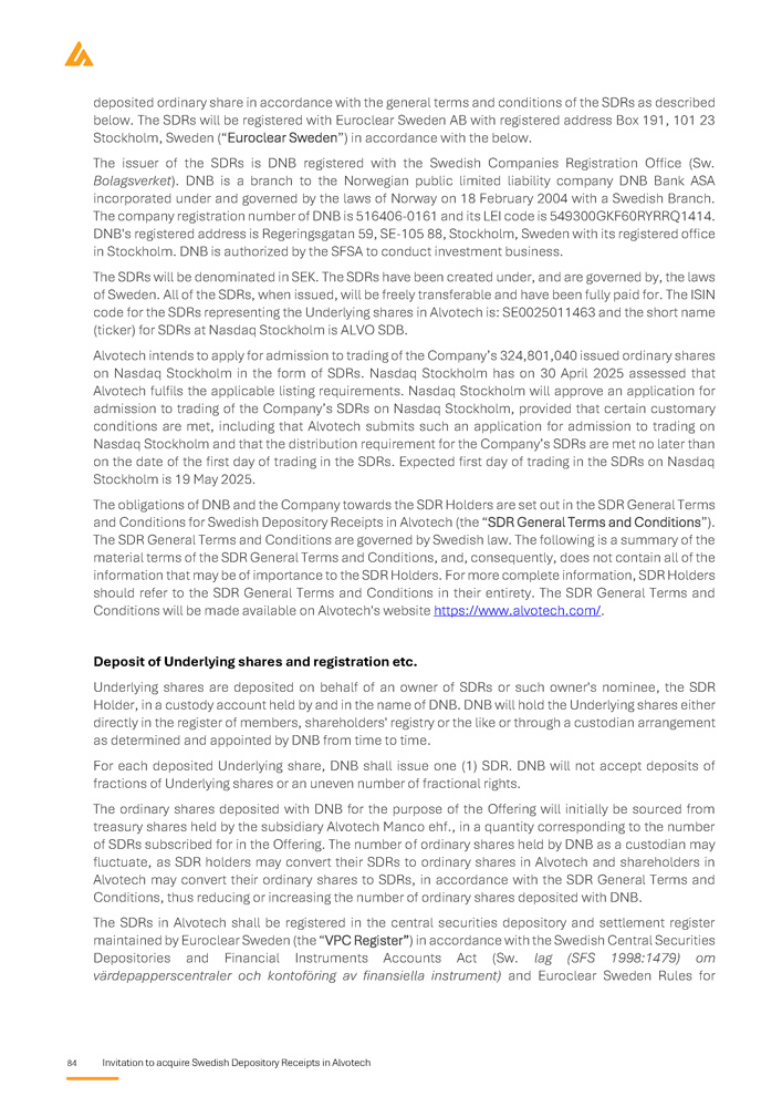 84 Invitation to acquire Swedish Depository Receipts in Alvotech deposited ordinary share in accordance with the general terms and conditions of the SDRs as described below . The SDRs will be registered with Euroclear Sweden AB with registered address Box 191 , 101 23 Stockholm, Sweden (“Euroclear Sweden”) in accordance with the below . The issuer of the SDRs is DNB registered with the Swedish Companies Registration Office (Sw . Bolagsverket ) . DNB is a branch to the Norwegian public limited liability company DNB Bank ASA incorporated under and governed by the laws of Norway on 18 February 2004 with a Swedish Branch . The company registration number of DNB is 516406 - 0161 and its LEI code is 549300 GKF 60 RYRRQ 1414 . DNB's registered address is Regeringsgatan 59 , SE - 105 88 , Stockholm, Sweden with its registered office in Stockholm . DNB is authorized by the SFSA to conduct investment business . The SDRs will be denominated in SEK . The SDRs have been created under, and are governed by, the laws of Sweden . All of the SDRs, when issued, will be freely transferable and have been fully paid for . The ISIN code for the SDRs representing the Underlying shares in Alvotech is : SE 0025011463 and the short name (ticker) for SDRs at Nasdaq Stockholm is ALVO SDB . Alvotech intends to apply for admission to trading of the Company’s 324 , 801 , 040 issued ordinary shares on Nasdaq Stockholm in the form of SDRs . Nasdaq Stockholm has on 30 April 2025 assessed that Alvotech fulfils the applicable listing requirements . Nasdaq Stockholm will approve an application for admission to trading of the Company’s SDRs on Nasdaq Stockholm, provided that certain customary conditions are met, including that Alvotech submits such an application for admission to trading on Nasdaq Stockholm and that the distribution requirement for the Company’s SDRs are met no later than on the date of the first day of trading in the SDRs . Expected first day of trading in the SDRs on Nasdaq Stockholm is 19 May 2025 . The obligations of DNB and the Company towards the SDR Holders are set out in the SDR General Terms and Conditions for Swedish Depository Receipts in Alvotech (the “SDR General Terms and Conditions”) . The SDR General Terms and Conditions are governed by Swedish law . The following is a summary of the material terms of the SDR General Terms and Conditions, and, consequently, does not contain all of the information that may be of importance to the SDR Holders . For more complete information, SDR Holders should refer to the SDR General Terms and Conditions in their entirety . The SDR General Terms and Conditions will be made available on Alvotech's website https : //www . alvotech . com/ . Deposit of Underlying shares and registration etc . Underlying shares are deposited on behalf of an owner of SDRs or such owner's nominee, the SDR Holder, in a custody account held by and in the name of DNB . DNB will hold the Underlying shares either directly in the register of members, shareholders' registry or the like or through a custodian arrangement as determined and appointed by DNB from time to time . For each deposited Underlying share, DNB shall issue one ( 1 ) SDR . DNB will not accept deposits of fractions of Underlying shares or an uneven number of fractional rights . The ordinary shares deposited with DNB for the purpose of the Offering will initially be sourced from treasury shares held by the subsidiary Alvotech Manco ehf . , in a quantity corresponding to the number of SDRs subscribed for in the Offering . The number of ordinary shares held by DNB as a custodian may fluctuate, as SDR holders may convert their SDRs to ordinary shares in Alvotech and shareholders in Alvotech may convert their ordinary shares to SDRs, in accordance with the SDR General Terms and Conditions, thus reducing or increasing the number of ordinary shares deposited with DNB . The SDRs in Alvotech shall be registered in the central securities depository and settlement register maintained by Euroclear Sweden (the “VPC Register”) in accordance with the Swedish Central Securities Depositories and Financial Instruments Accounts Act (Sw . lag (SFS 1998 : 1479 ) om värdepapperscentraler och kontoföring av finansiella instrument) and Euroclear Sweden Rules for